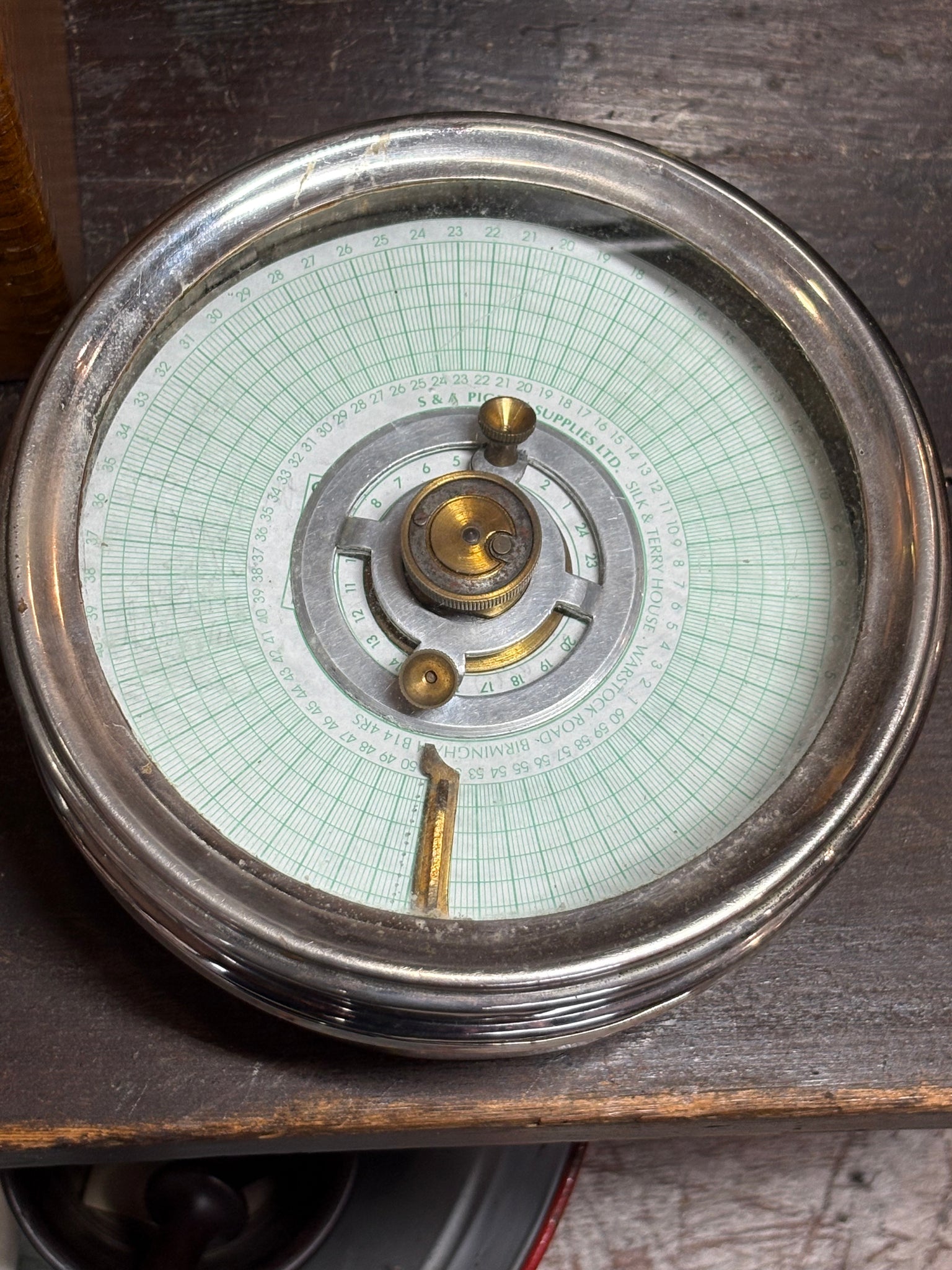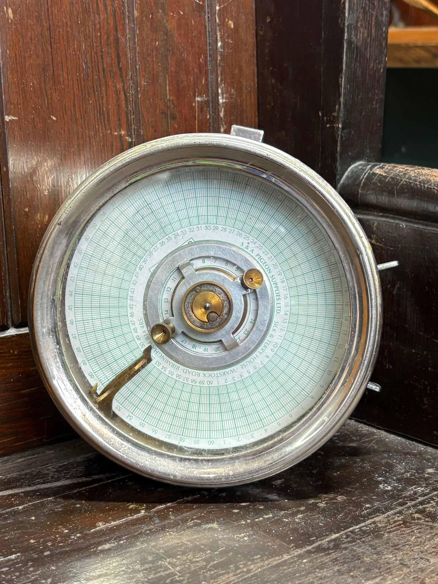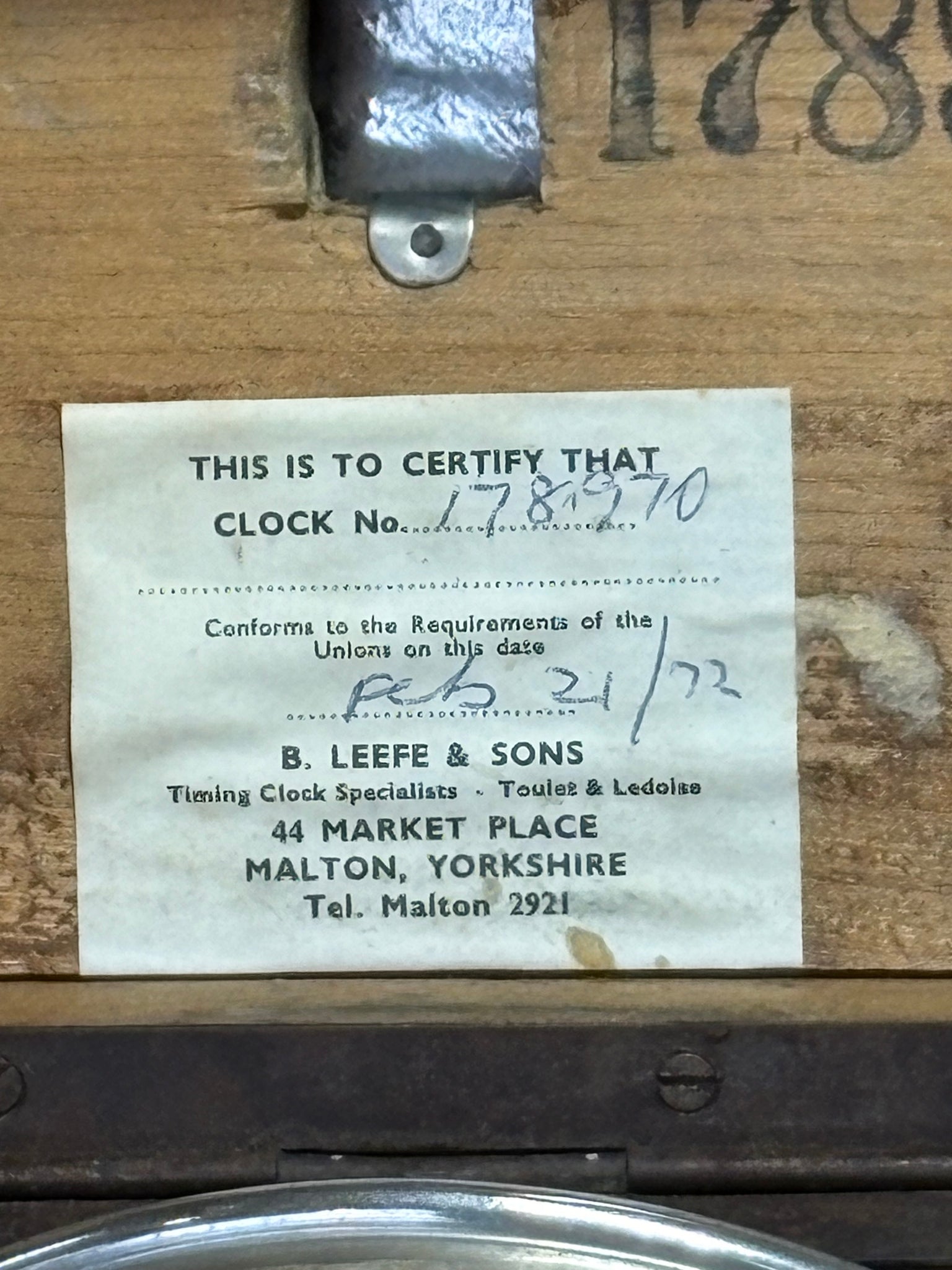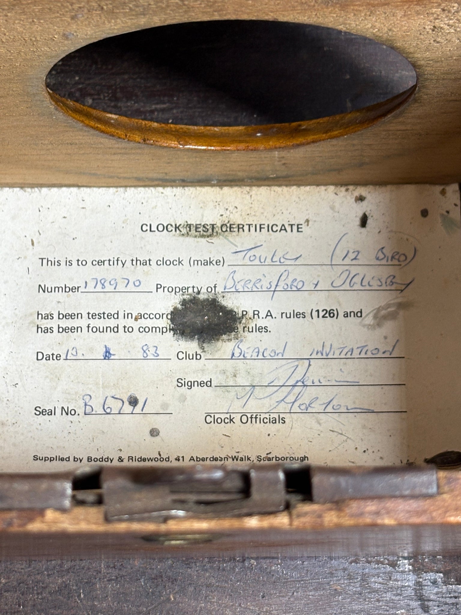 The interior still holds its 1970s paper charts and certification labels dated 1972 and 1983, confirming official testing and regulation compliance. The polished metal clock mechanism is beautifully engineered and stamped S & A Pigeon Supplies Ltd, Birmingham.