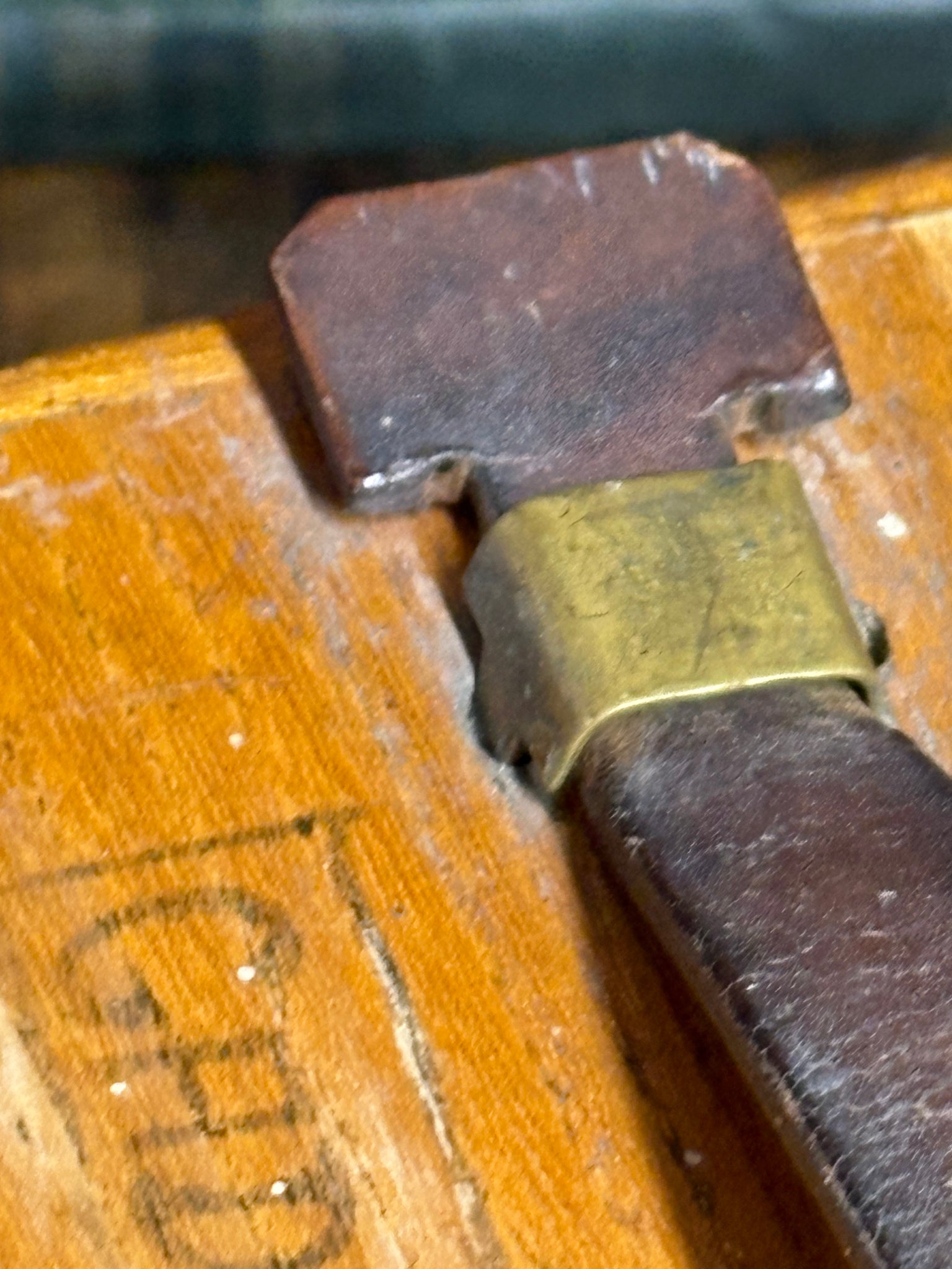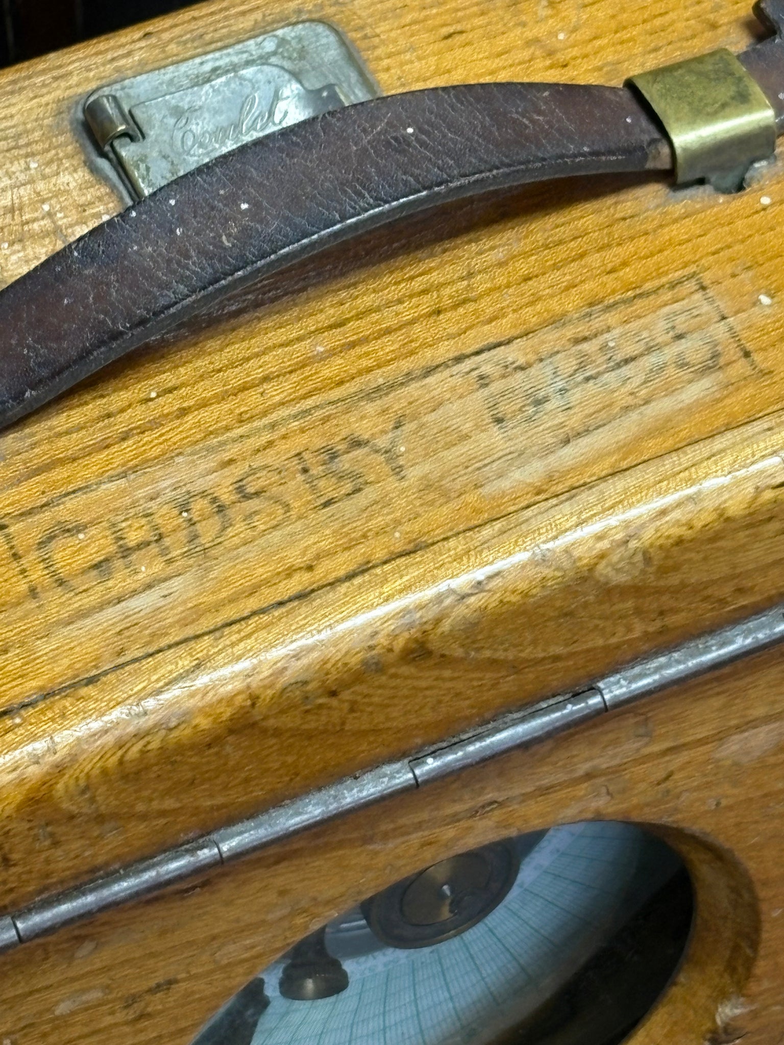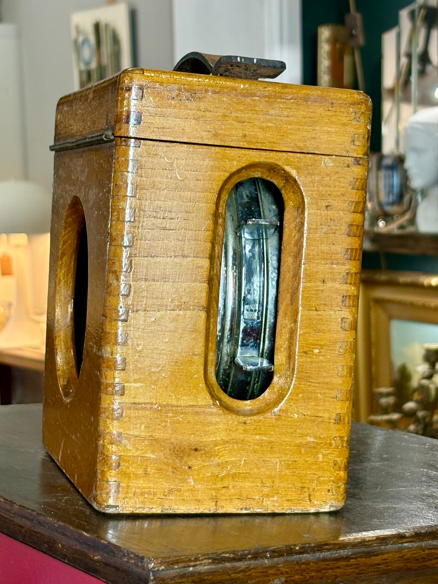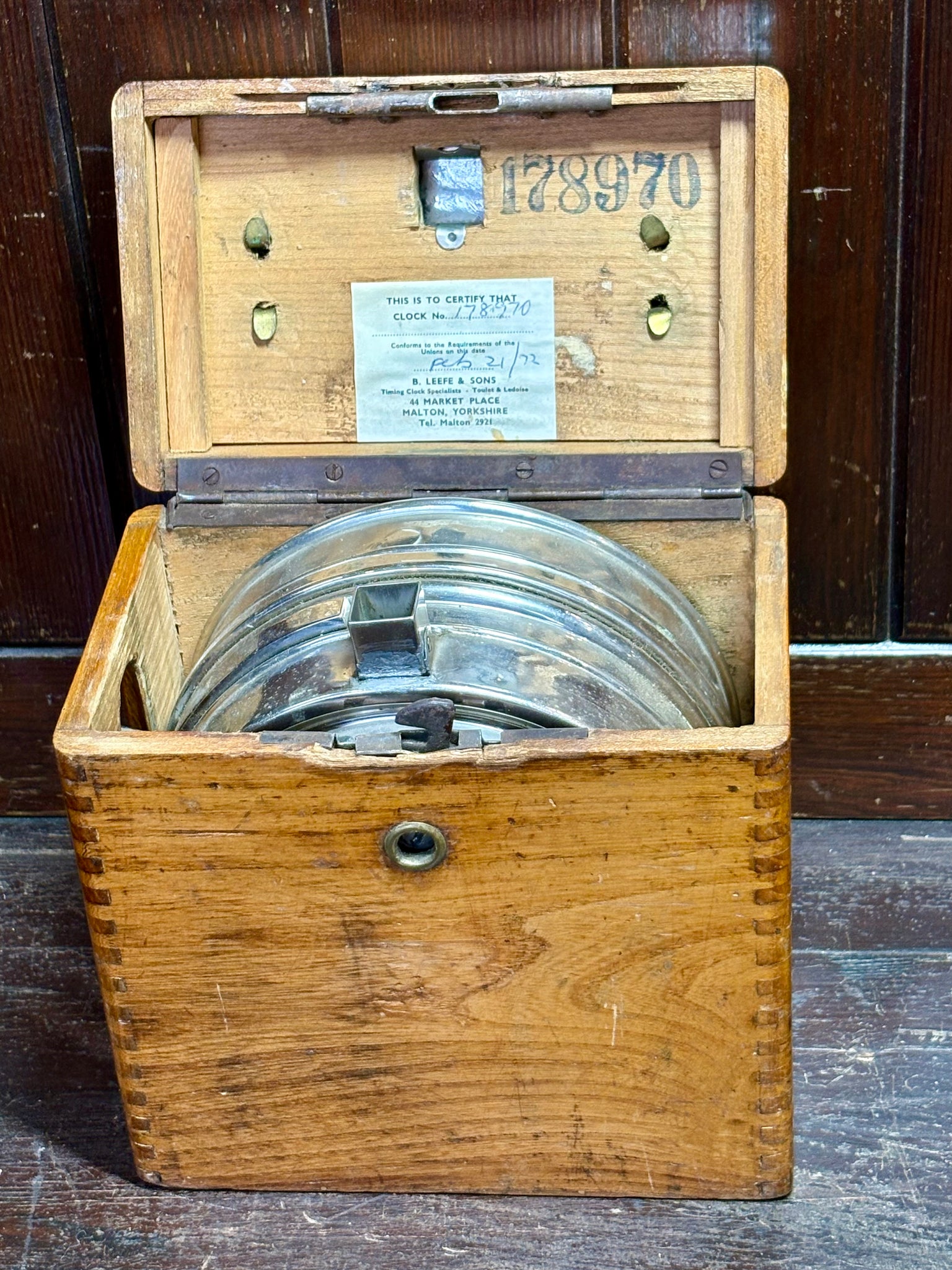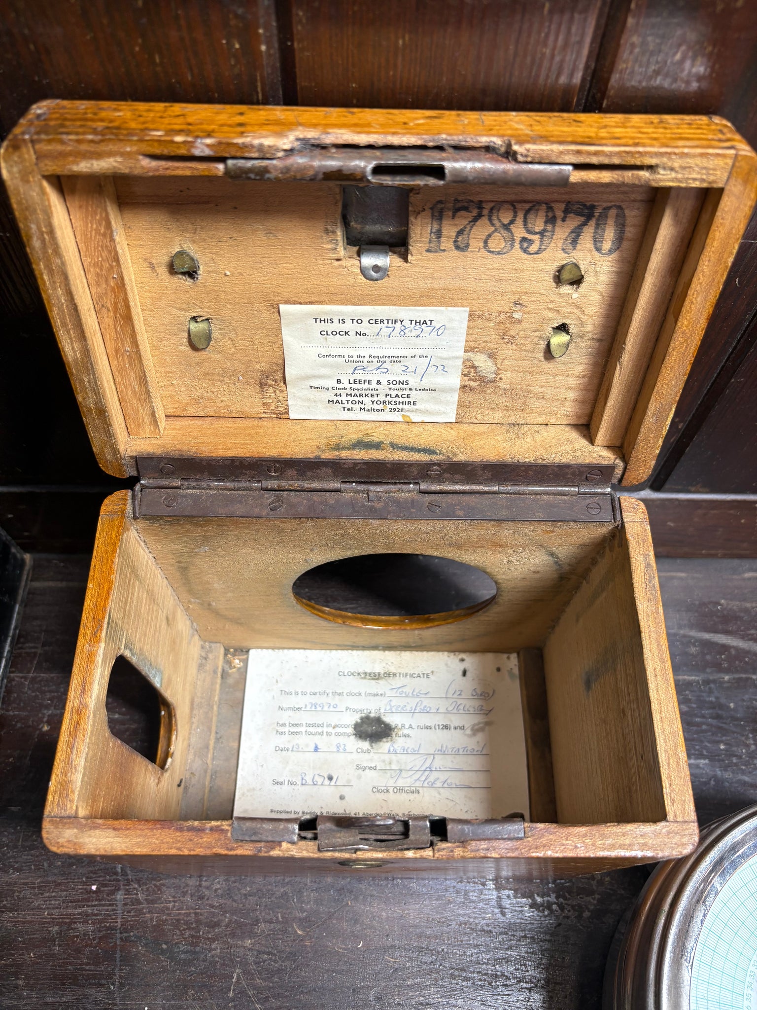 Housed in its dovetail-jointed wooden box with a stitched leather handle and glass viewing window, this clock was used to record racing pigeon times with precision and integrity.