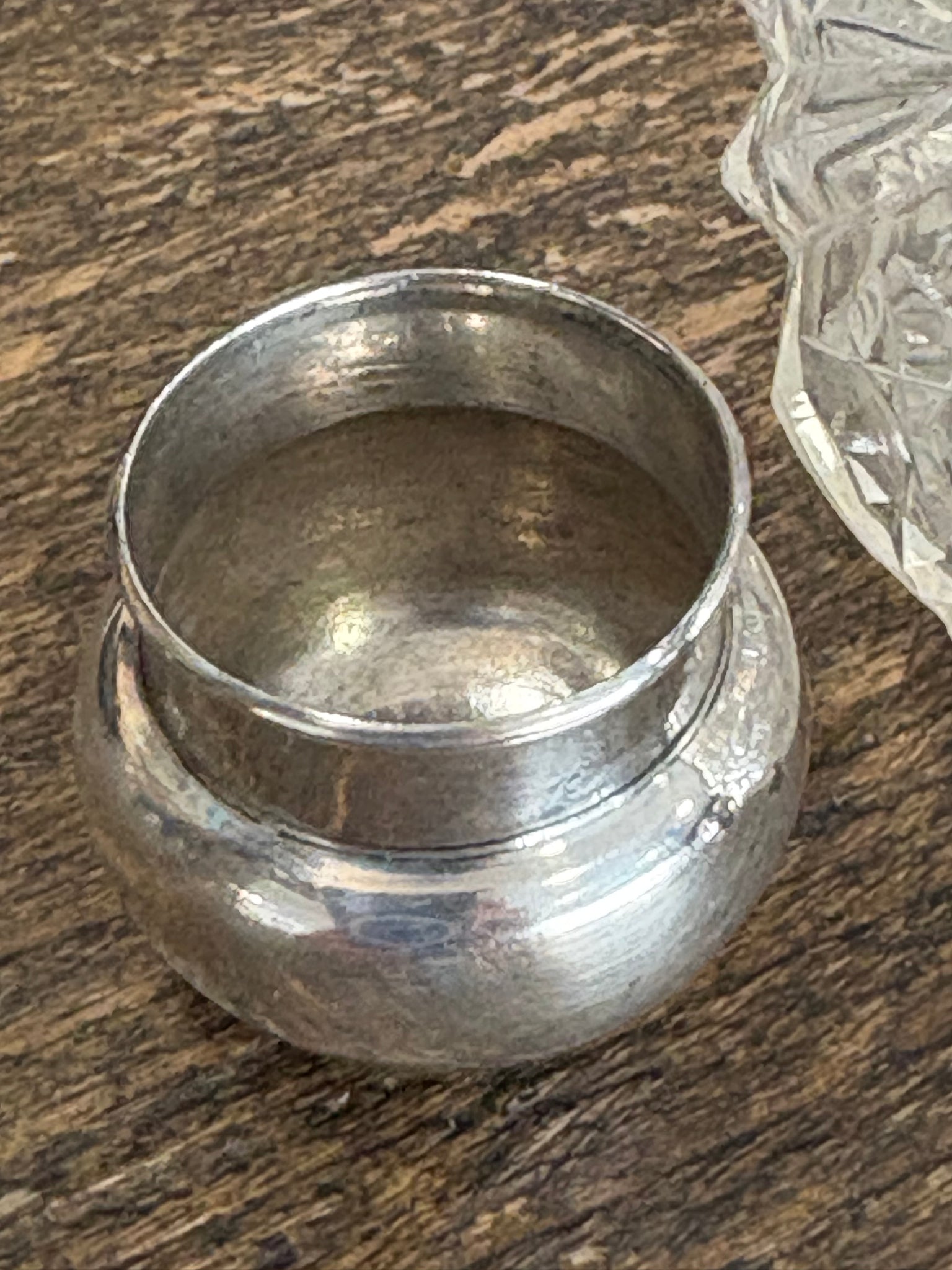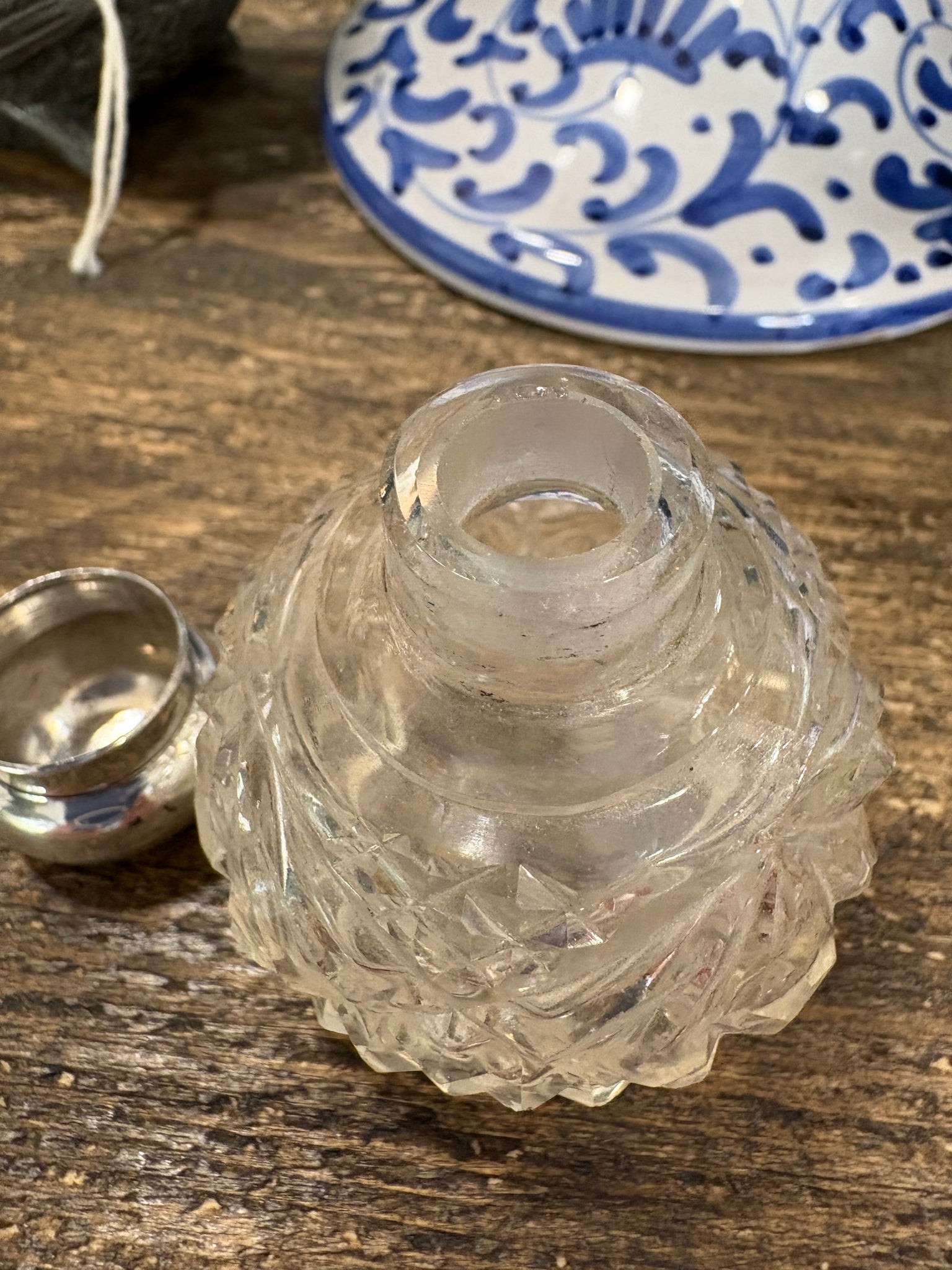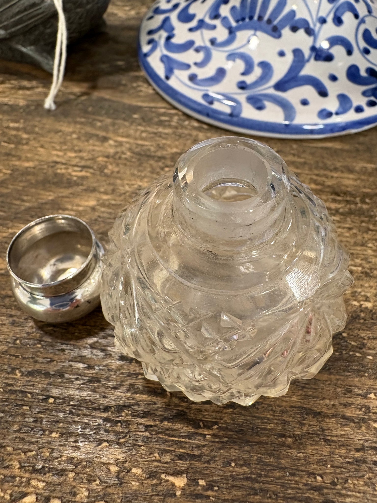 A small but beautiful Edwardian silver and crystal scent bottle, hallmarked Birmingham, 1908, during the reign of King Edward VII. The cut crystal body catches the light with faceted brilliance, while the sterling silver top adds a refined touch of elegance.