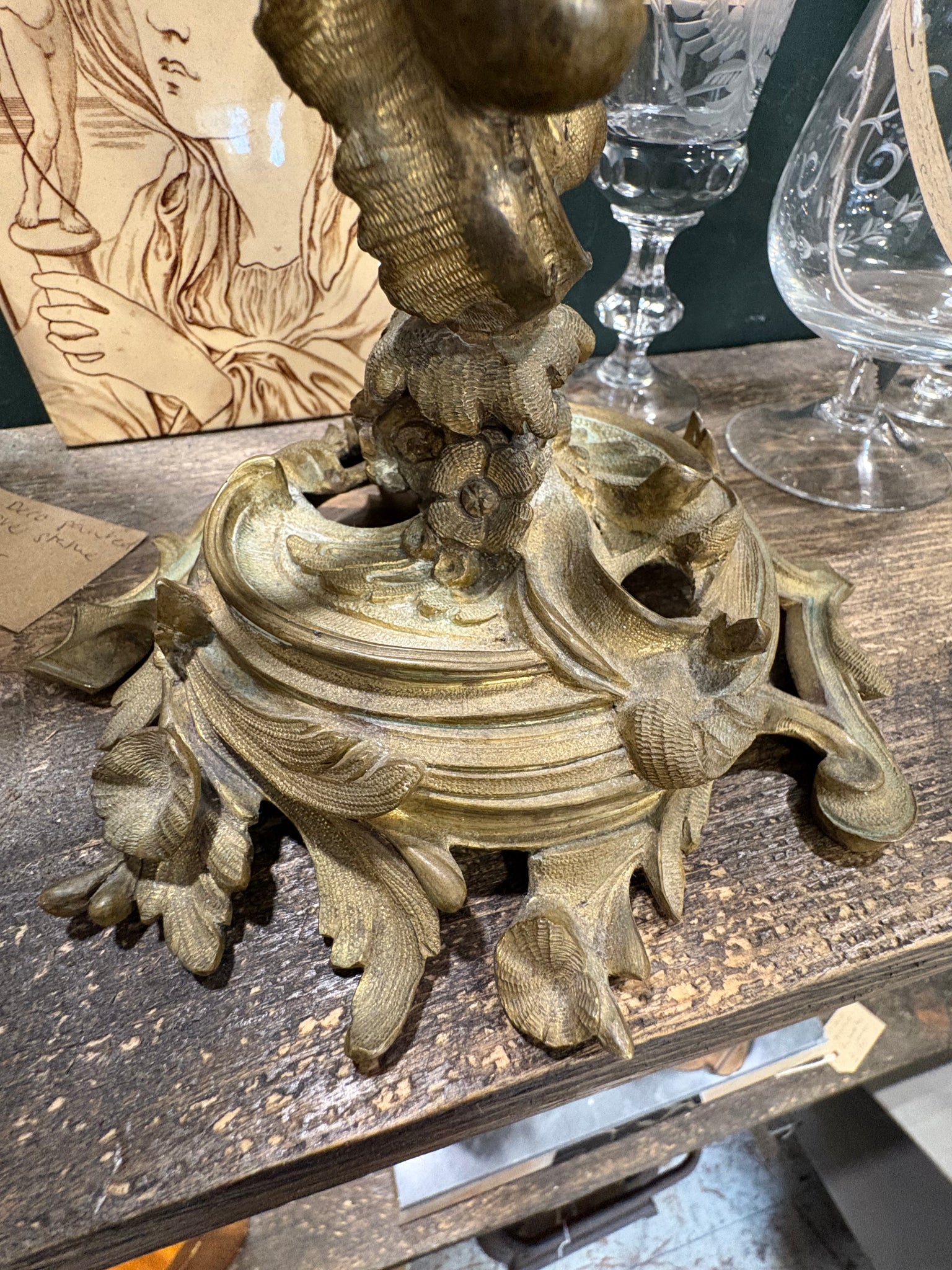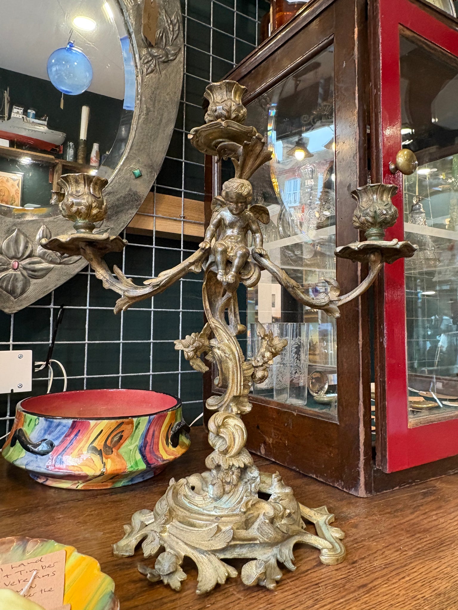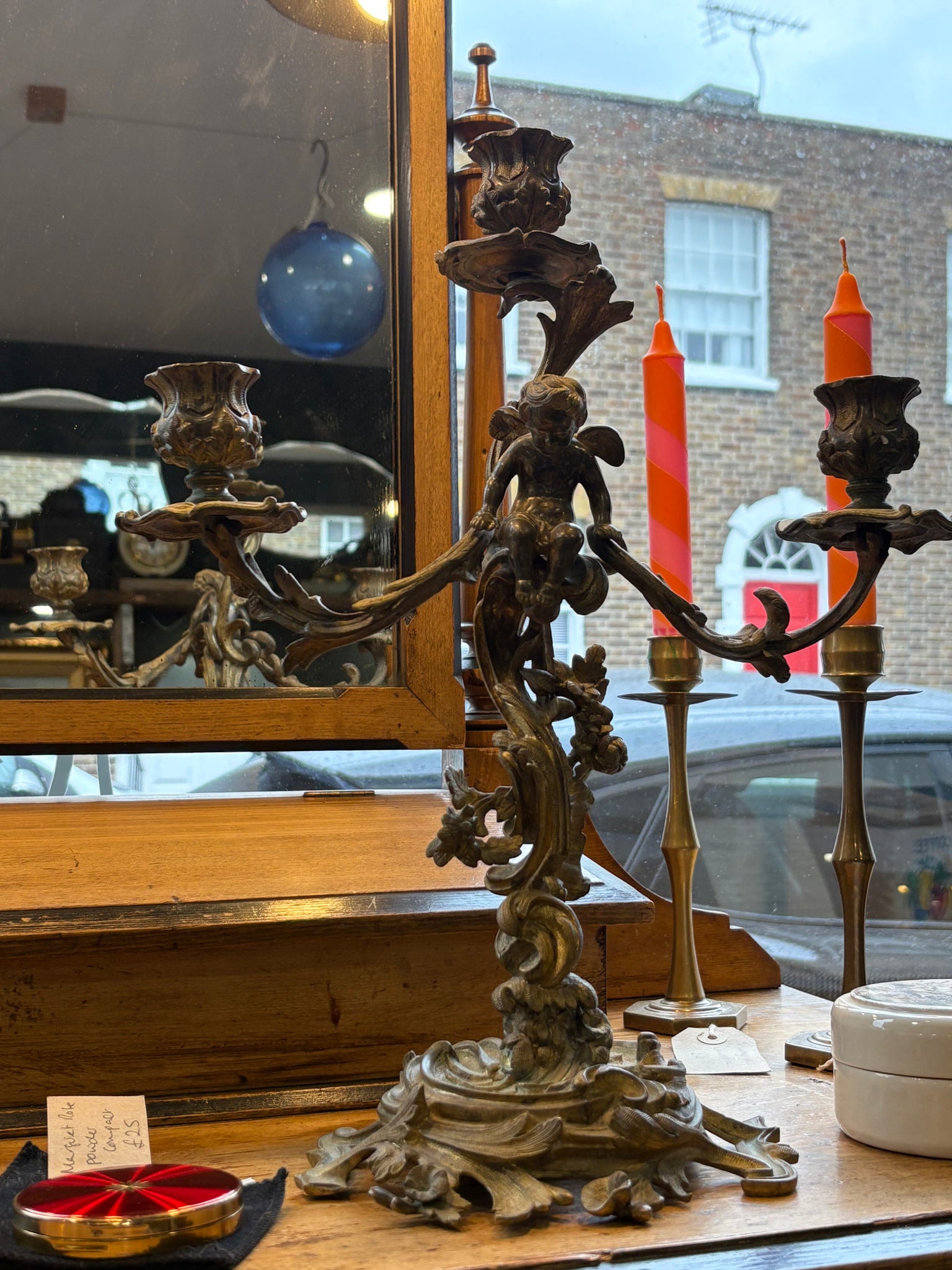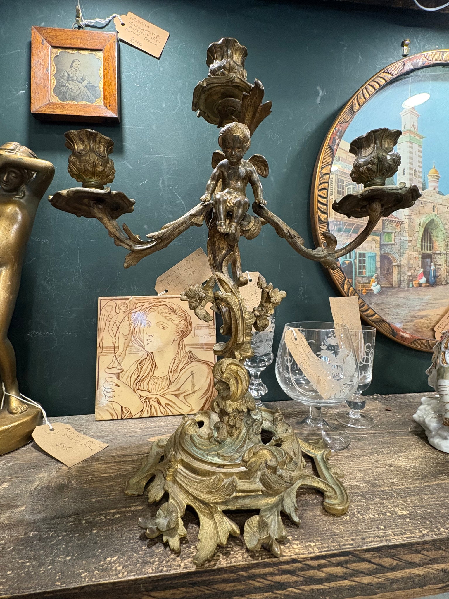 Antique Rococo Style Brass Candelabra with Cherub – Three-Armed