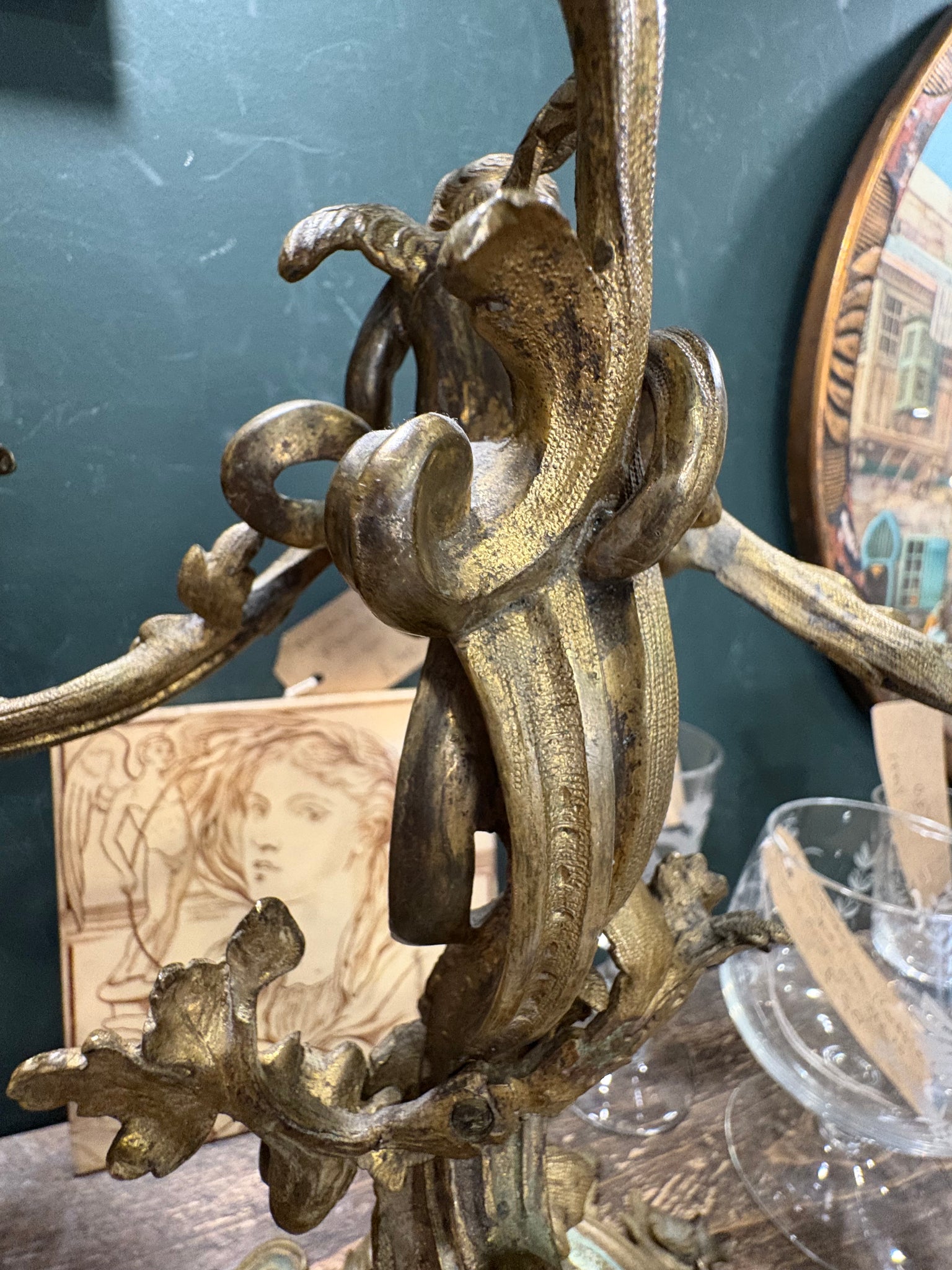 A striking antique three-armed brass candelabra in the Rococo style, richly decorated with floral motifs and a central cherub figure. Likely dating from the late Victorian or early 20th century but inspired by the grand Baroque designs of the 1700s, this piece makes a dramatic centrepiece.