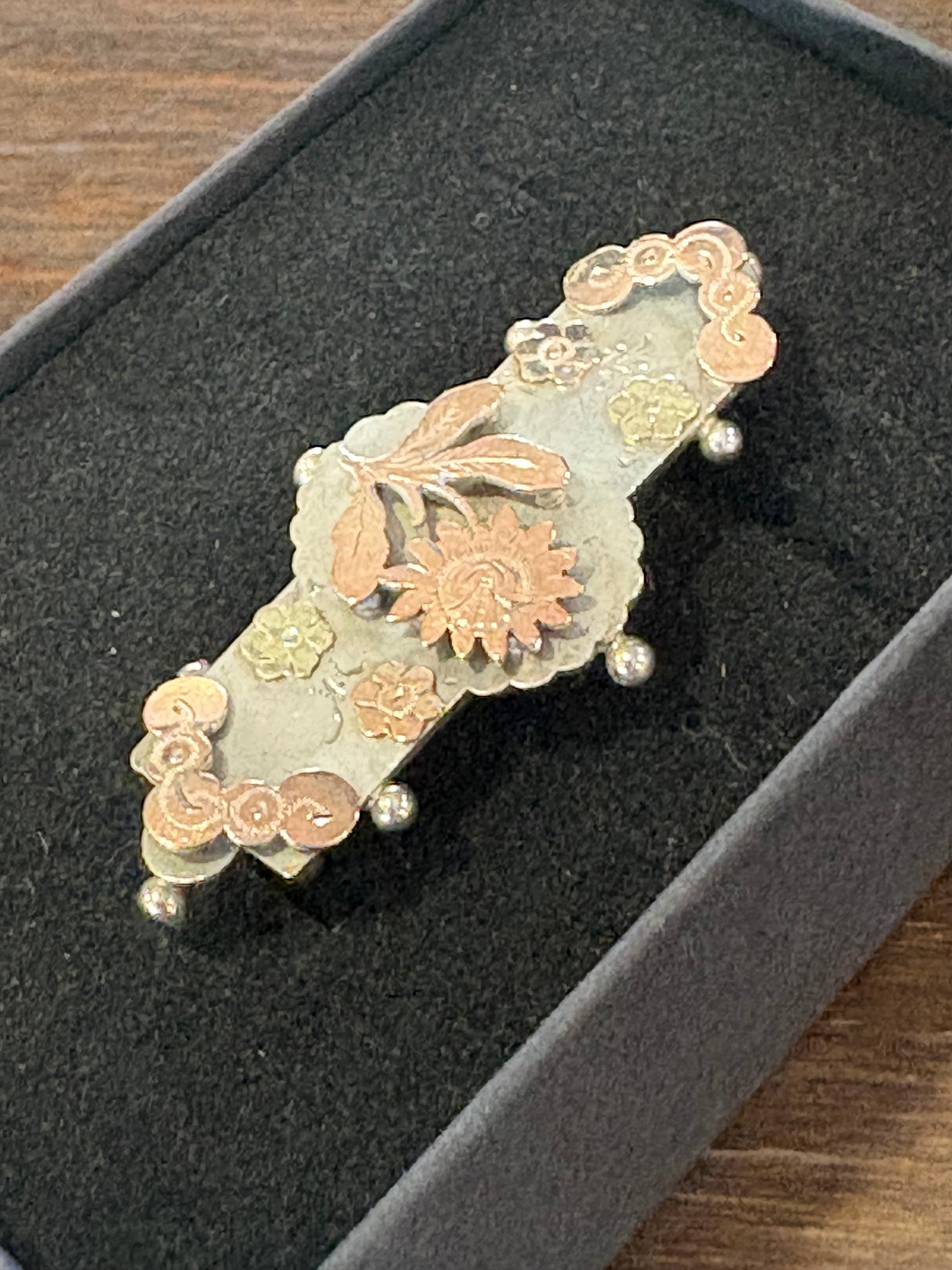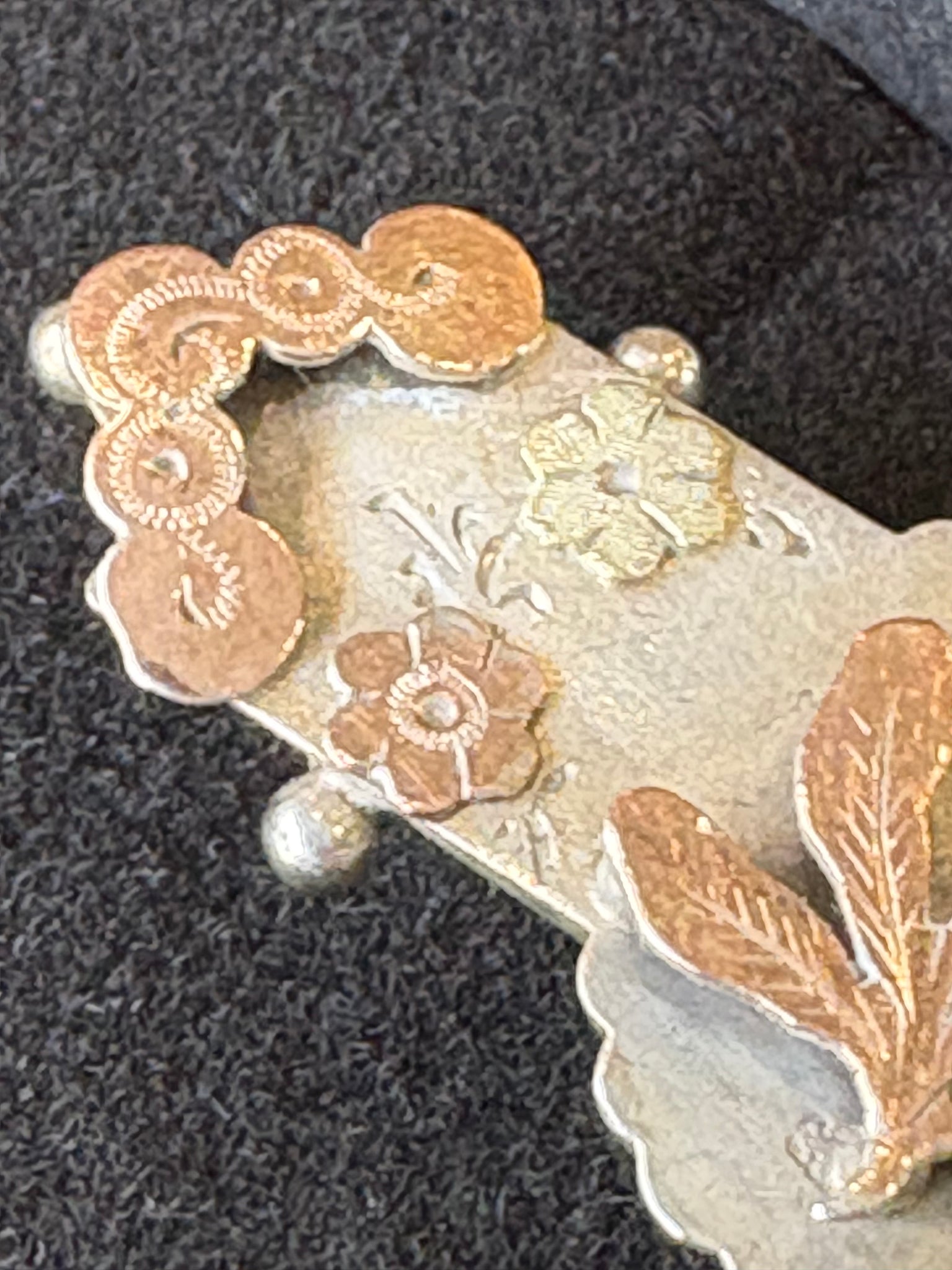 A beautiful Victorian brooch crafted in sterling silver and delicately decorated with applied gold floral motifs. Fully hallmarked for Birmingham, 1886 (date letter m), with visible maker’s marks on the reverse. This charming piece reflects the intricate detail and craftsmanship of late 19th-century jewellery design.