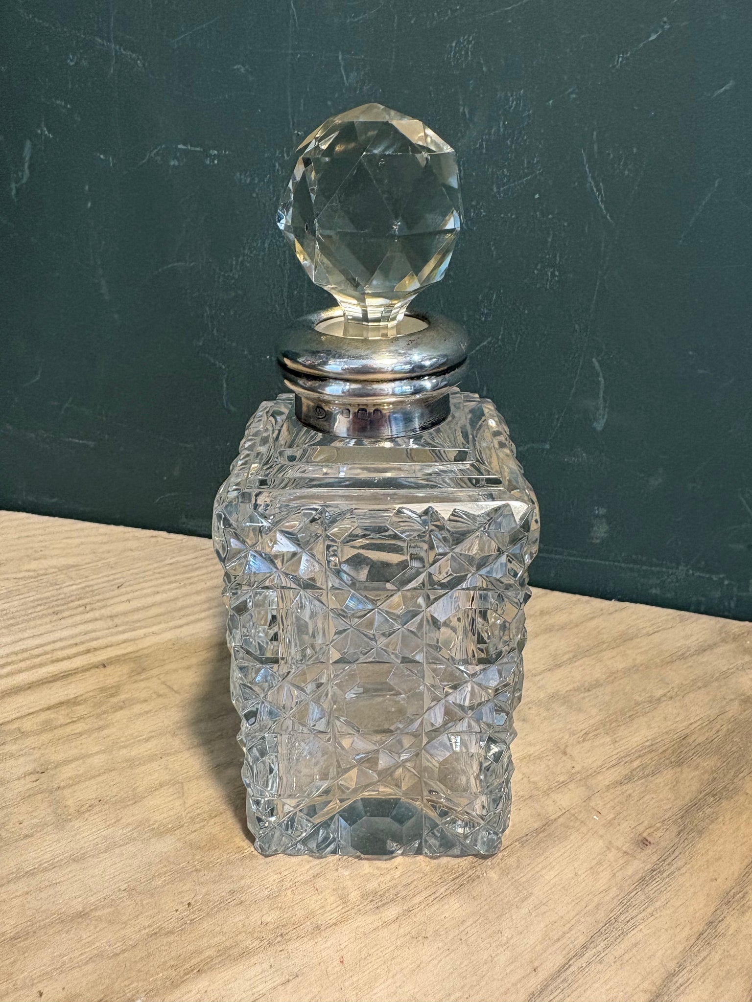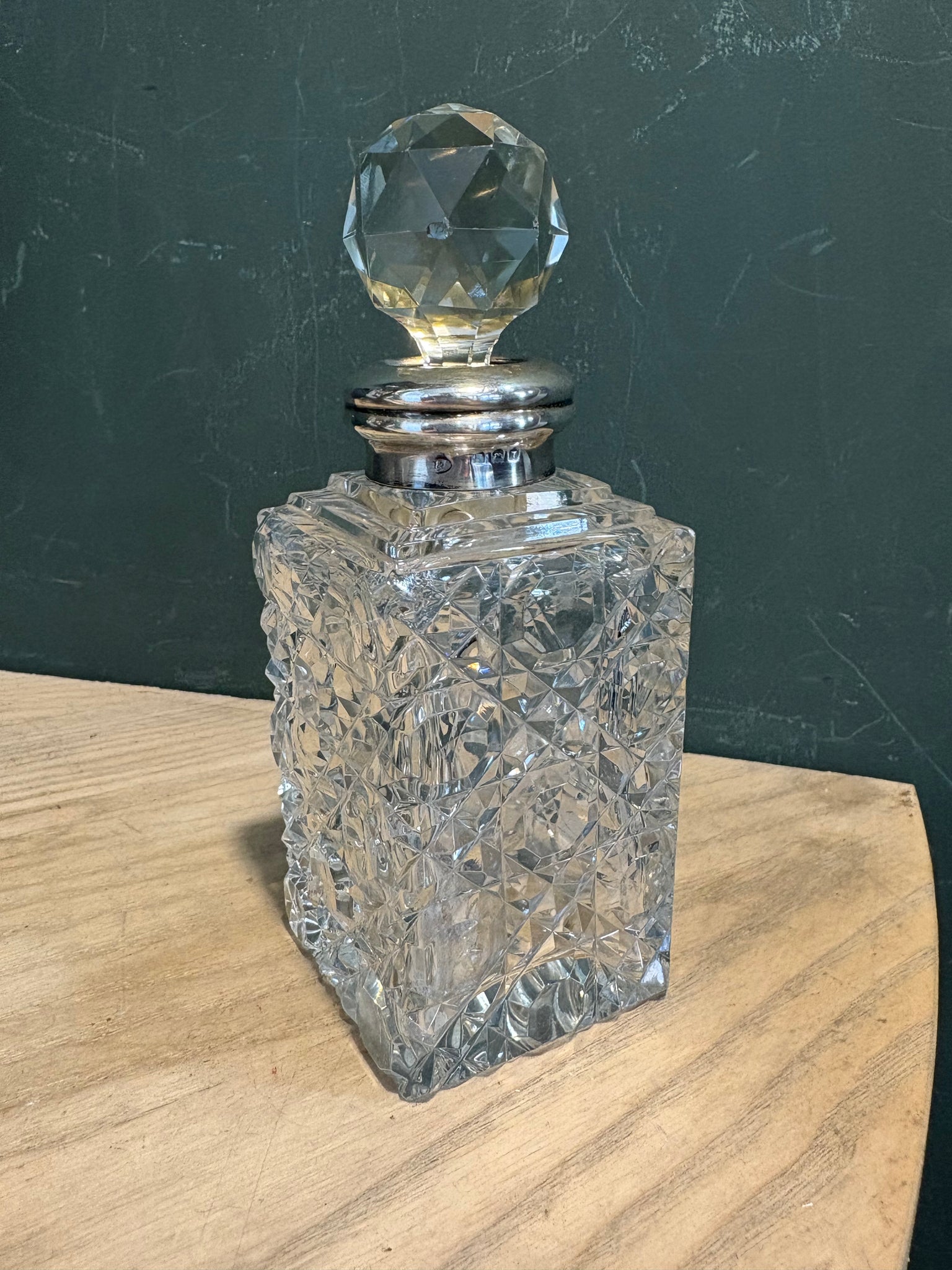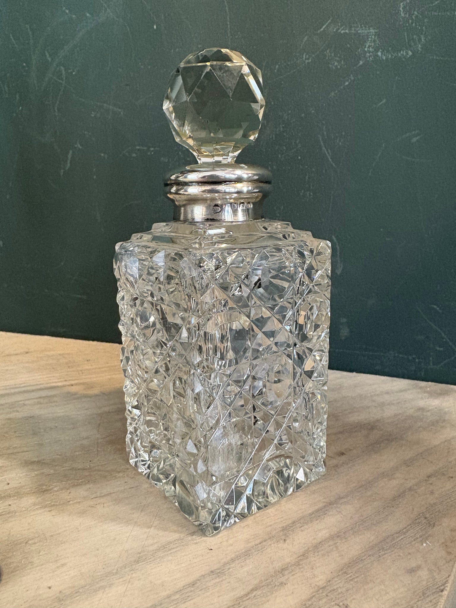 A beautifully cut Art Deco glass scent bottle with a faceted stopper and a silver-mounted collar, fully hallmarked. The geometric cutting catches the light wonderfully, giving it that classic 1930s sparkle. The silver mount is clearly stamped and sits securely, and the stopper fits snugly.