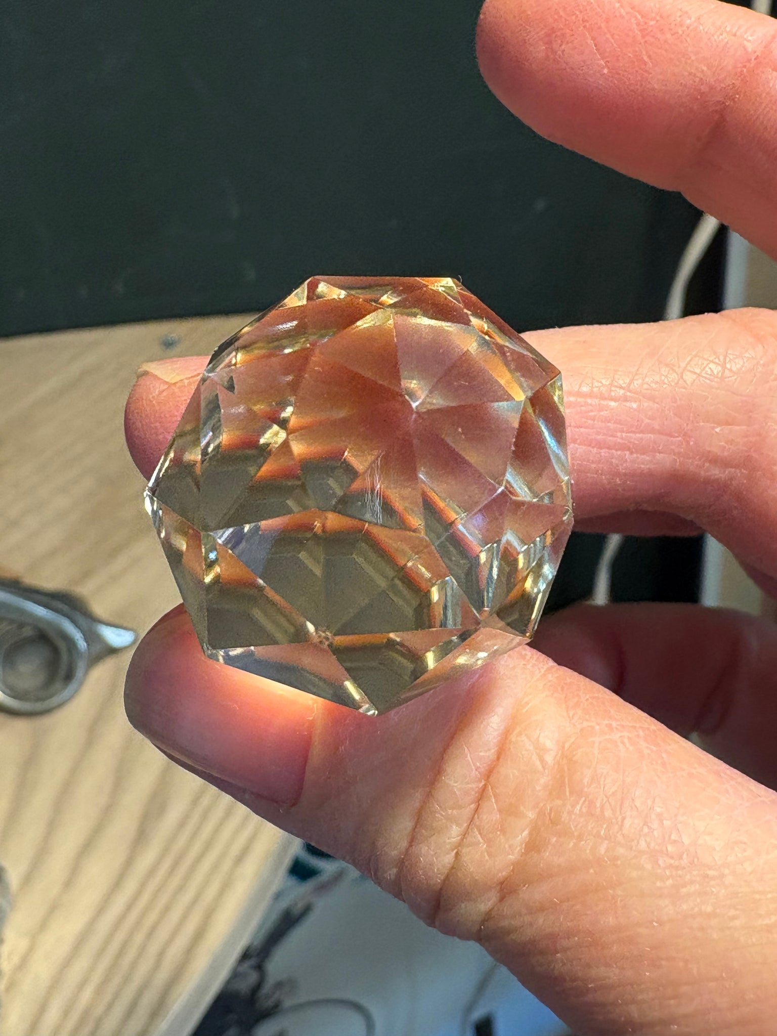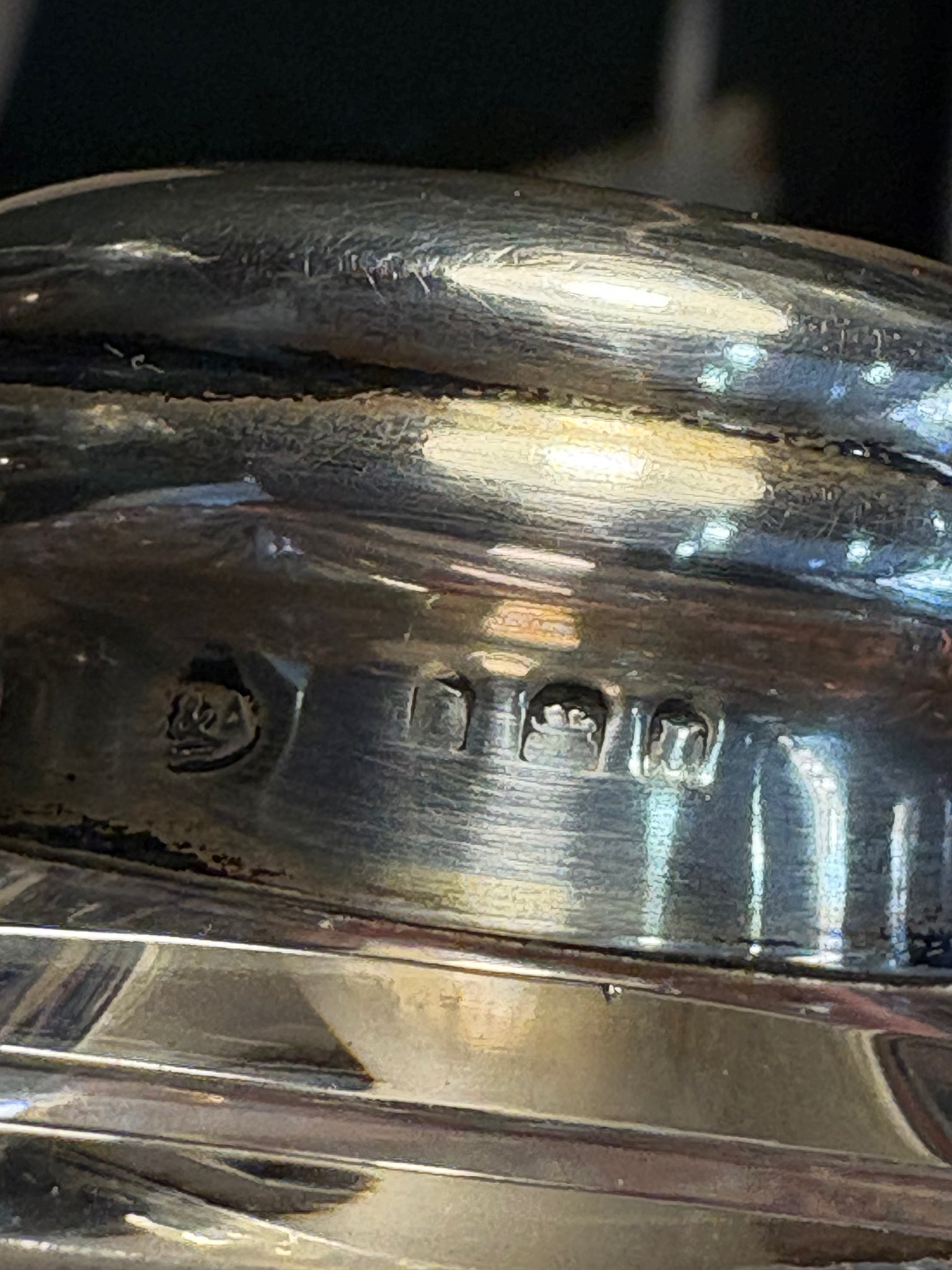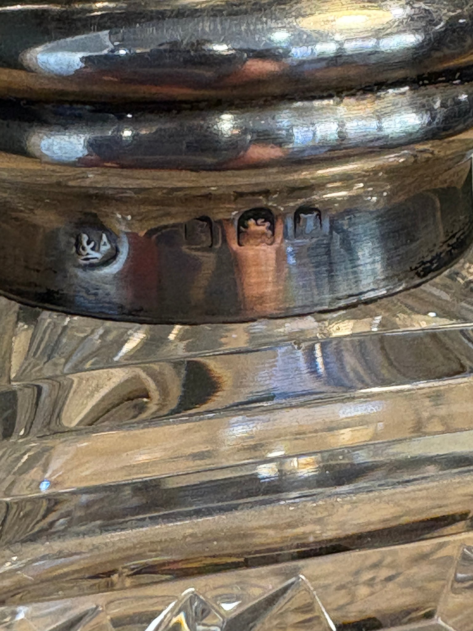 A beautifully cut Art Deco glass scent bottle with a faceted stopper and a silver-mounted collar, fully hallmarked. The geometric cutting catches the light wonderfully, giving it that classic 1930s sparkle. The silver mount is clearly stamped and sits securely, and the stopper fits snugly.