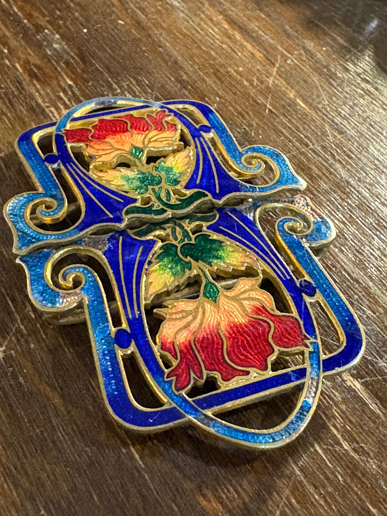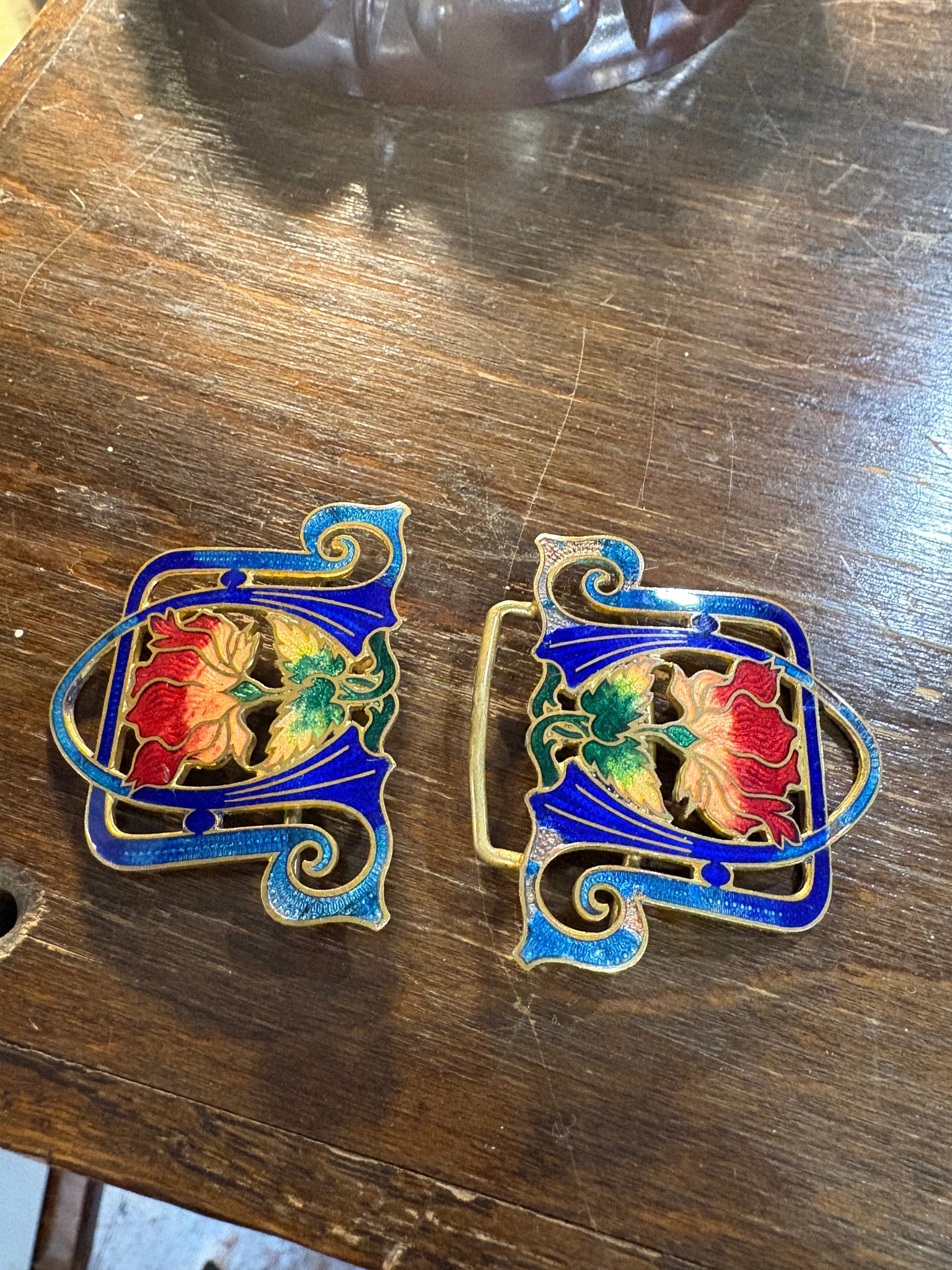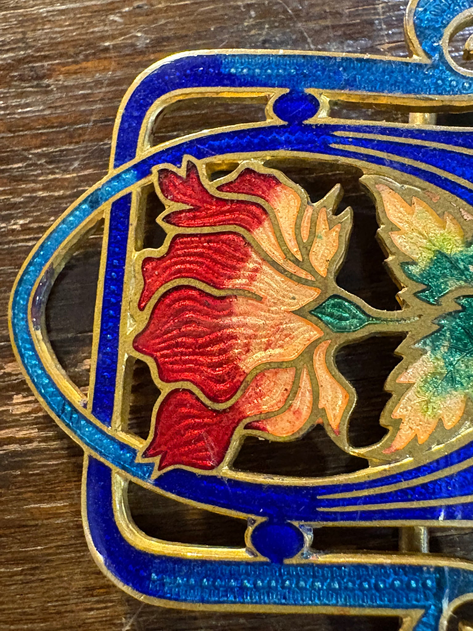 A beautiful Art Nouveau two-part belt buckle, made in brass and richly enamelled in deep blues, reds, pinks and greens. The flowing scrollwork and stylised flowers are classic late-19th-century design, full of movement and colour.