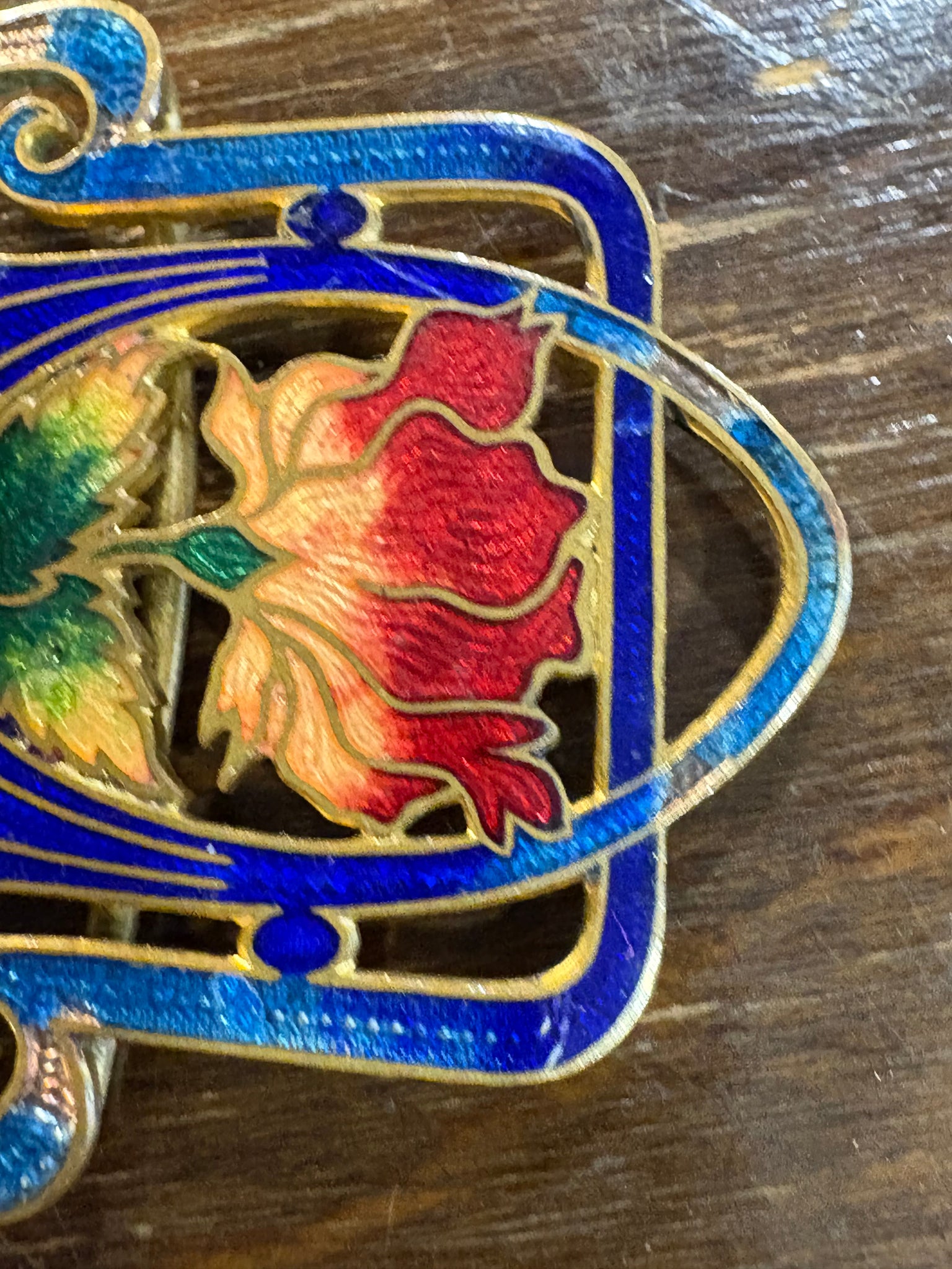 The brass has a lovely aged sheen, and the enamelling still shows fine, vibrant tones, with a few tiny losses that sit naturally with age. The clasp works smoothly and both pieces meet cleanly.
