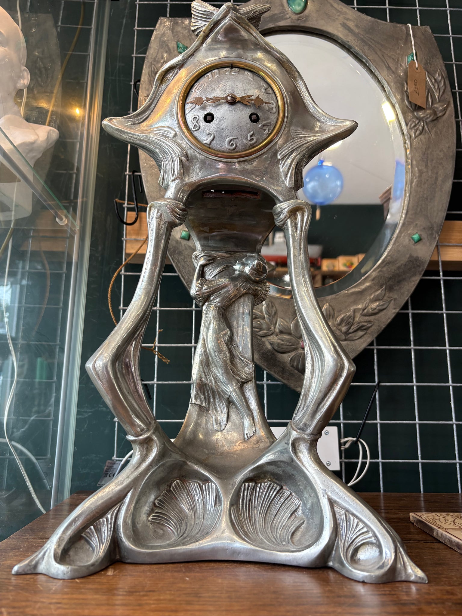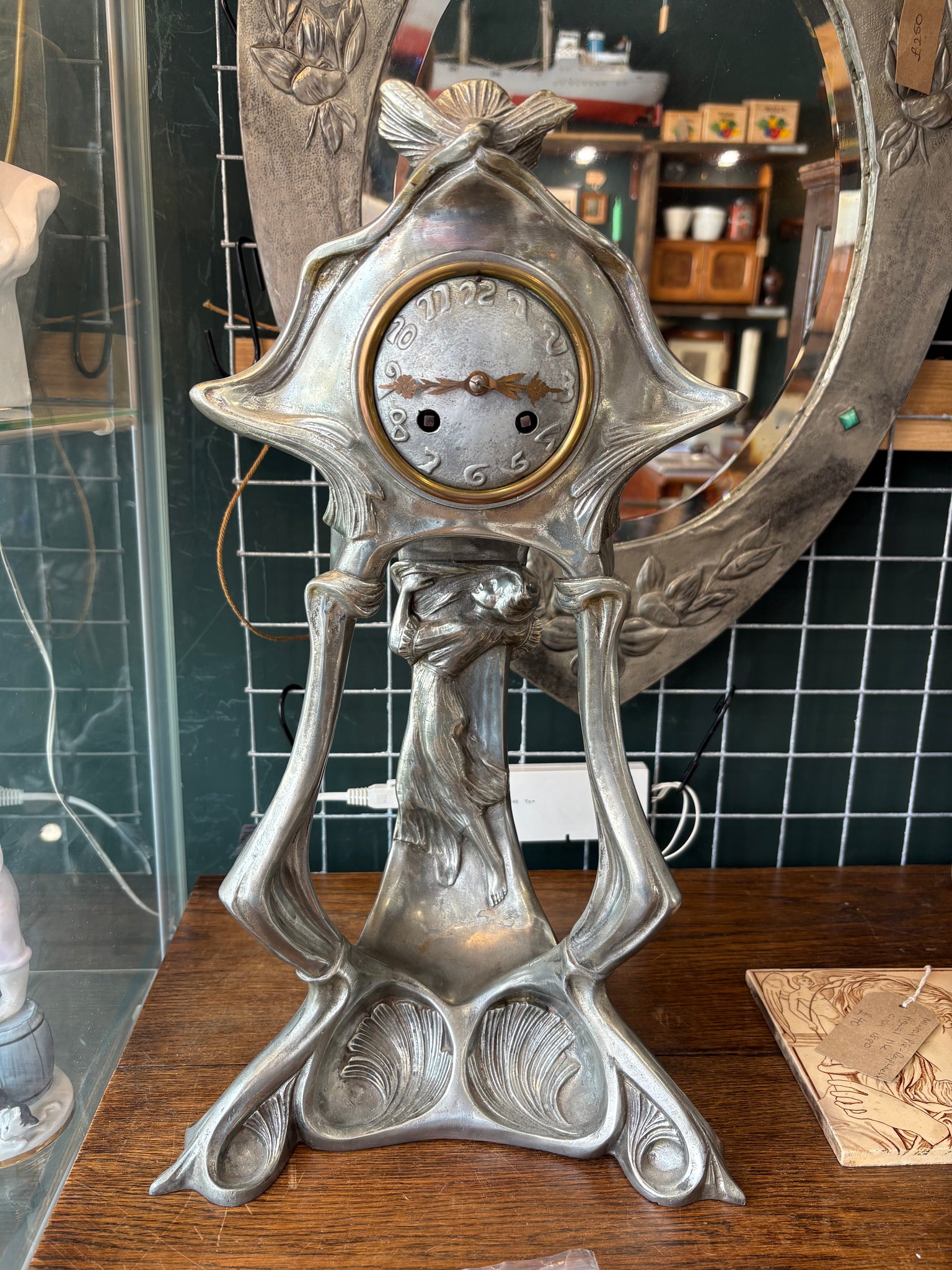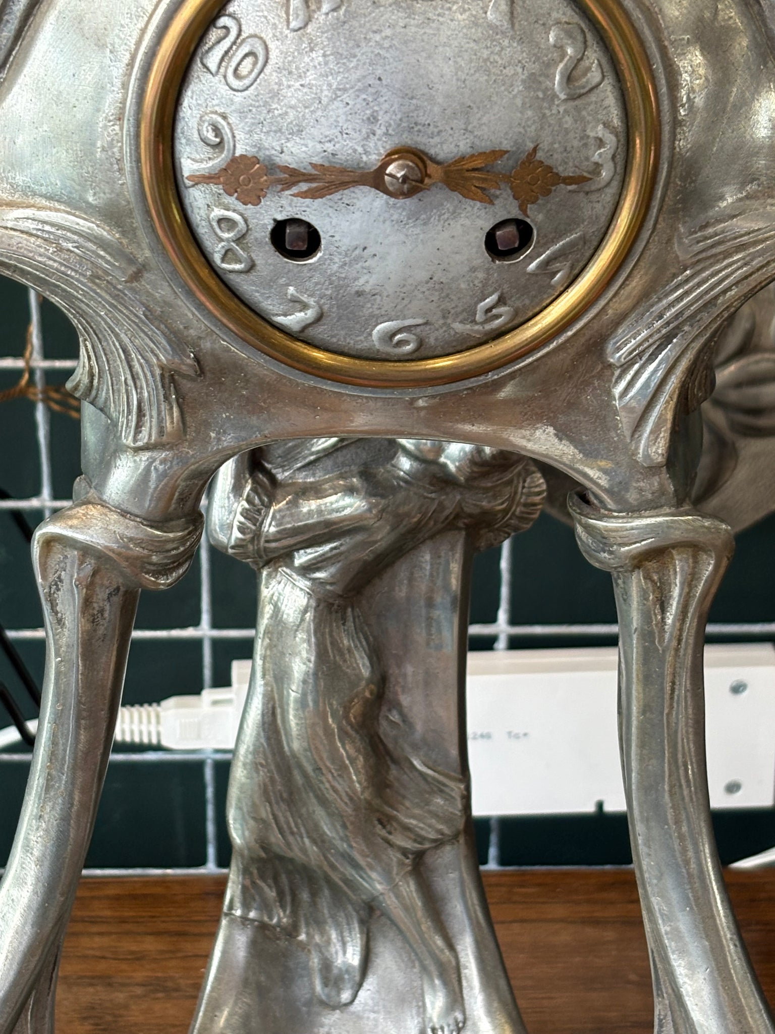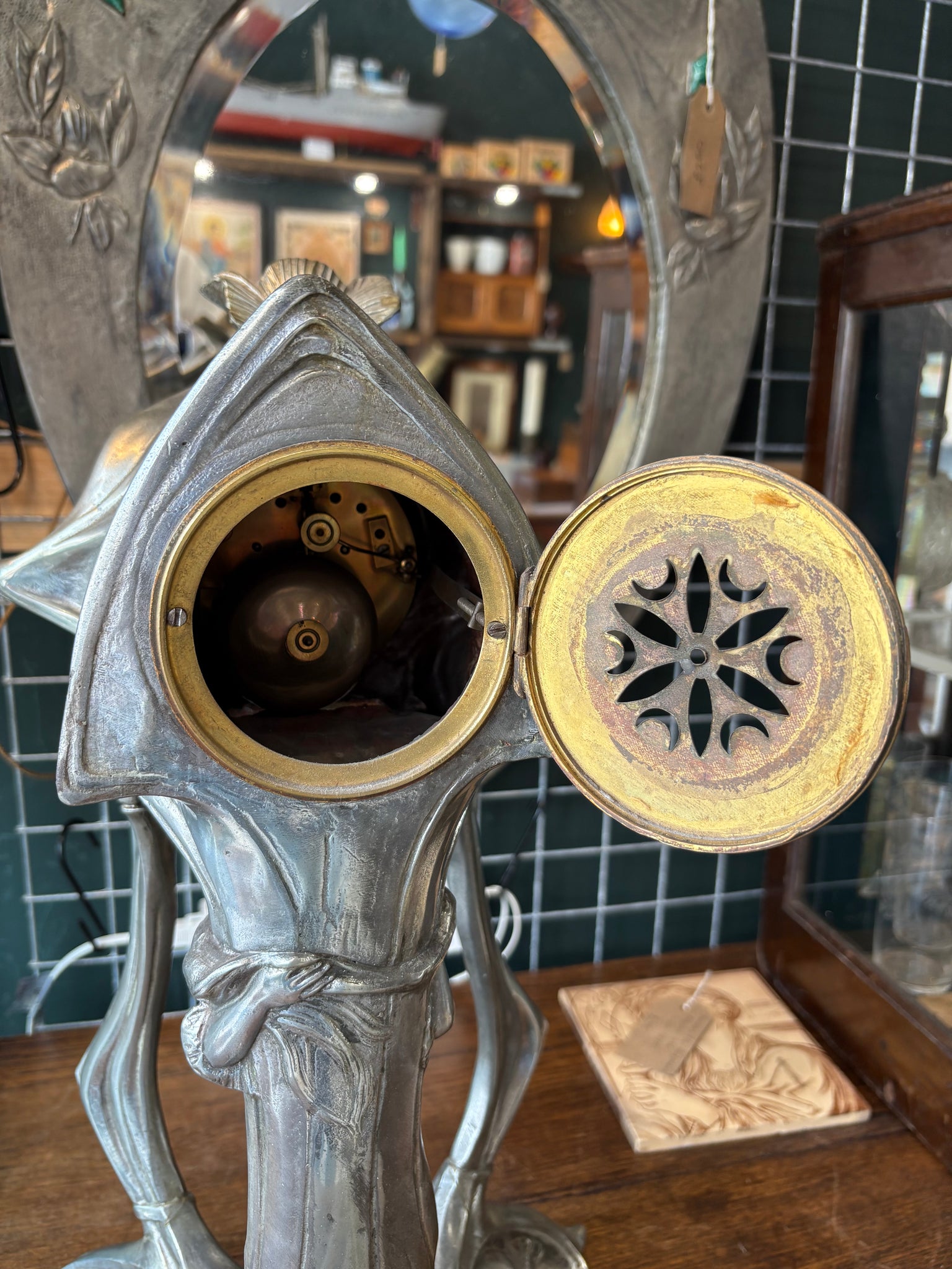 This striking Art Nouveau mantel clock combines elegant design with fine German clockmaking. The silvered spelter case is decorated with flowing organic lines and a draped female figure, capturing the distinctive style of the period.