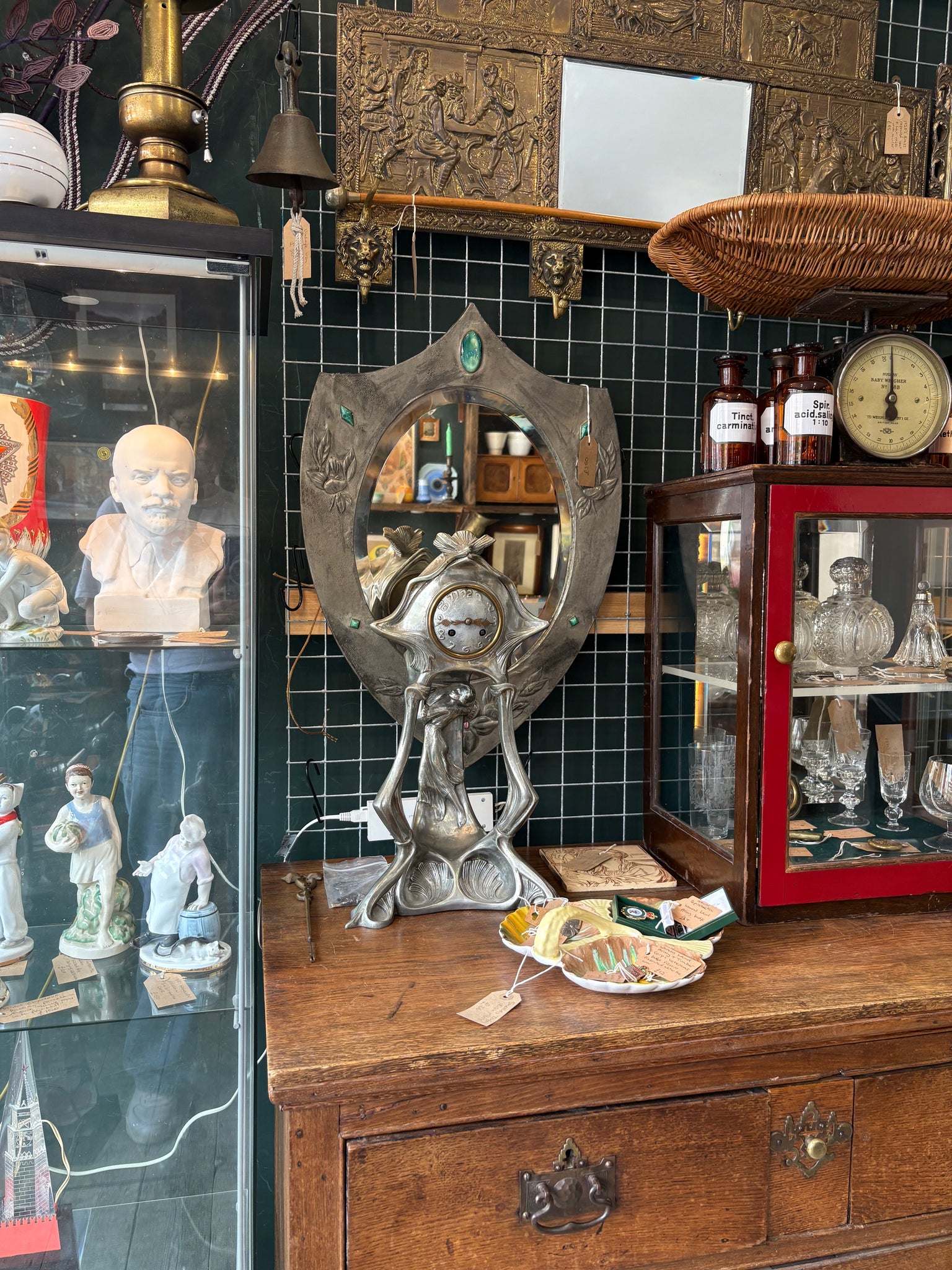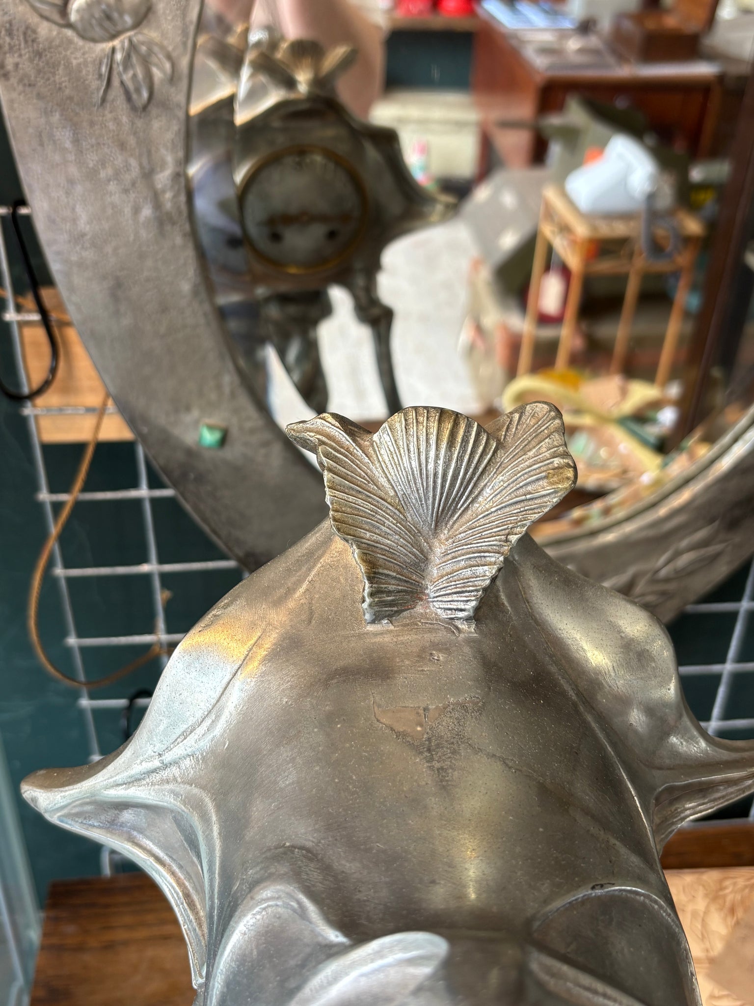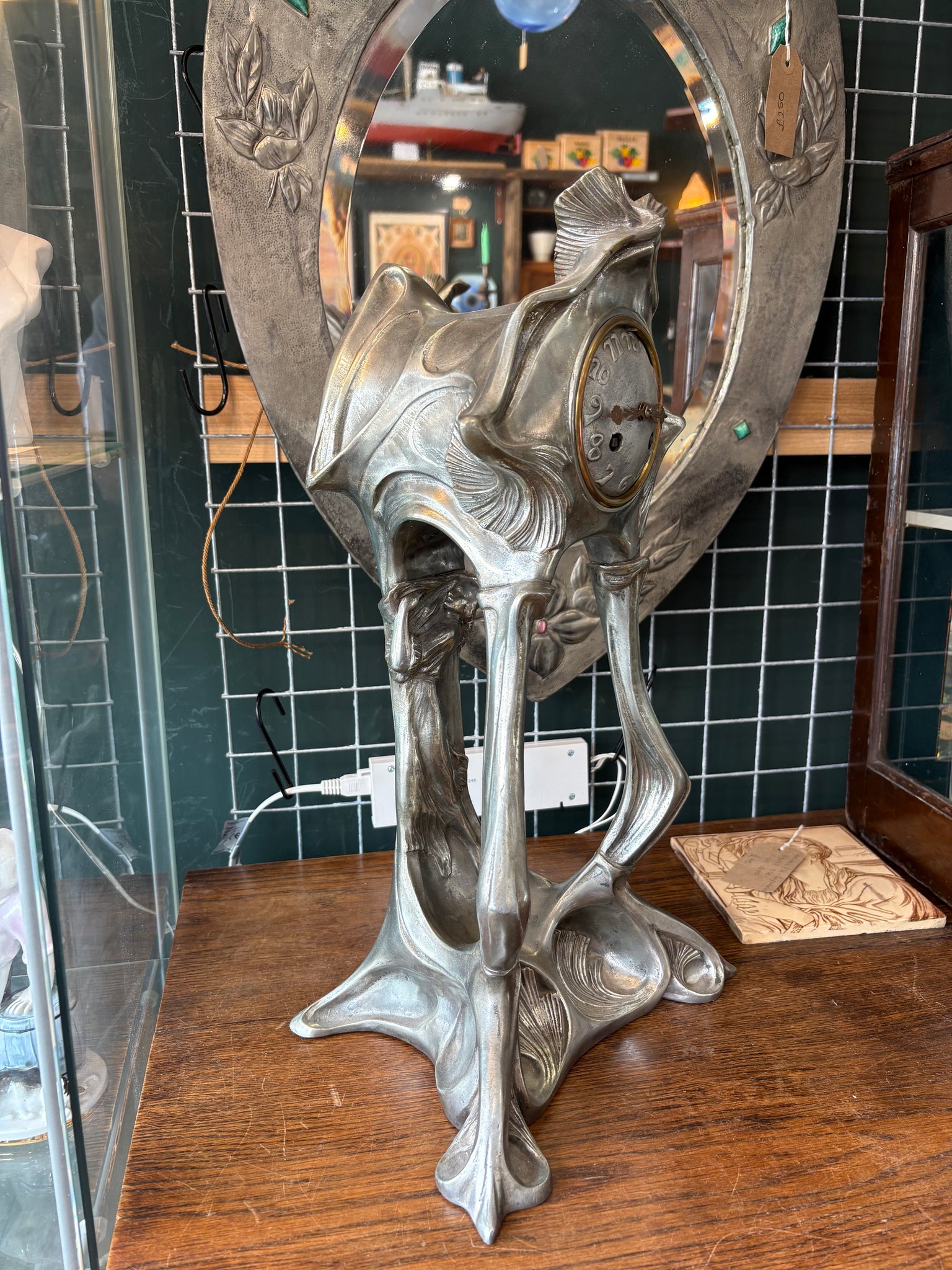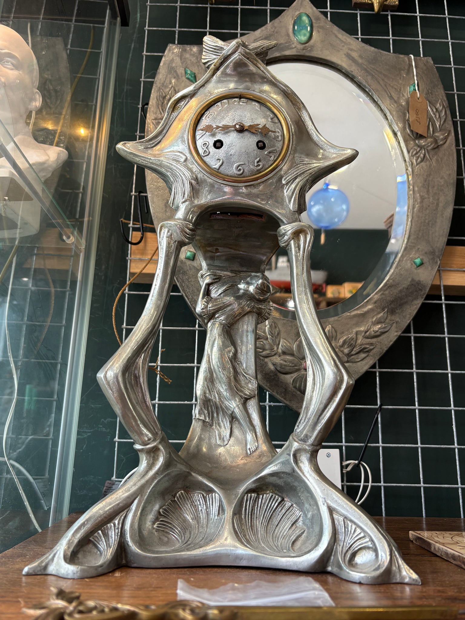 This striking Art Nouveau mantel clock combines elegant design with fine German clockmaking. The silvered spelter case is decorated with flowing organic lines and a draped female figure, capturing the distinctive style of the period.