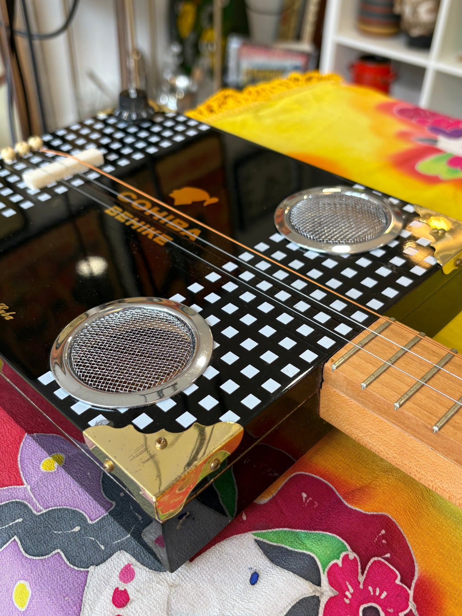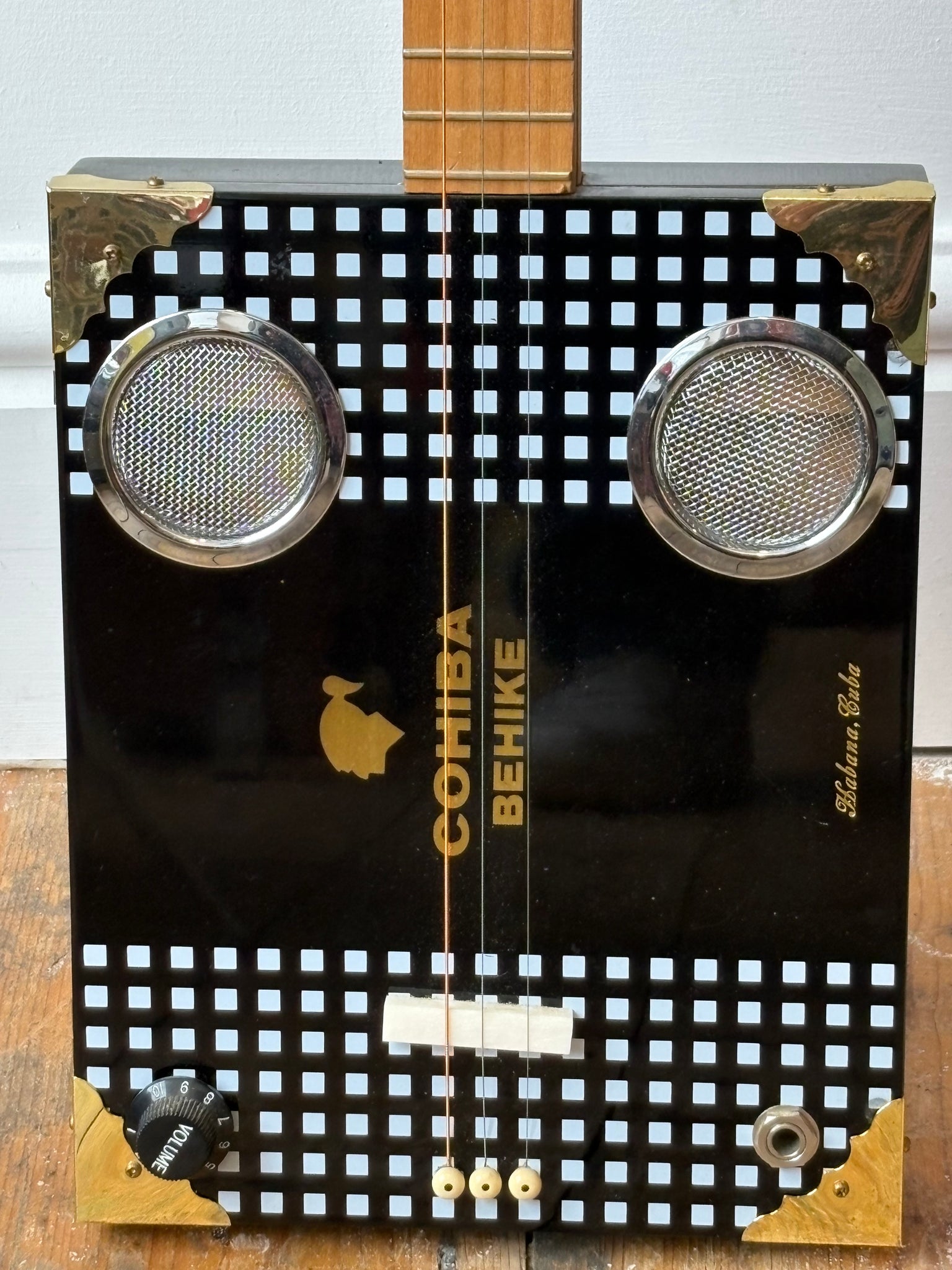 The glossy black cigar box body features gold Cohiba Behike branding, decorative metal speaker grilles, and brass corner fittings. The wooden neck is fitted with three strings and distinctive skull tuning pegs, adding to the instrument’s character.