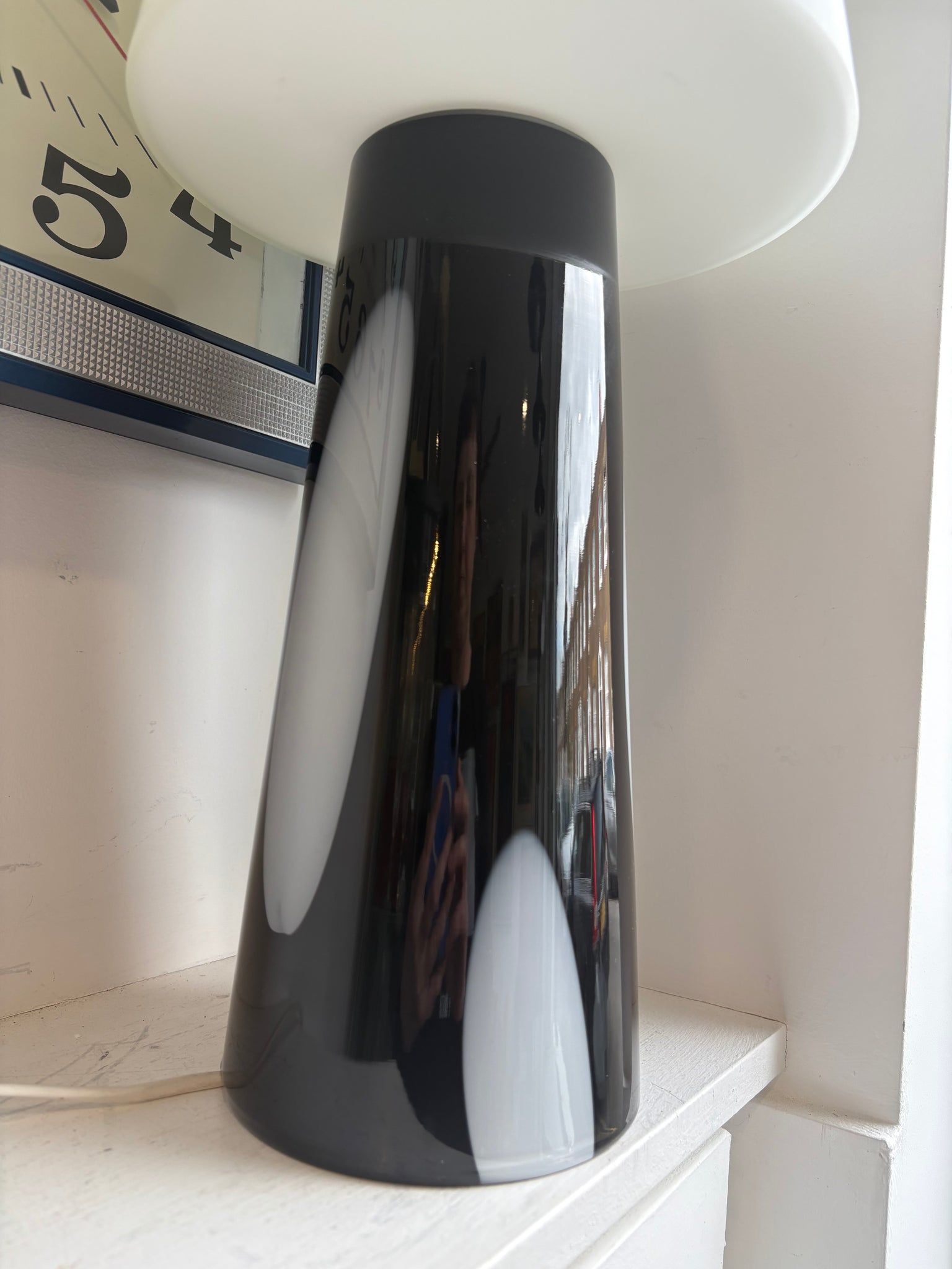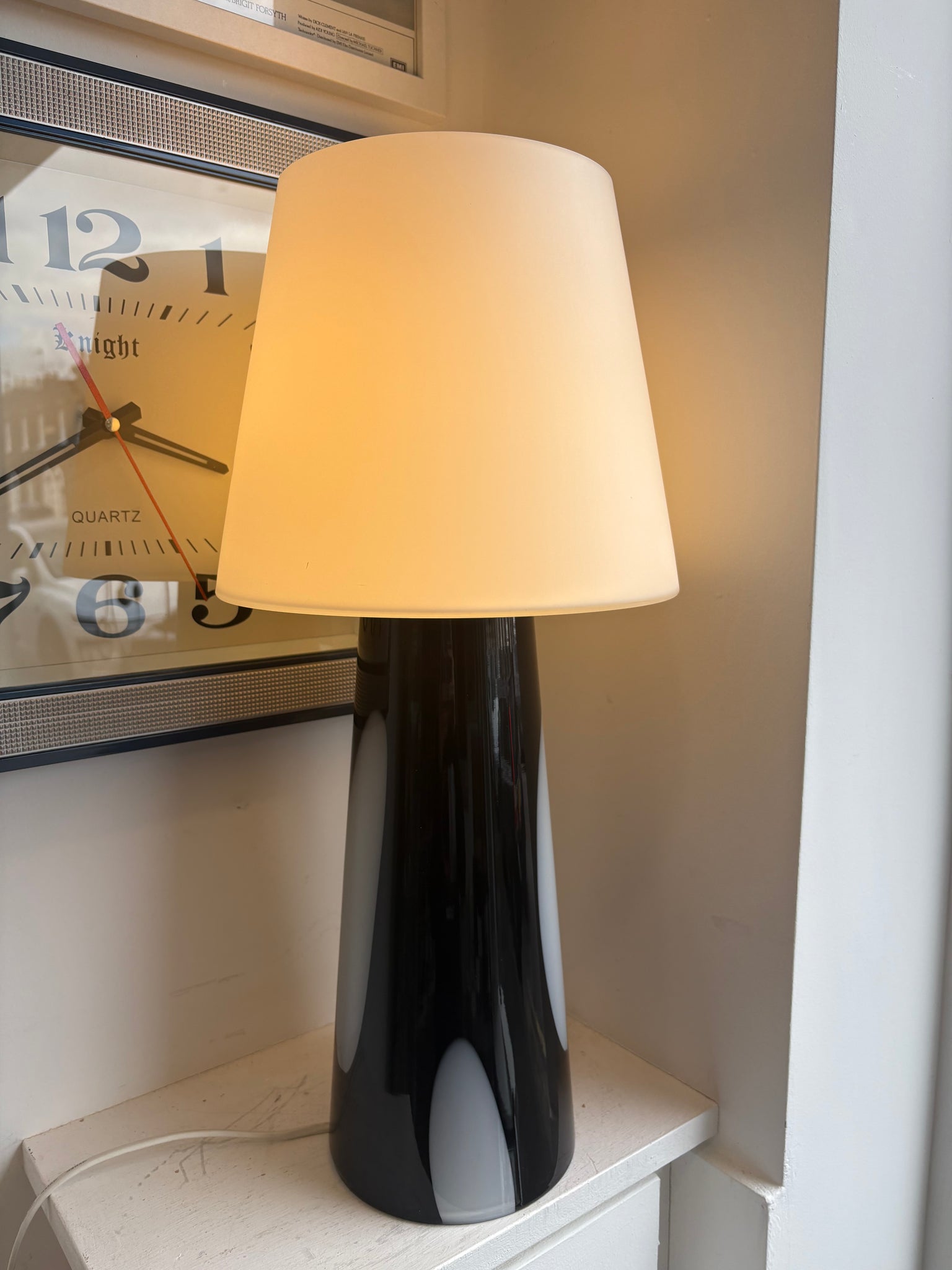 A beautifully designed Habitat Joséphine table lamp in striking black and white glass — Made in France. This iconic lamp features a chunky tapered black glass base with elegant white oval panels flowing through the body, topped with a smooth white glass shade that glows warmly when lit. The overall effect is bold, sculptural and unmistakably French in its confident minimalism.