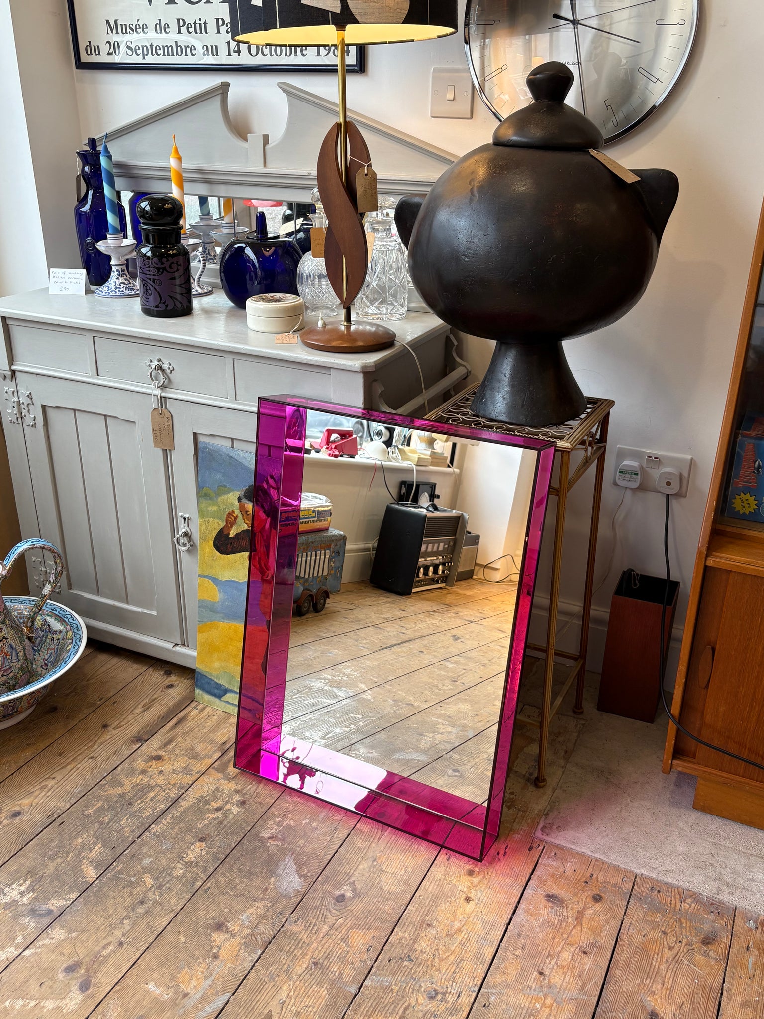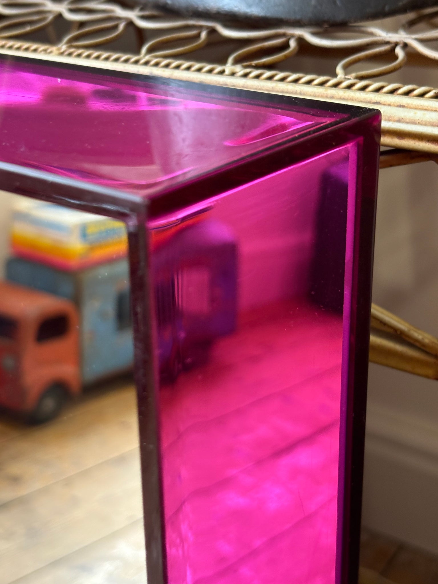 This bold and elegant piece features a vivid fuchsia acrylic frame that catches and reflects the light beautifully, creating a vibrant modern accent for any interior.