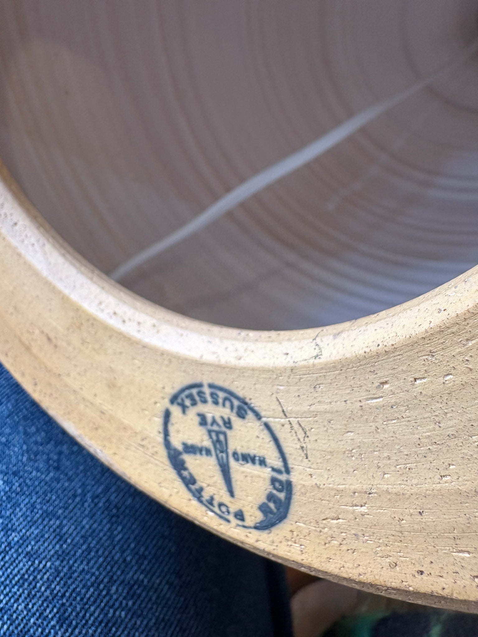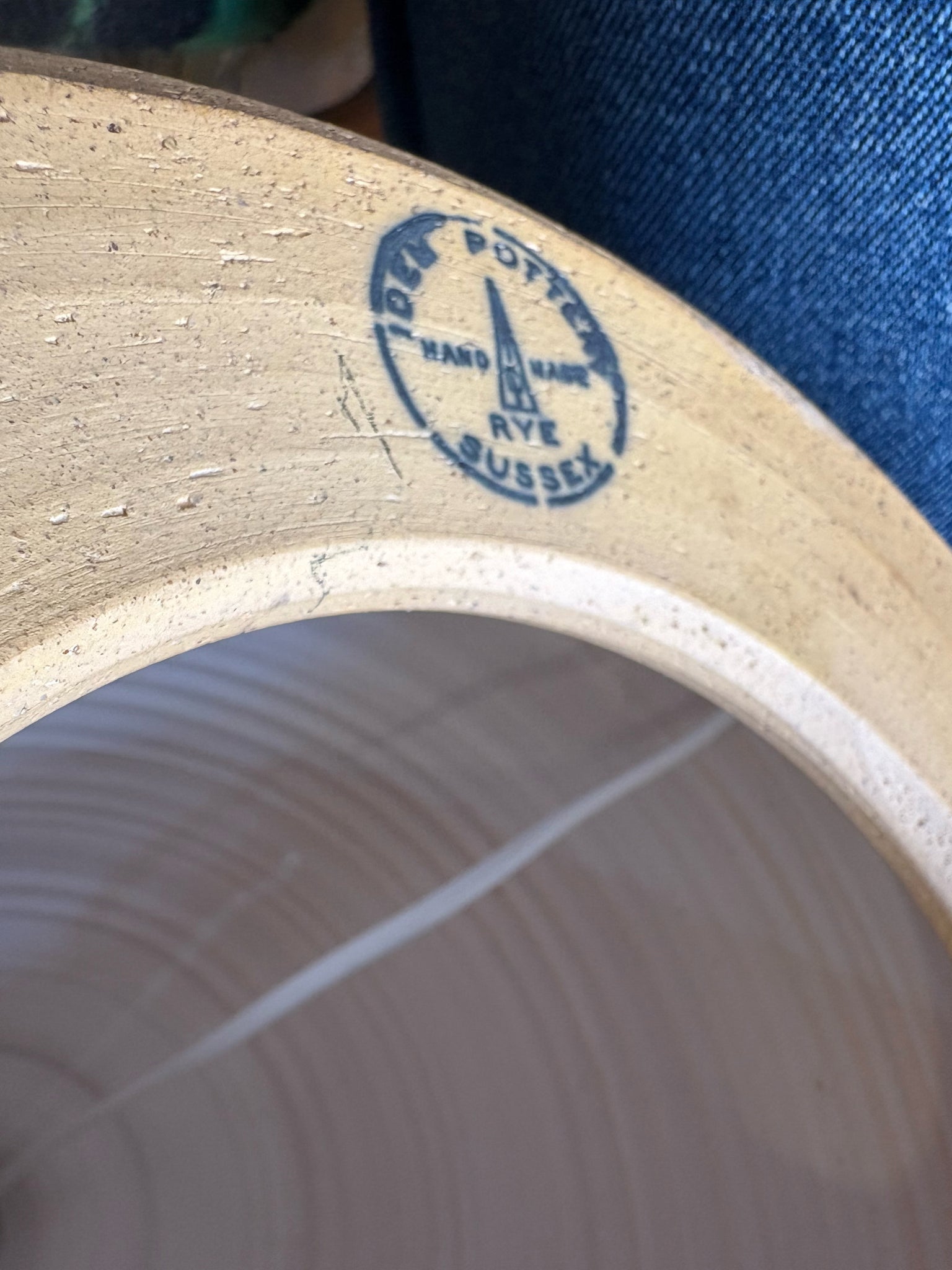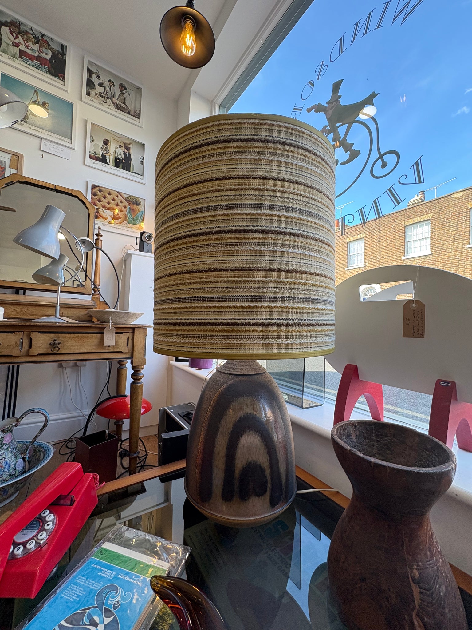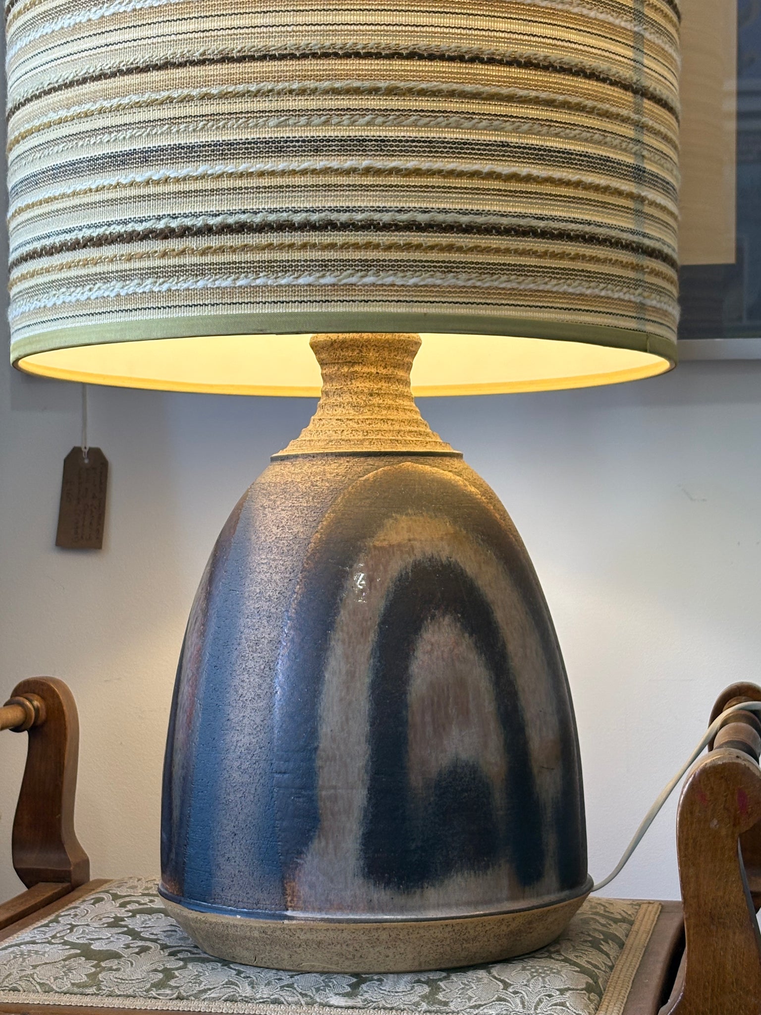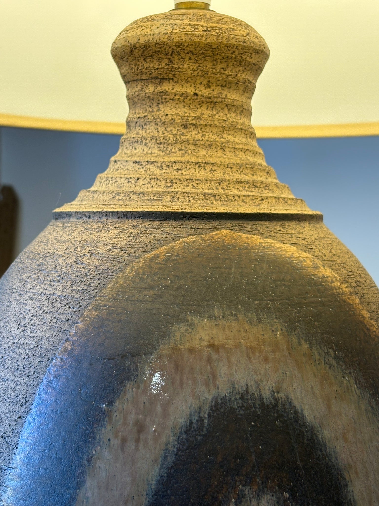 A striking mid-century Iden Pottery table lamp, hand-thrown at the celebrated Rye pottery in Sussex during the 1970s. The lamp base is crafted in earthy stoneware with natural glaze tones of brown, black and sandy beige, creating a bold yet organic presence.