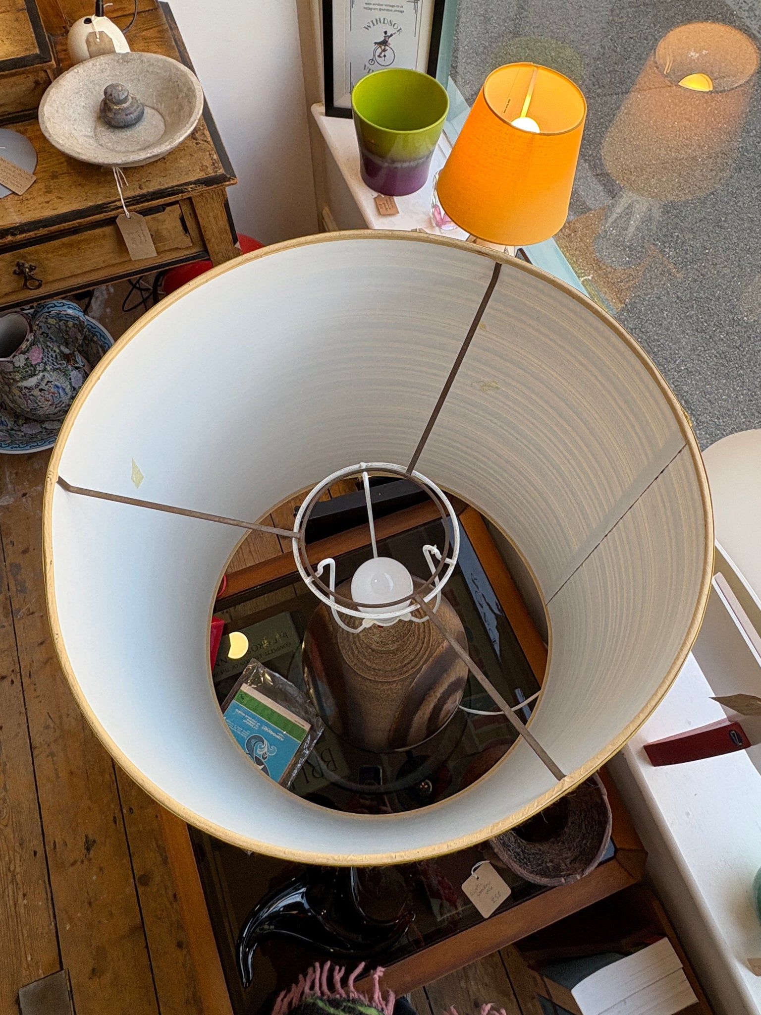 It retains its original large woven shade in shades of cream, ochre and brown, adding a wonderful retro texture and warmth. At 76cm tall with the shade, this piece makes an impressive statement lamp, perfect for bringing mid-century character into any room.