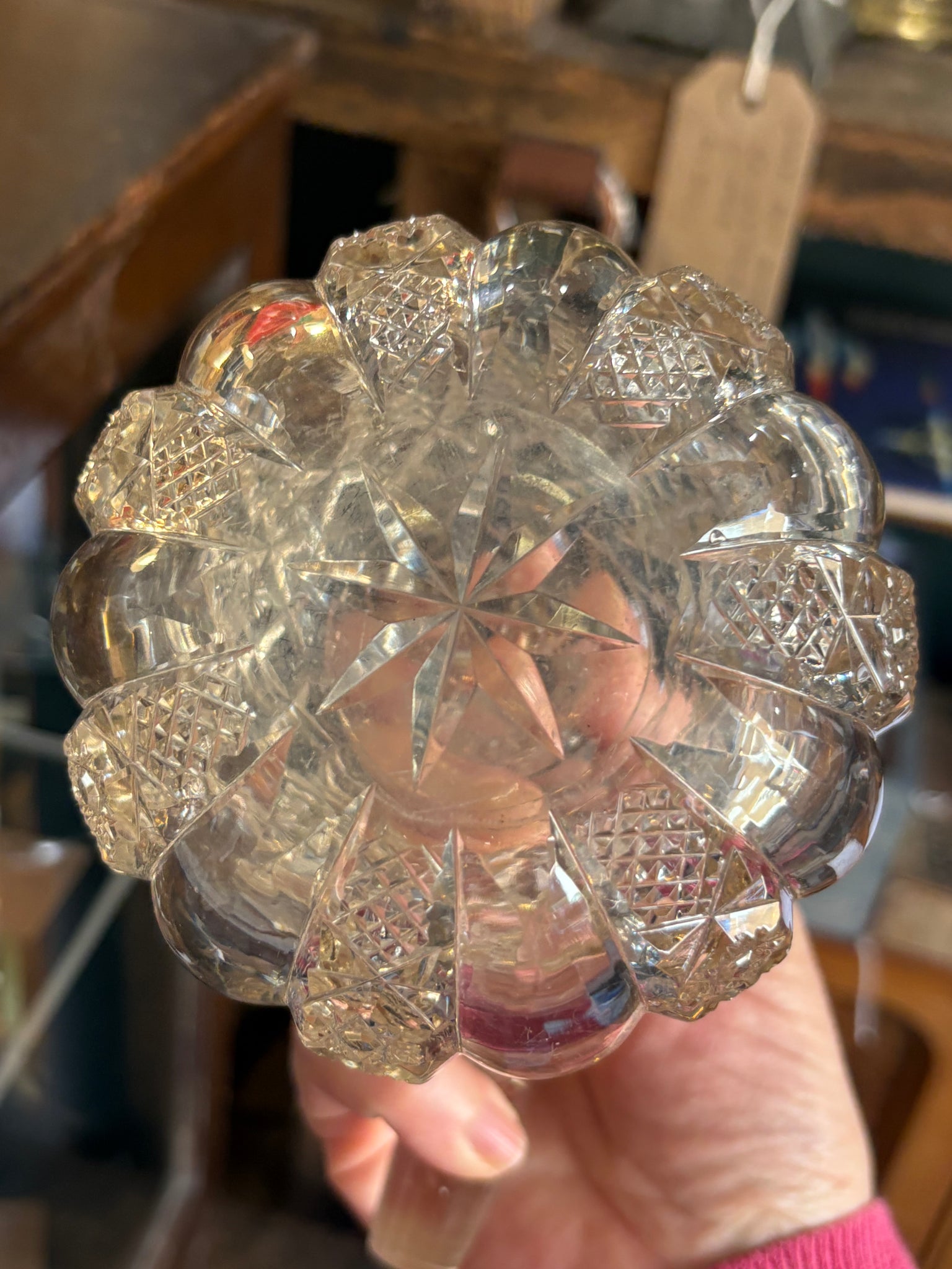 The base is finished with a crisp starburst design, and the glass is wonderfully clear with no clouding. A charming addition to any dressing table or a thoughtful gift for anyone who loves antique glass.