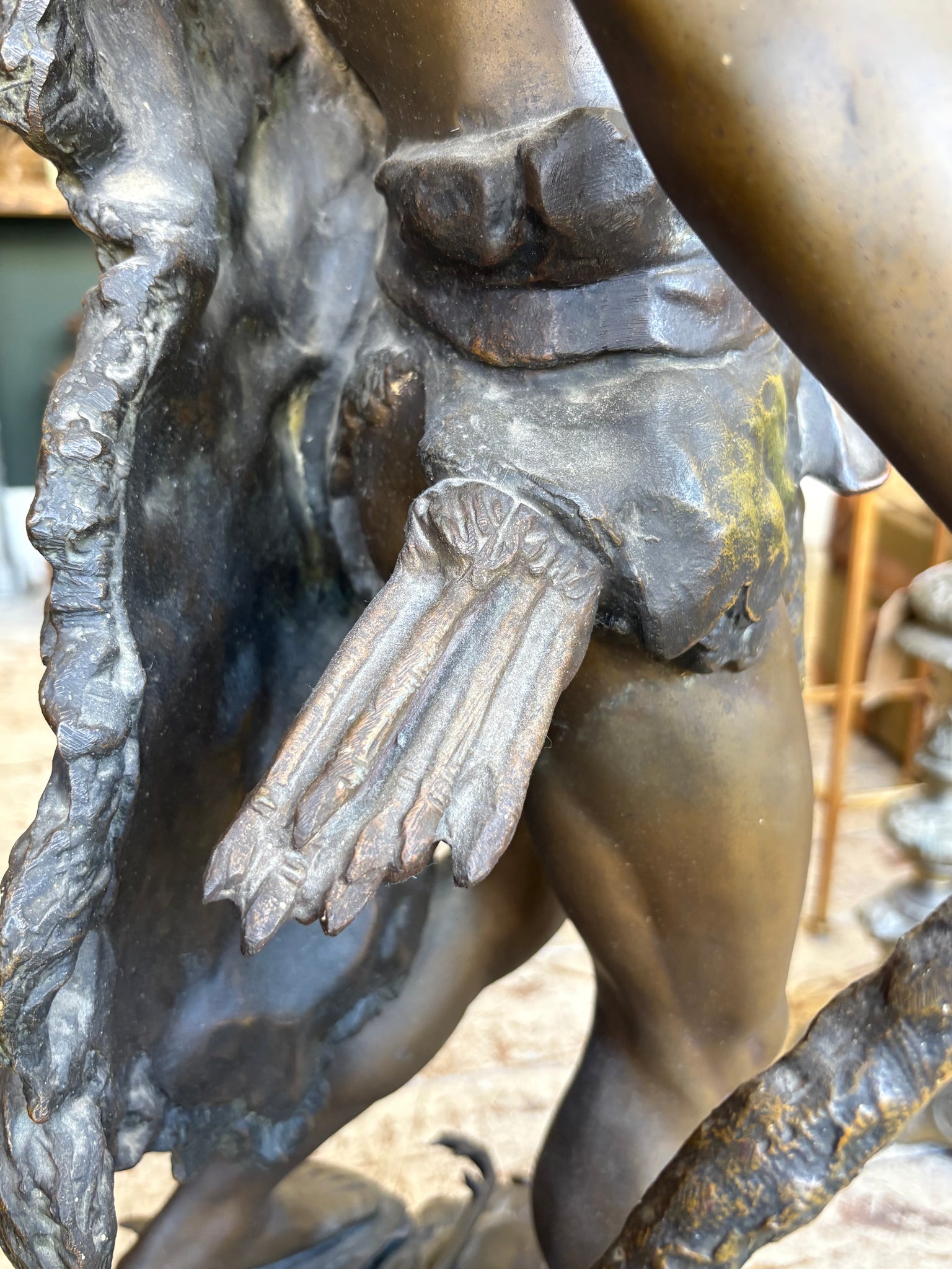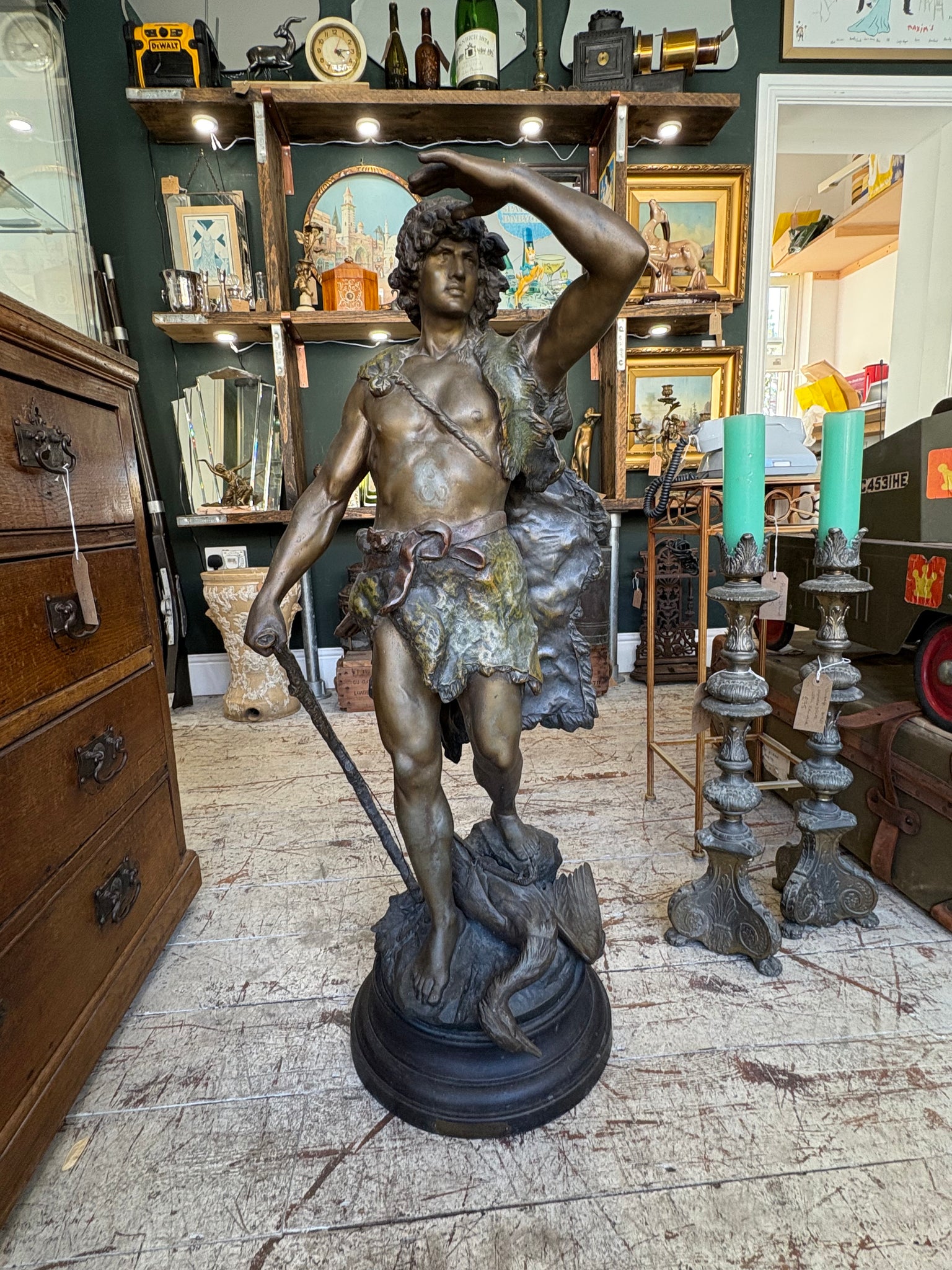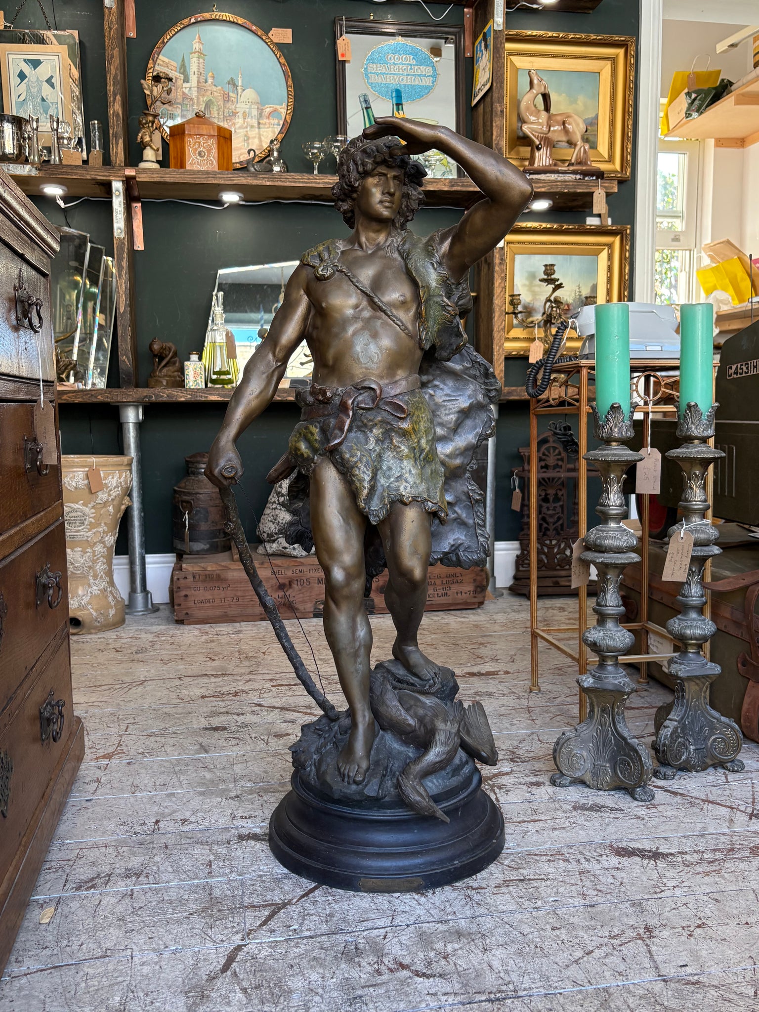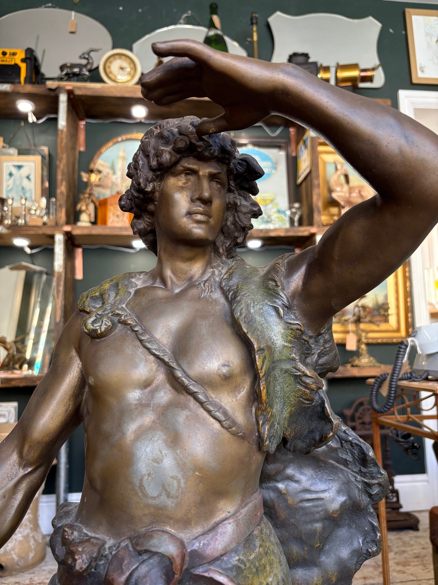 A striking and substantial spelter figure inspired by Auguste Moreau, depicting a hunter in a primitive outfit with bow, arrows, and a game bird at his feet. Beautifully detailed with a strong sense of movement and character.