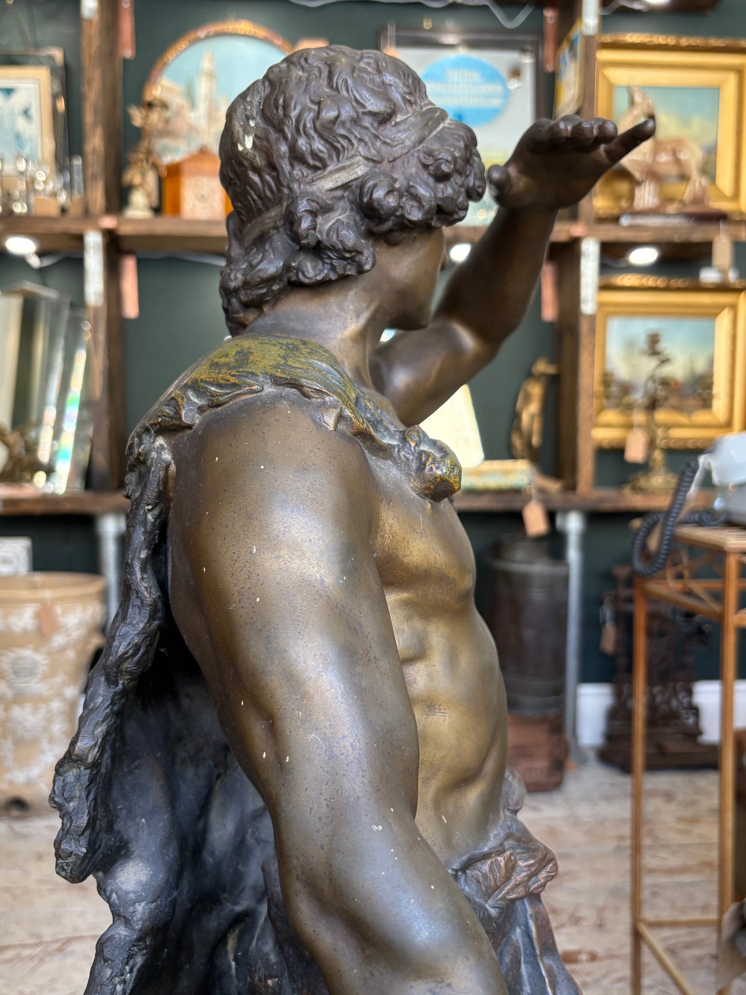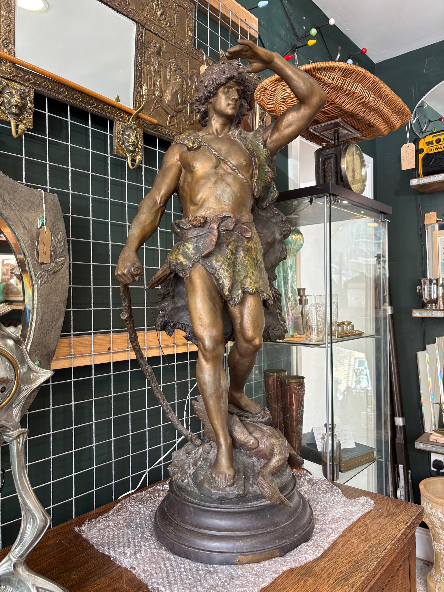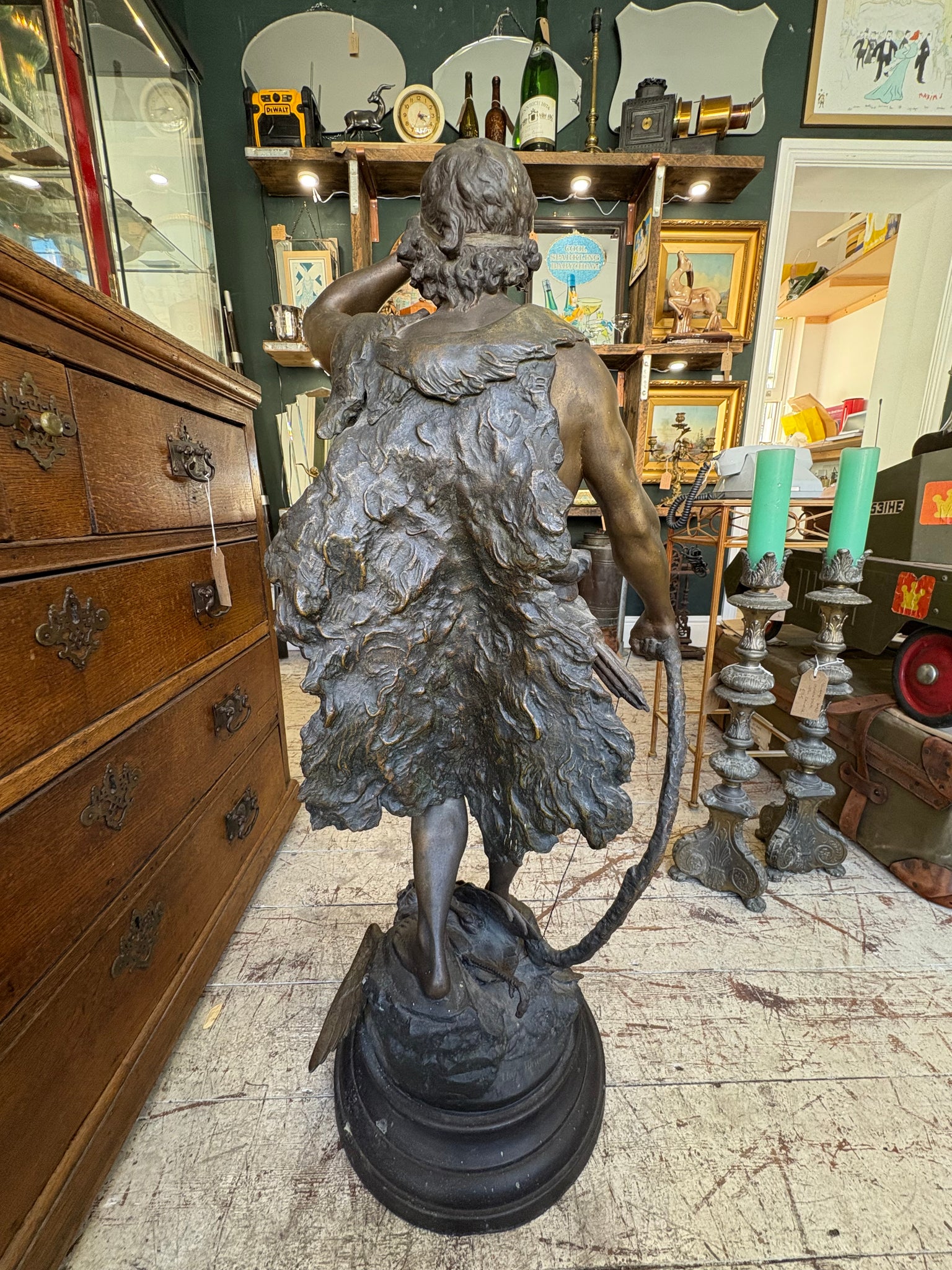 A striking and substantial spelter figure inspired by Auguste Moreau, depicting a hunter in a primitive outfit with bow, arrows, and a game bird at his feet. Beautifully detailed with a strong sense of movement and character.