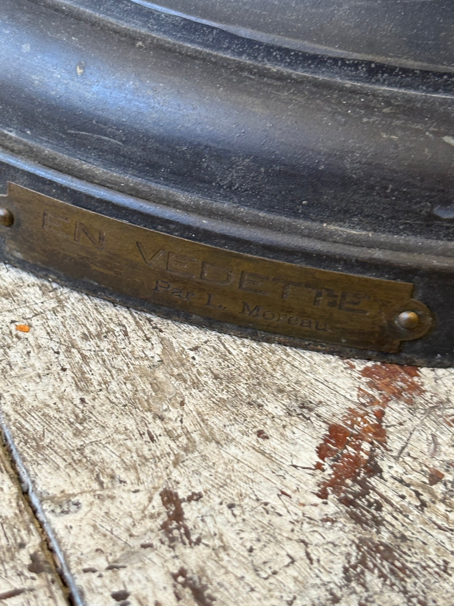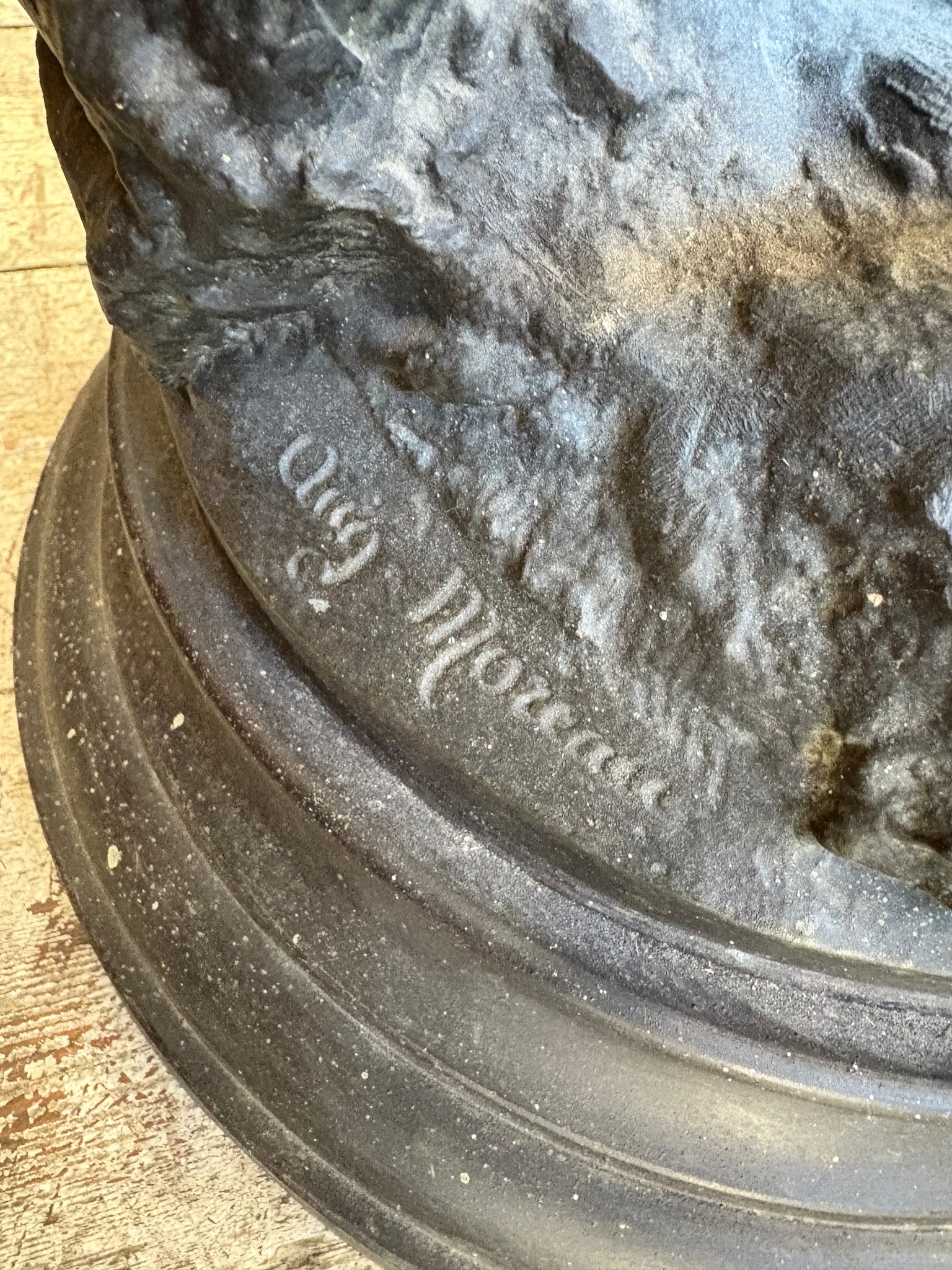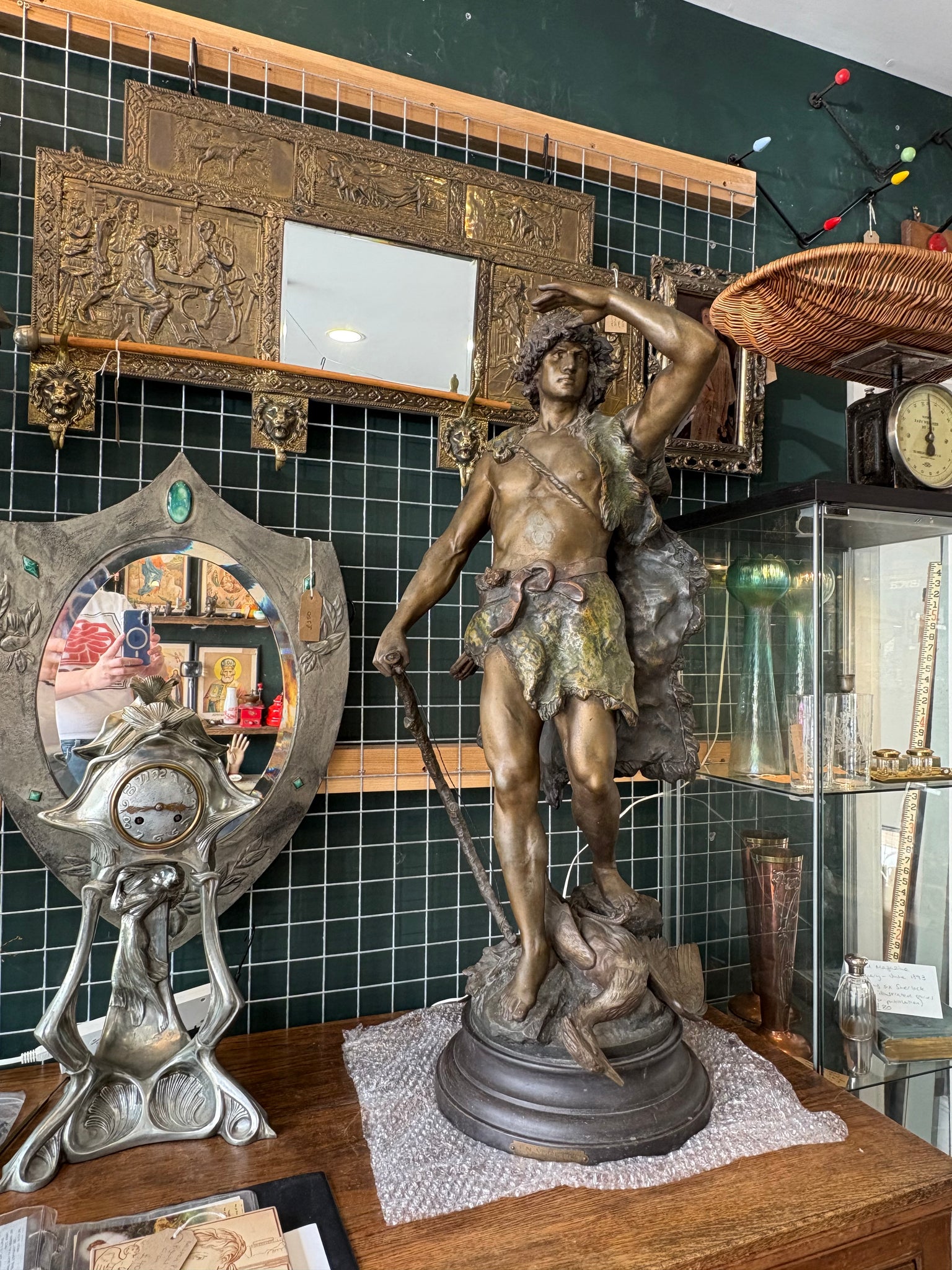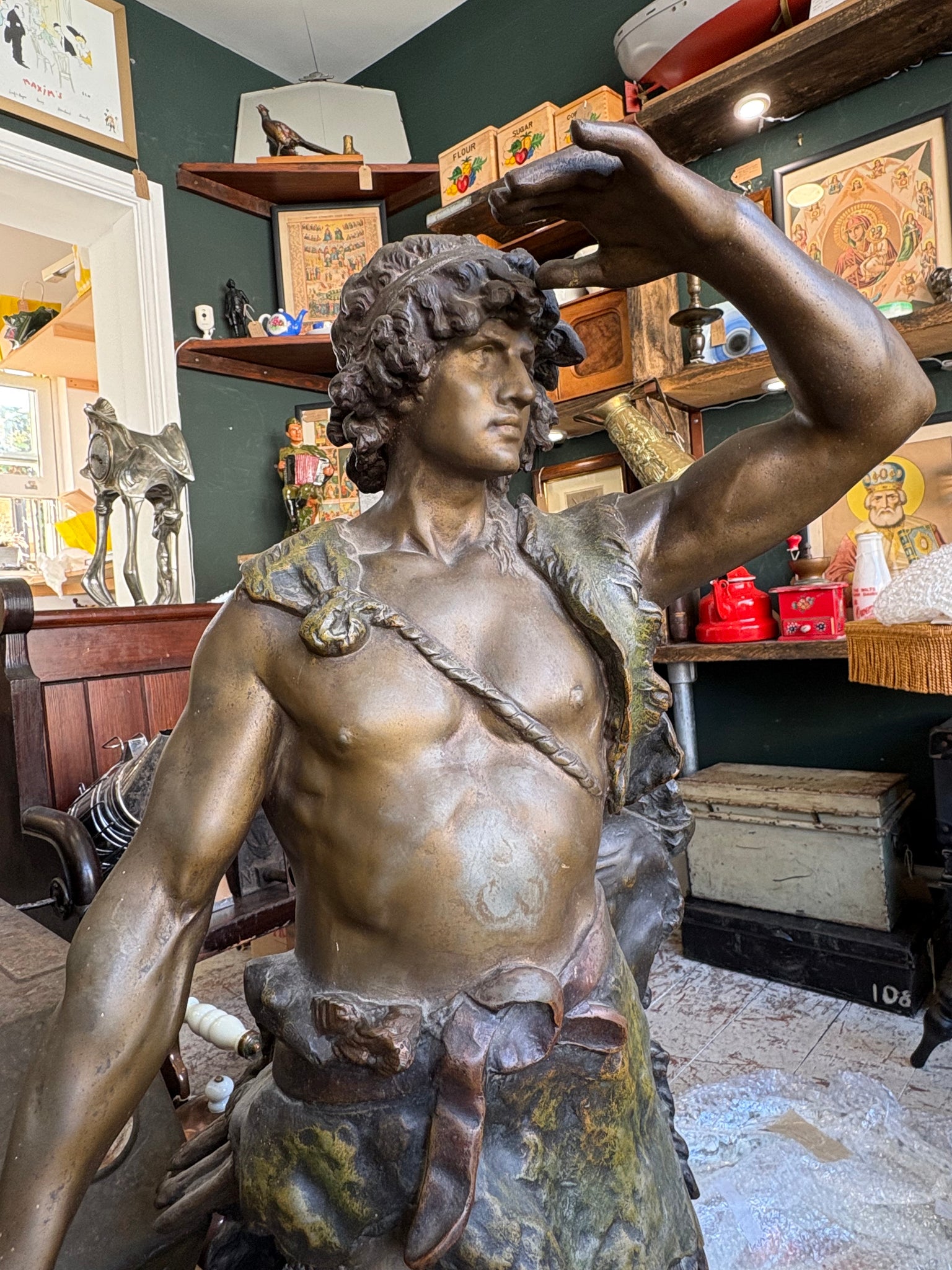 A striking and substantial spelter figure inspired by Auguste Moreau, depicting a hunter in a primitive outfit with bow, arrows, and a game bird at his feet. Beautifully detailed with a strong sense of movement and character.