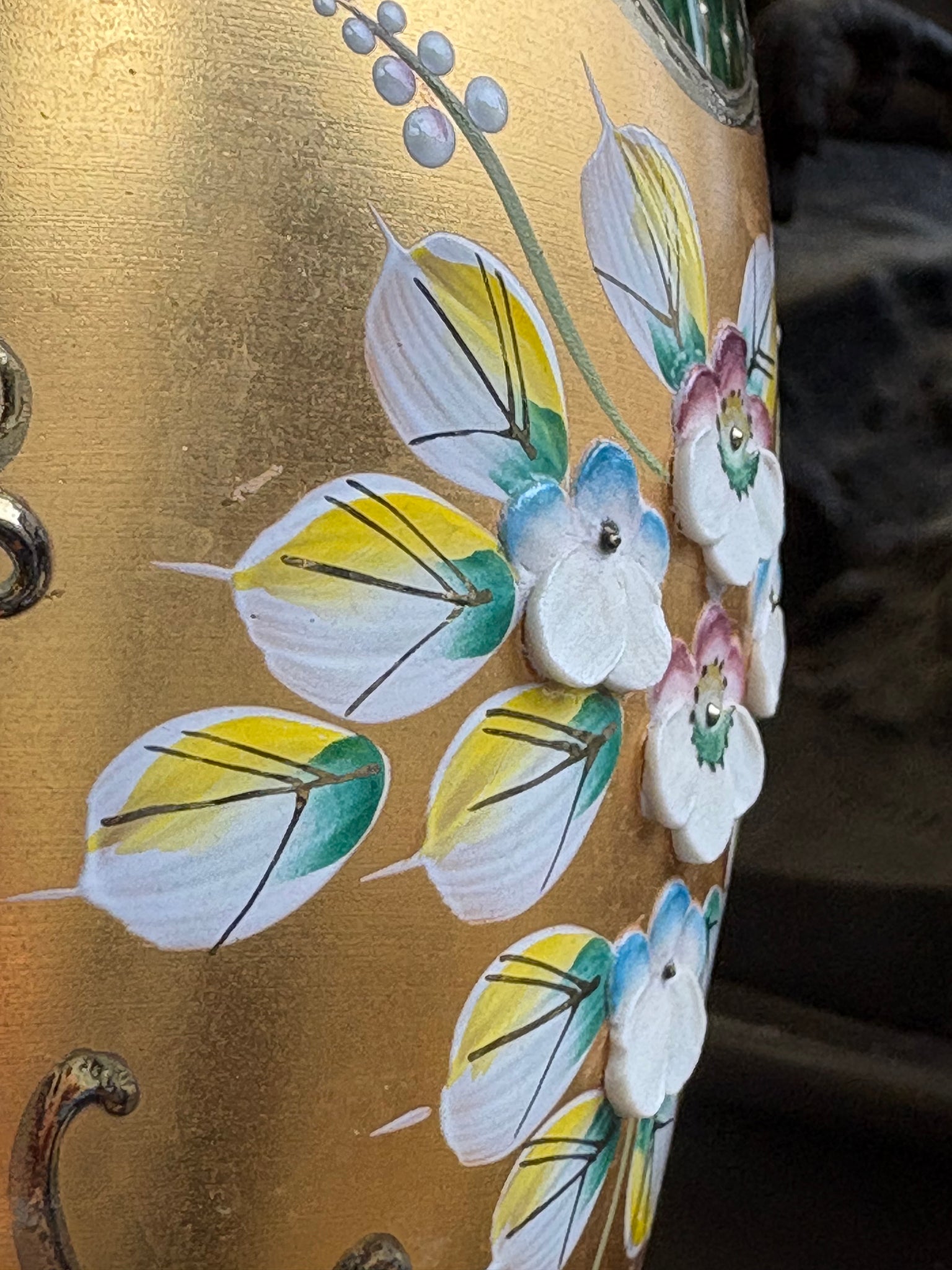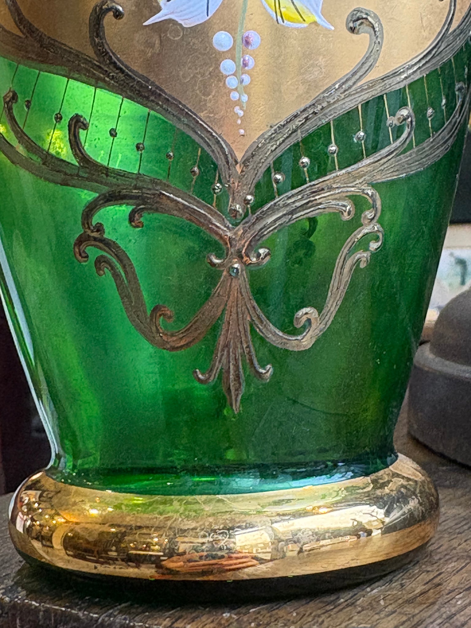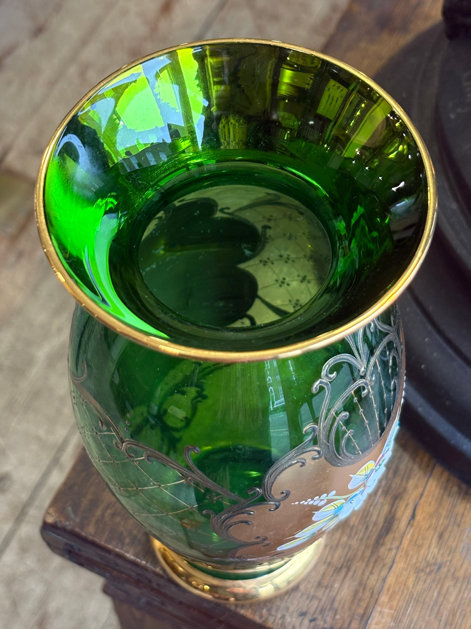 Mid Century Czech Revival Style Emerald & Gold Glass Vase – Hand Painted Floral – 23cm