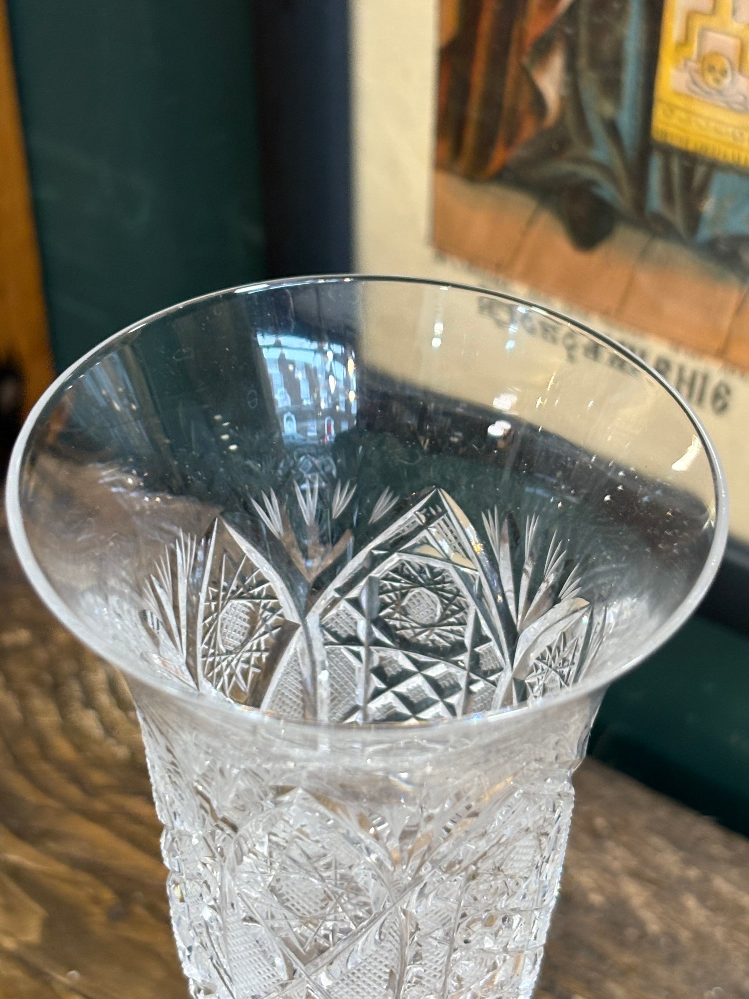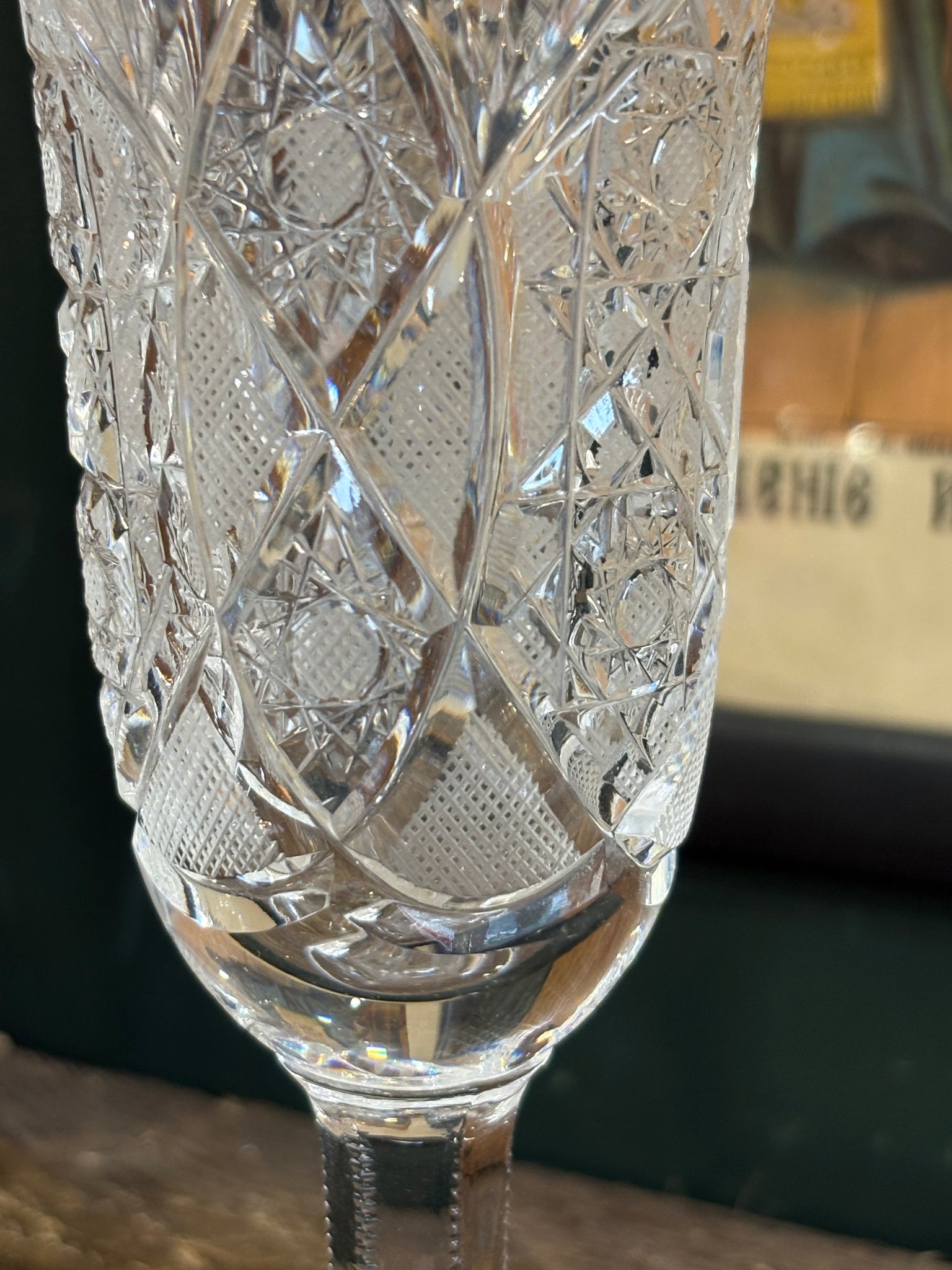 A lovely pair of mid-century Bohemian crystal flutes, beautifully cut with a classic lattice and starburst design. These elegant glasses catch the light beautifully, adding a bit of sparkle to any table. Perfect for champagne or sparkling wine, and equally lovely for serving cocktails or desserts.