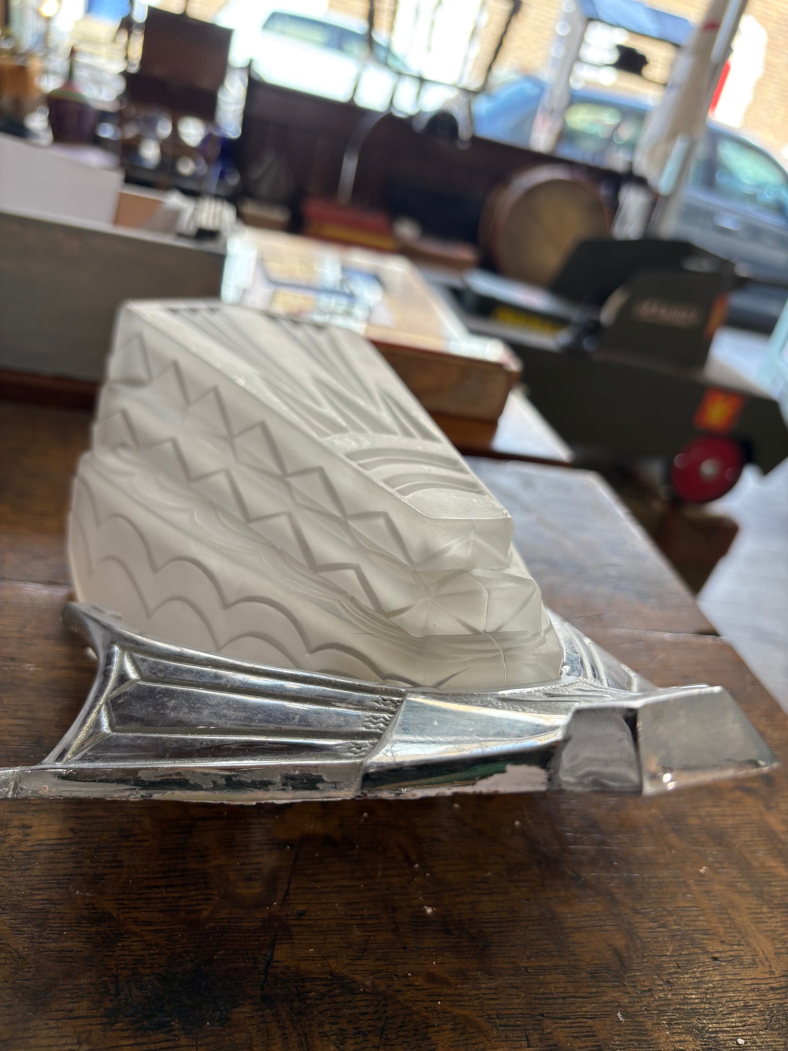 A gorgeous pair of original Art Deco wall light sconces, dating from the 1930s. Each sconce features a bold frosted glass shade in a stepped geometric design, mounted in polished chrome fittings. The sculptural form is instantly recognisable as Deco, combining streamlined elegance with dramatic architectural lines.