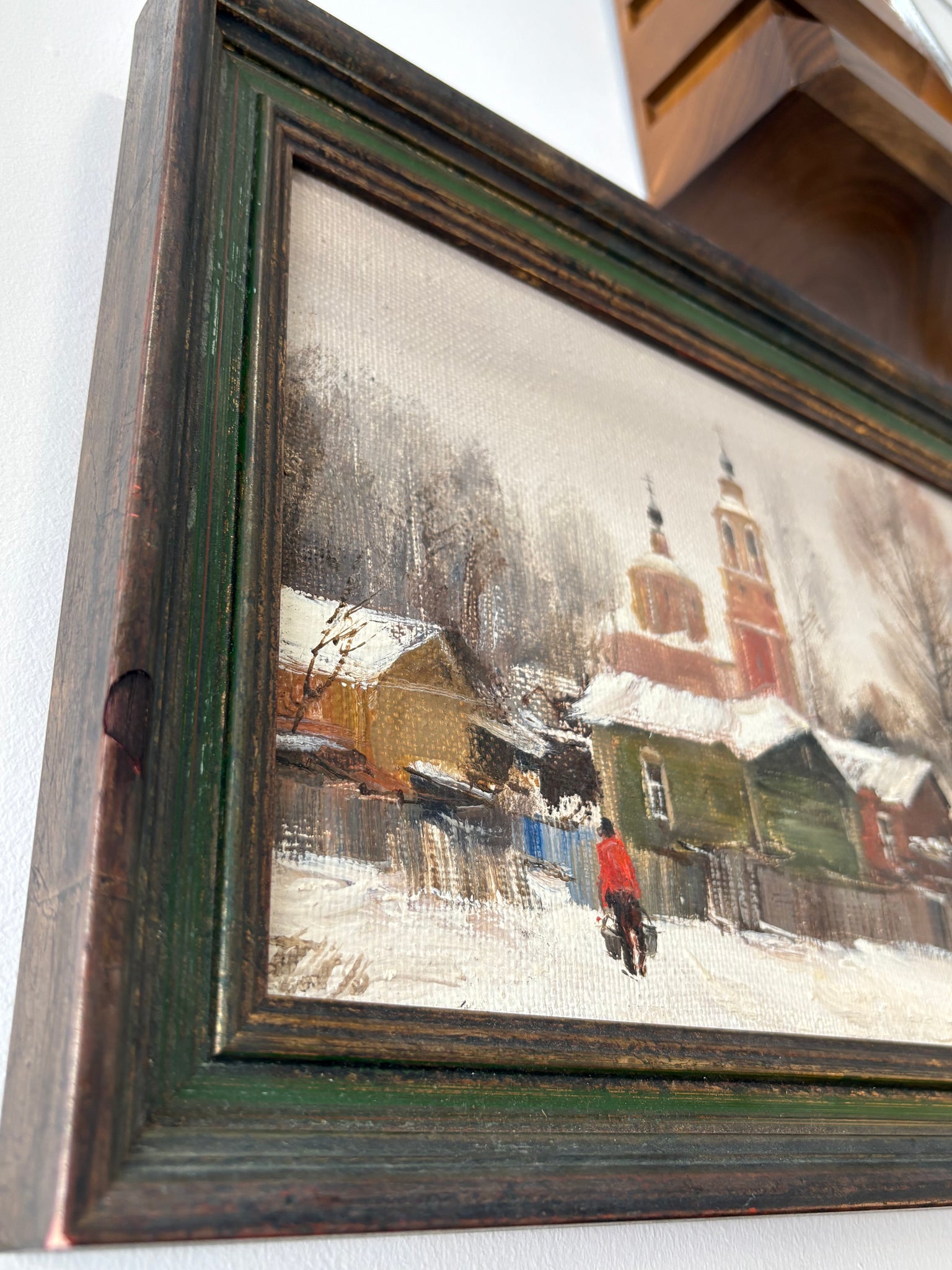 A striking Russian Impressionist School oil on canvas, signed and dating from the mid to late 20th century. This atmospheric winter village scene depicts snow-covered houses, church towers, and a lone figure in a red coat, all painted with confident, expressive brushwork.