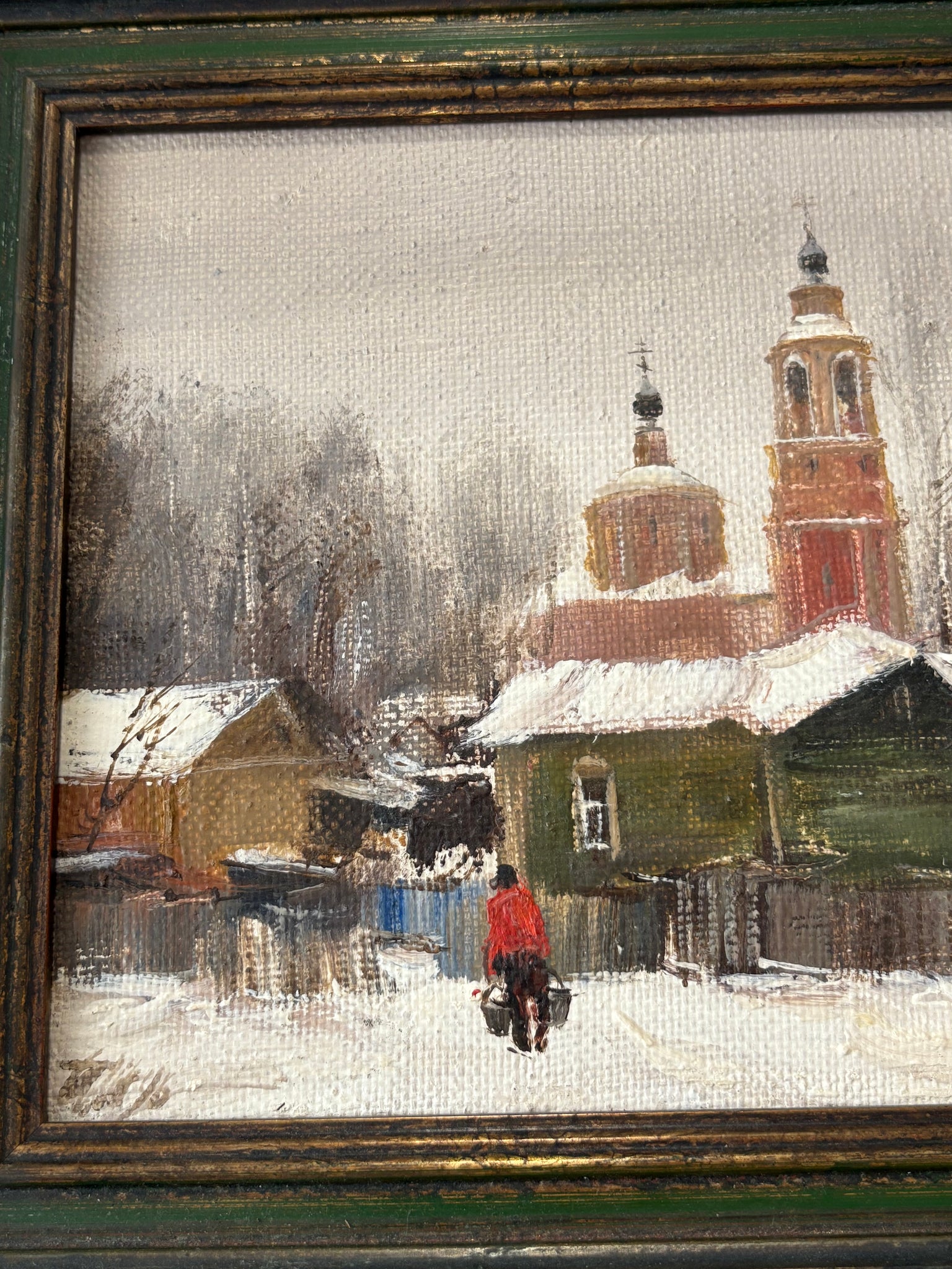 Presented in a vintage green-toned frame, the painting captures the quiet beauty of rural Russia in winter. It works beautifully as a standalone piece but is also a companion to another Russian Impressionist winter scene we currently have available, making them an exceptional pair for collectors.