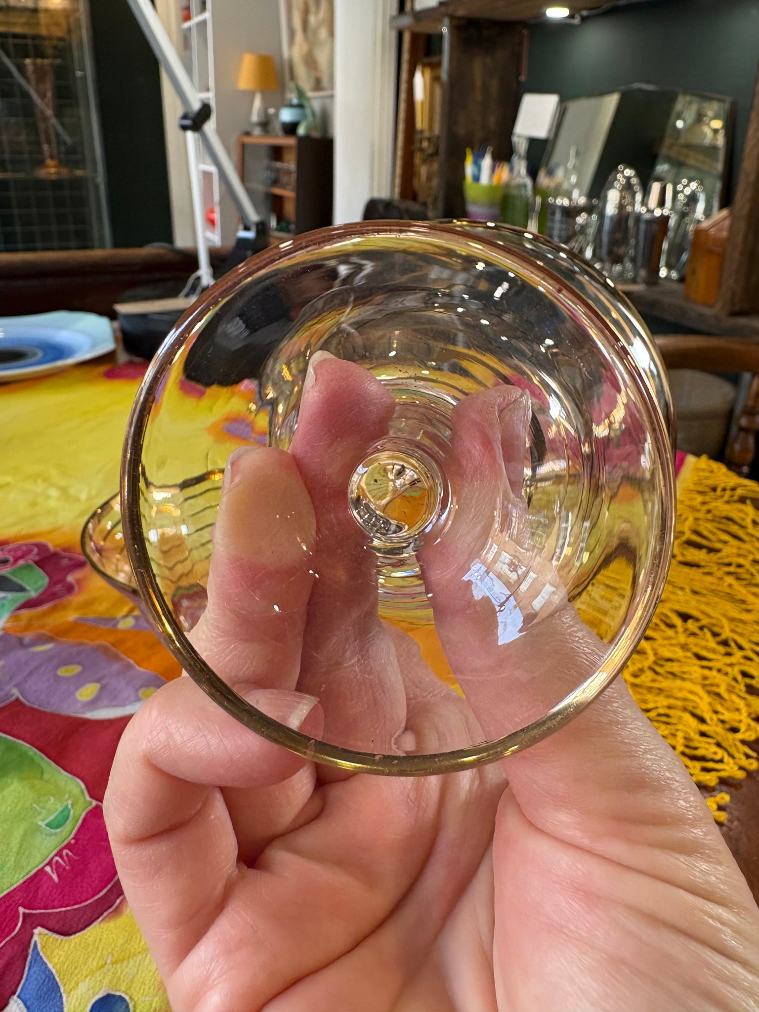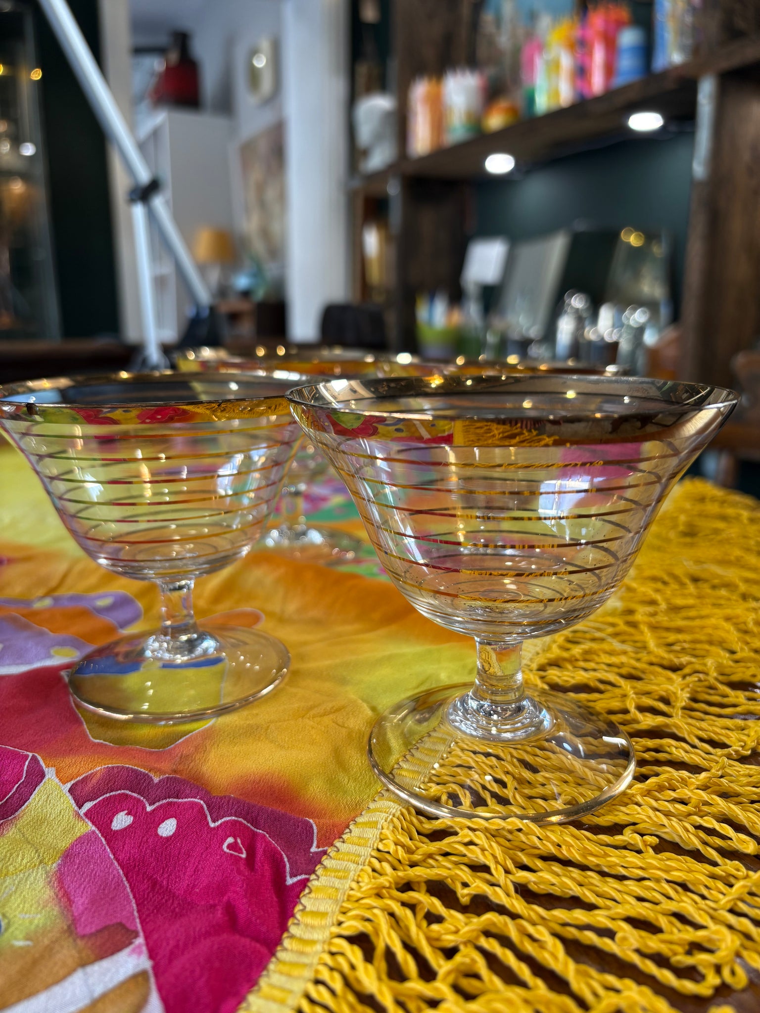 Elegant 1950s cocktail or aperitif glasses with delicate gold banding. Each glass features a flared bowl and clear stem, perfect for serving cocktails, desserts, or aperitifs.