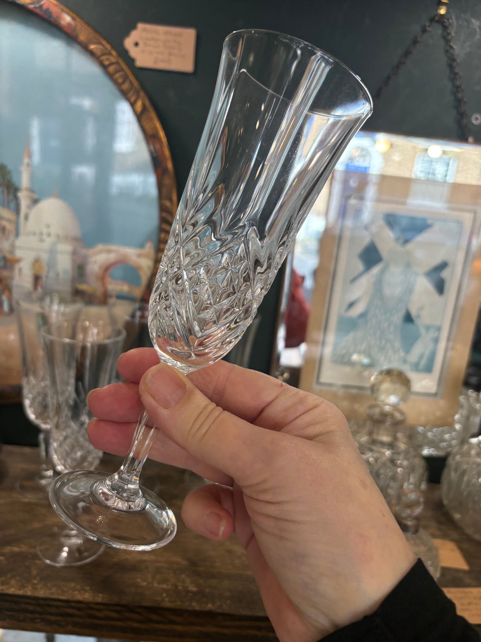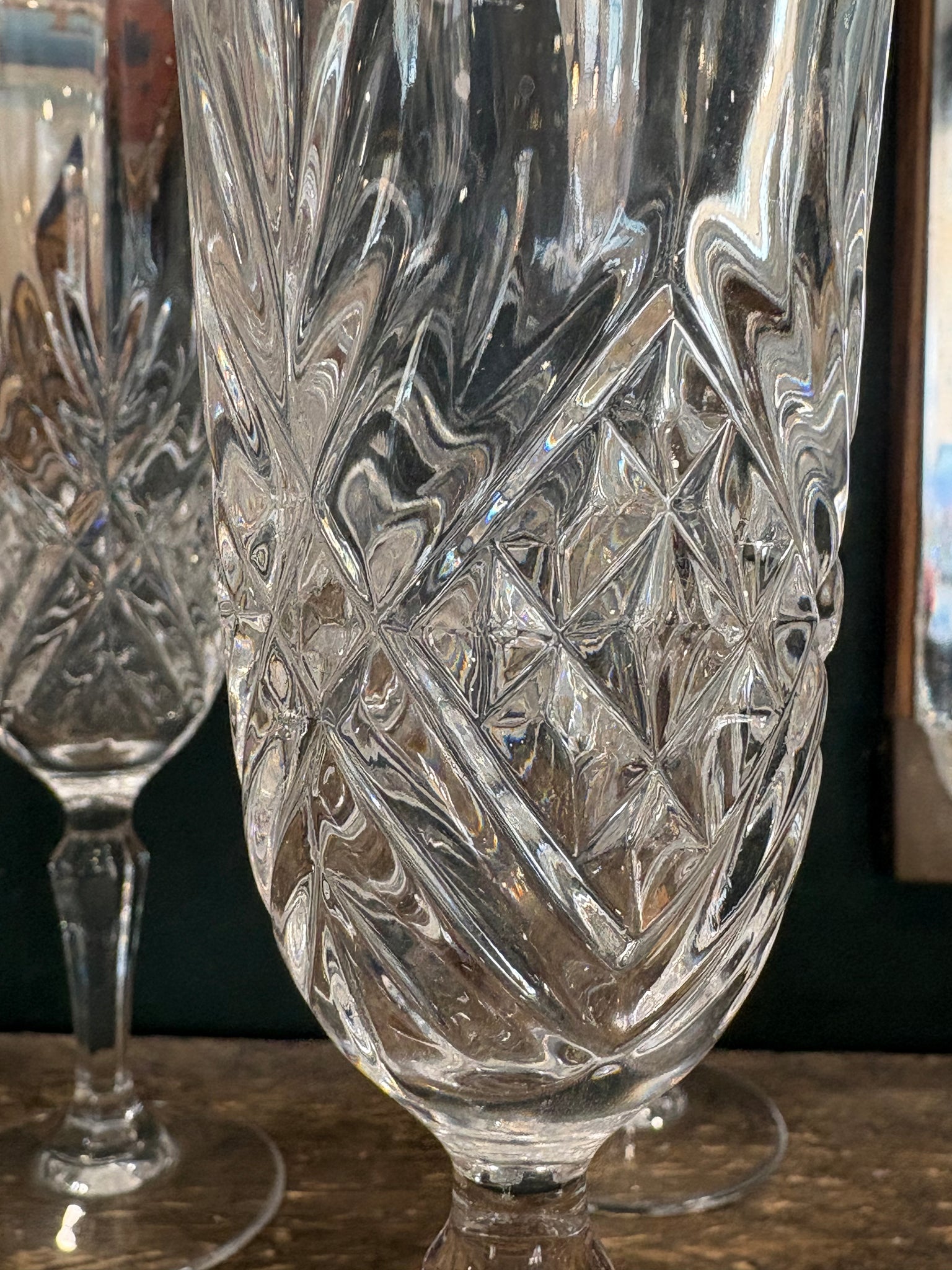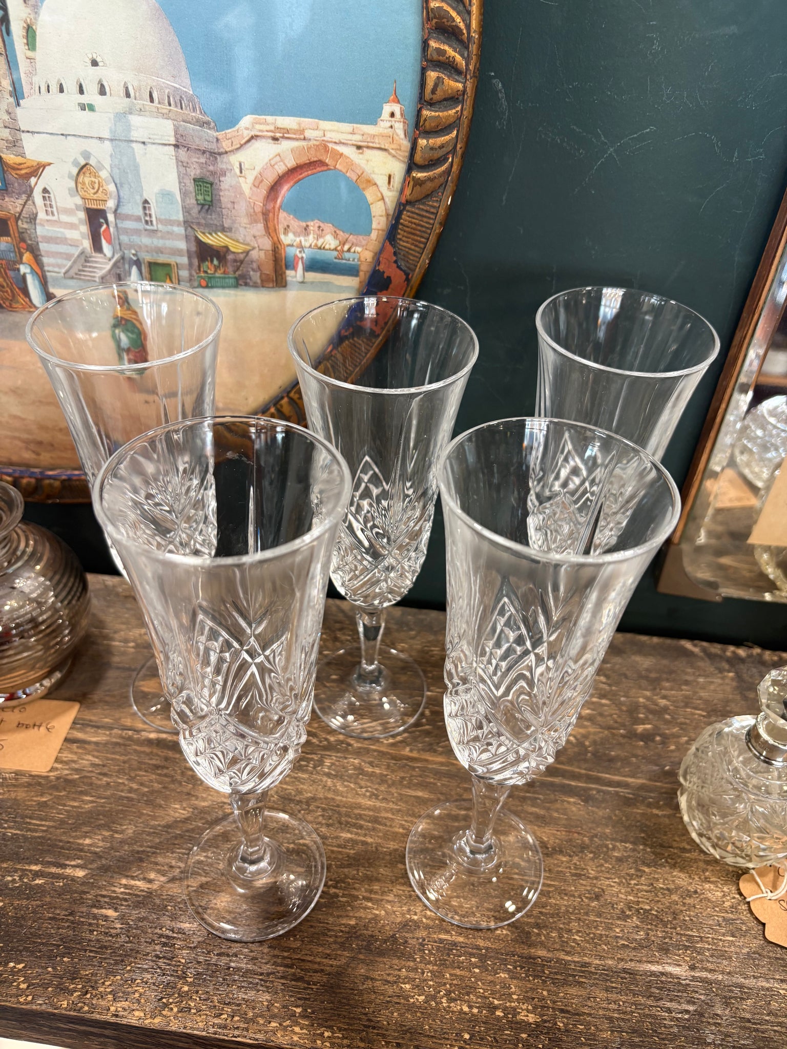 A refined set of five vintage crystal champagne flutes made in England, featuring a classic cut glass design that adds sparkle and elegance to any table.