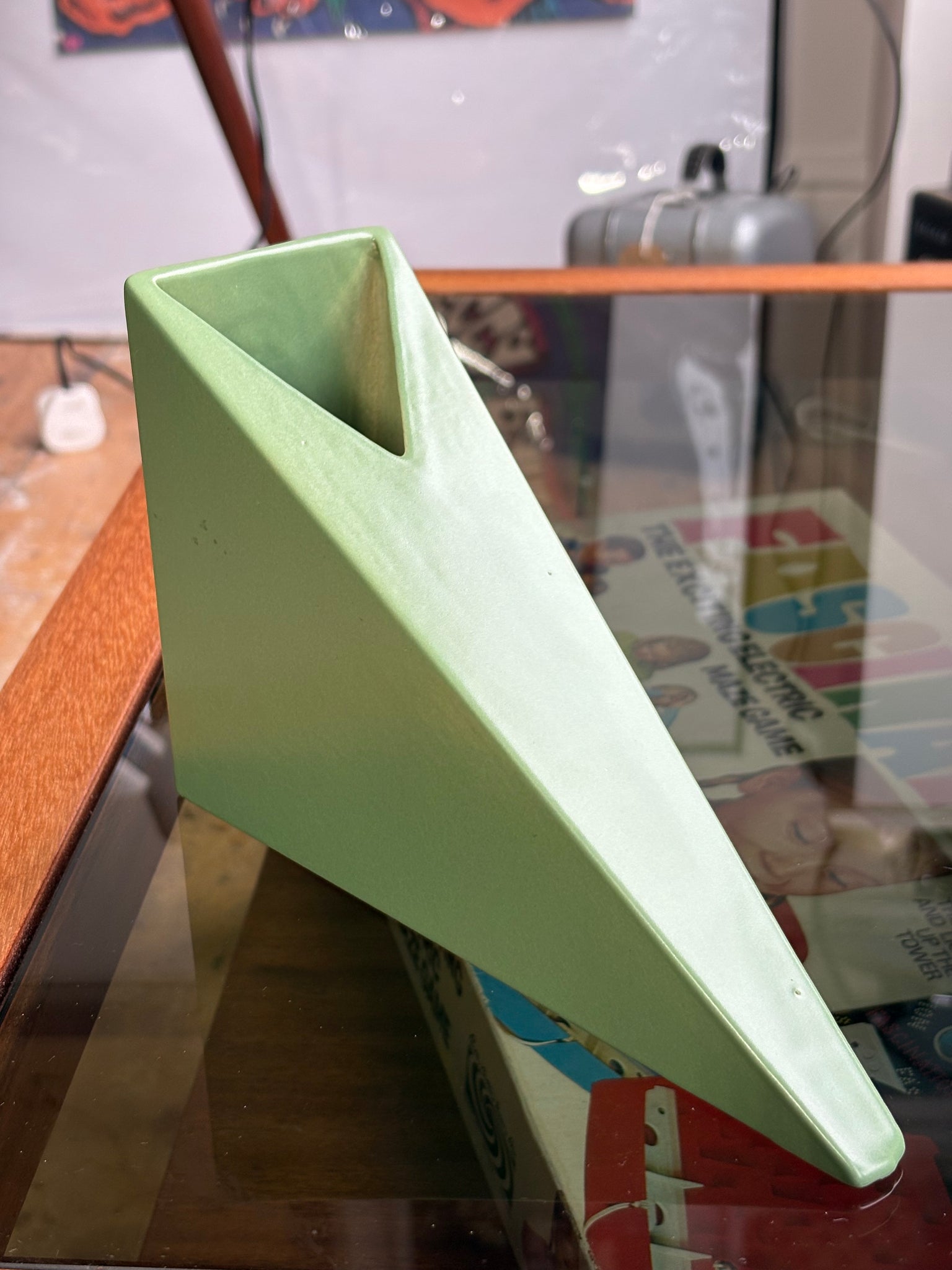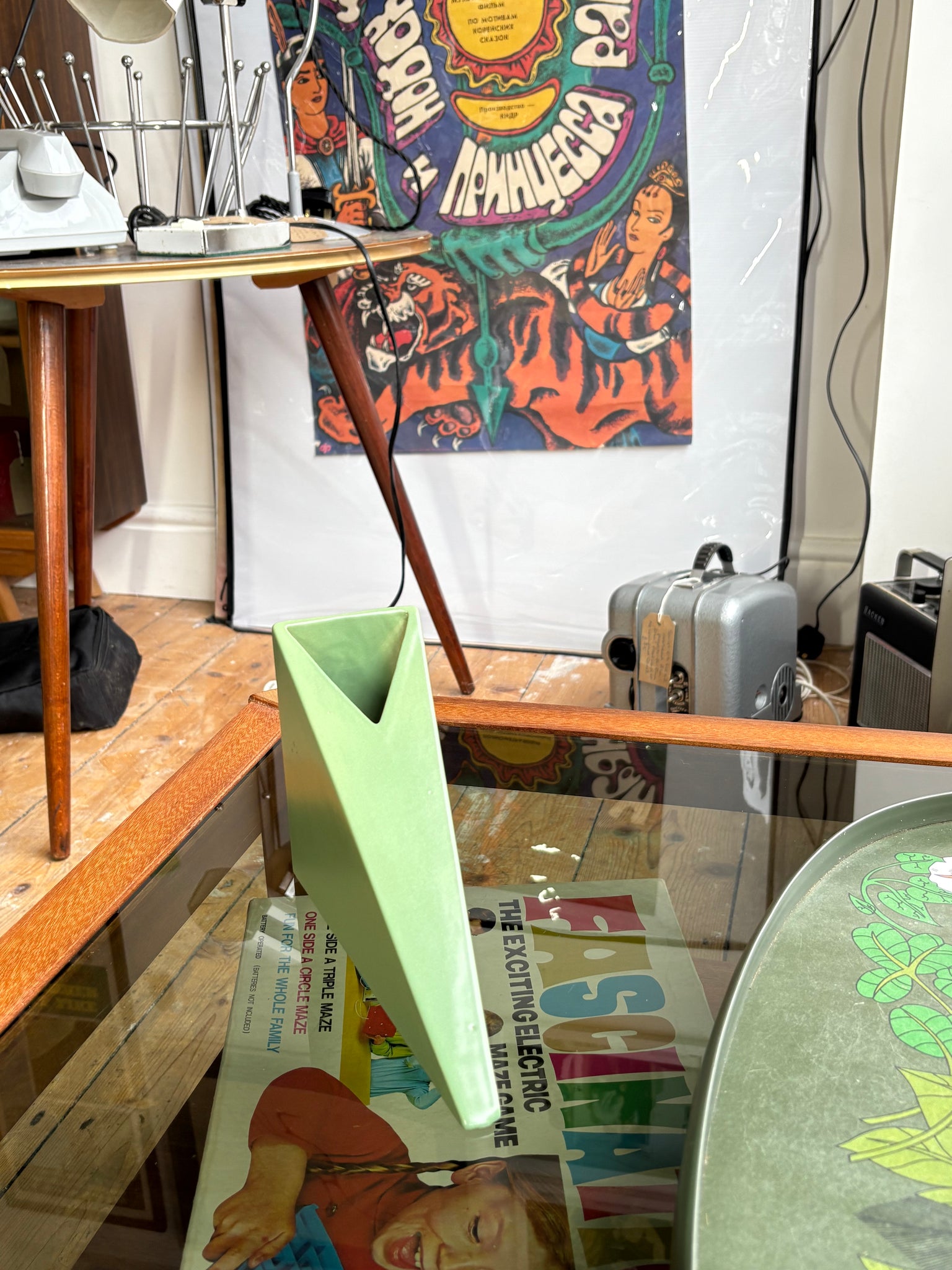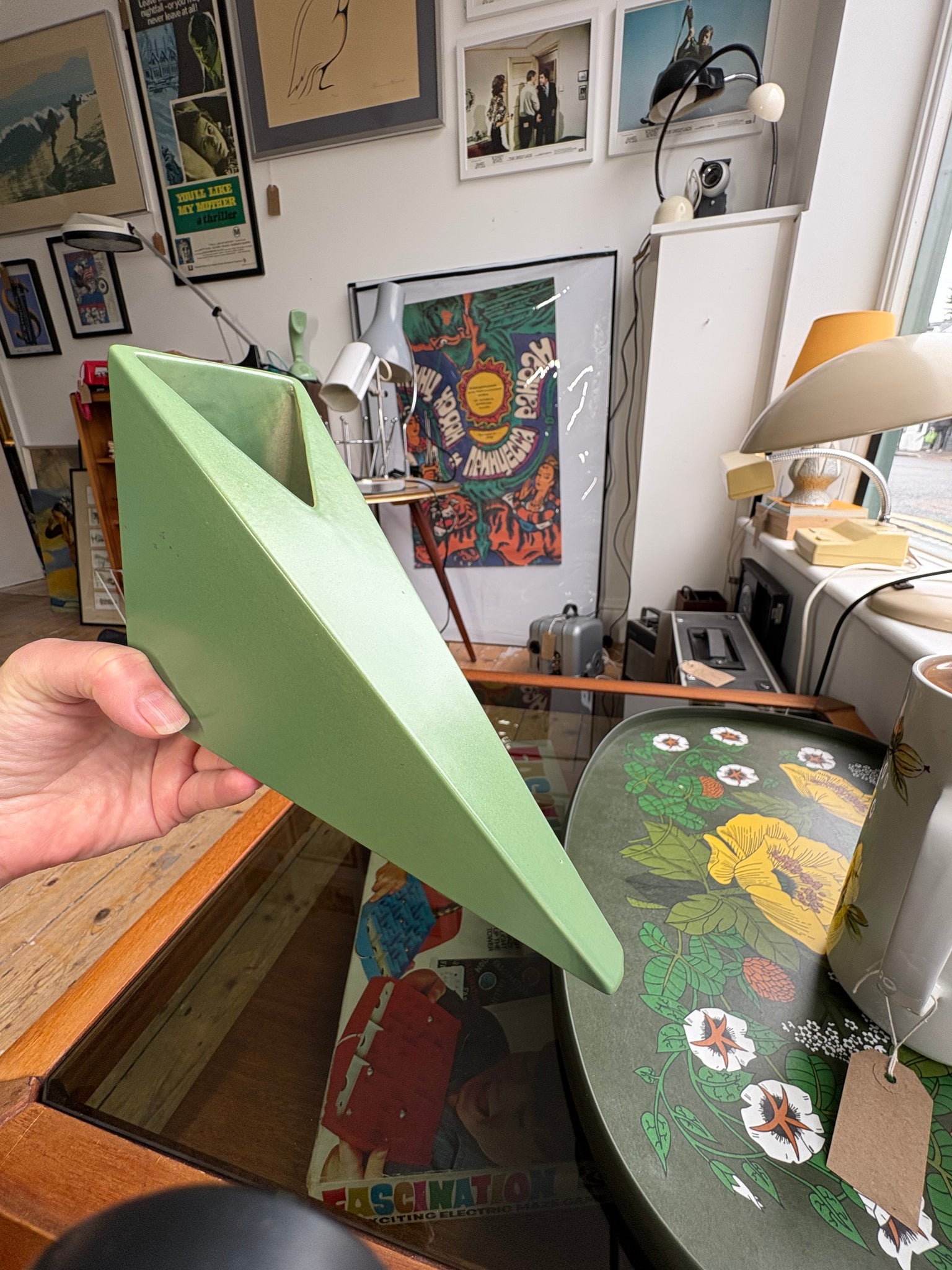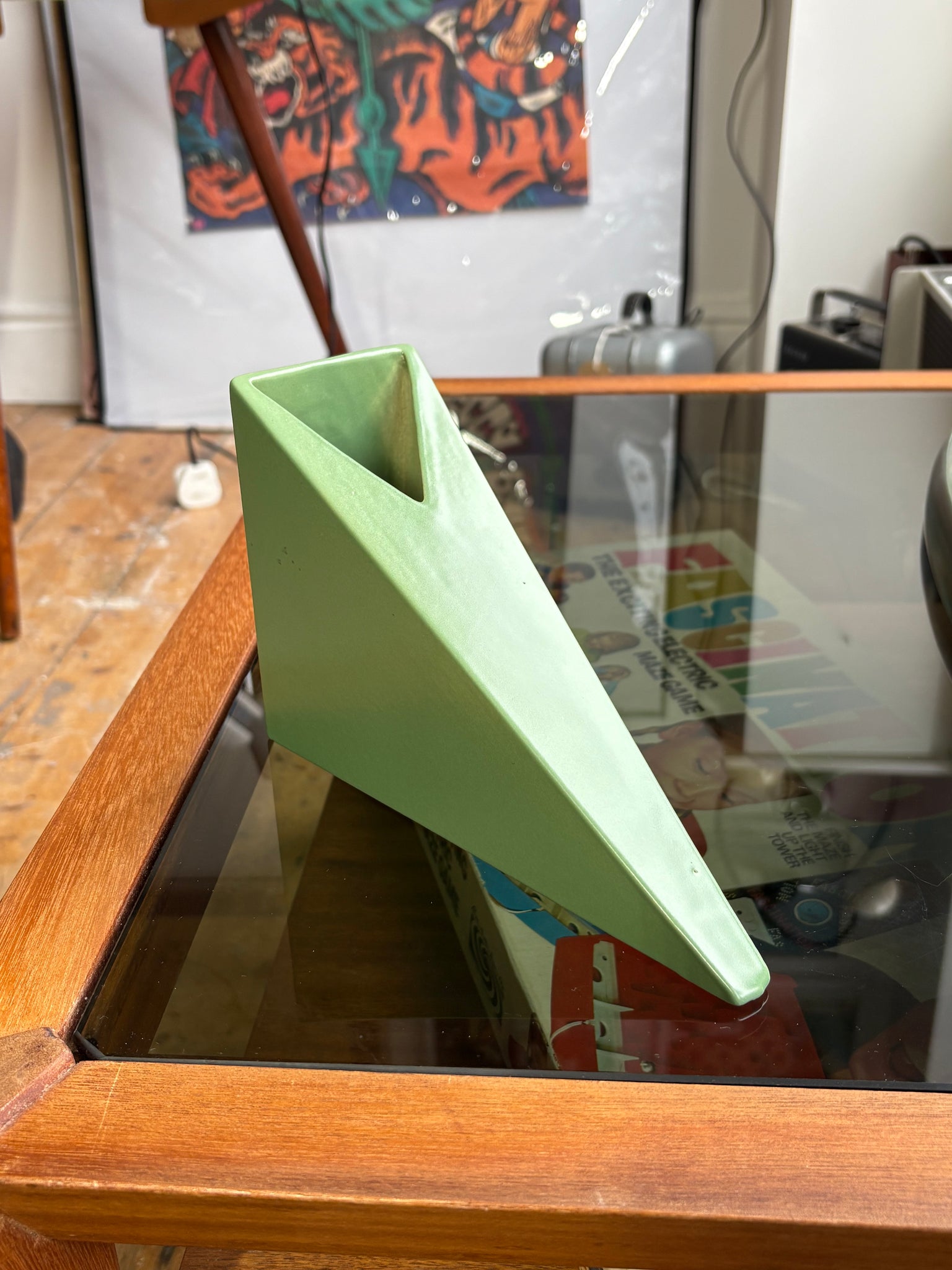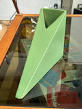 This striking 1980s ASA Selection wedge-shaped vase is a perfect example of late 20th-century West German design. With its sculptural, geometric form and soft green satin glaze, it embodies the clean, experimental aesthetic of postmodern ceramics.