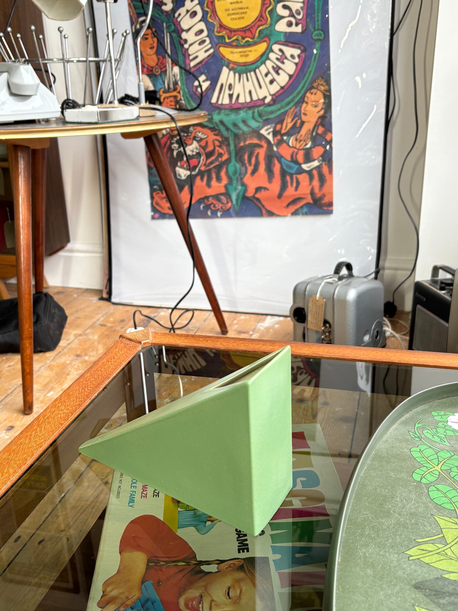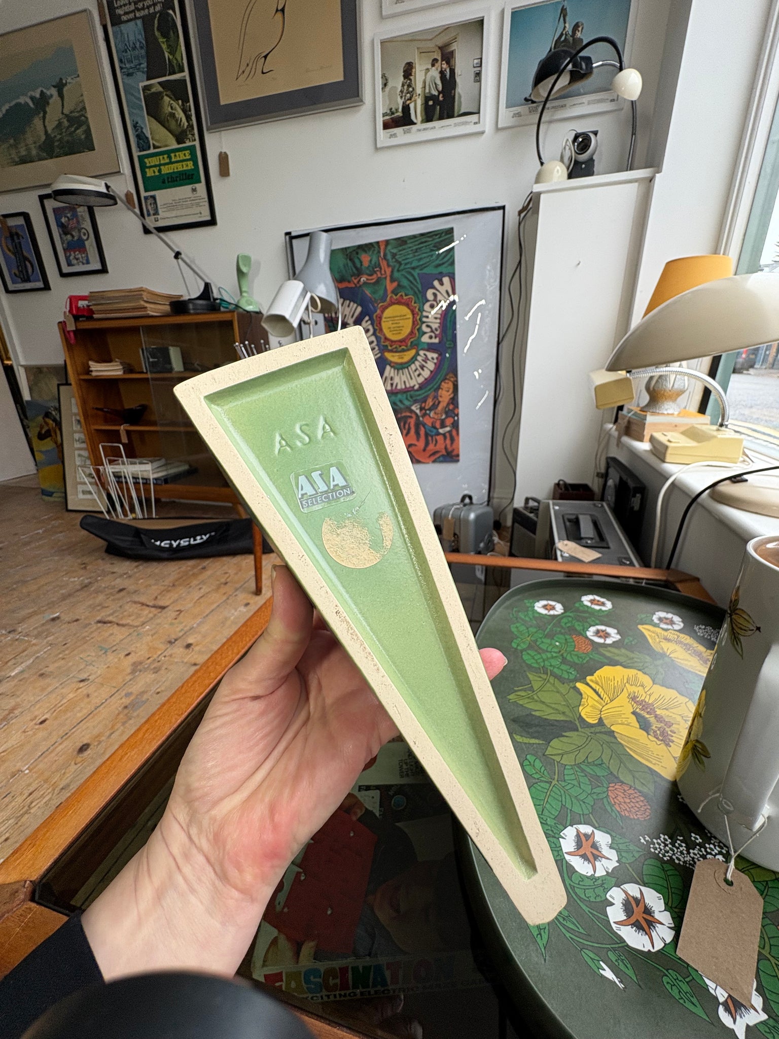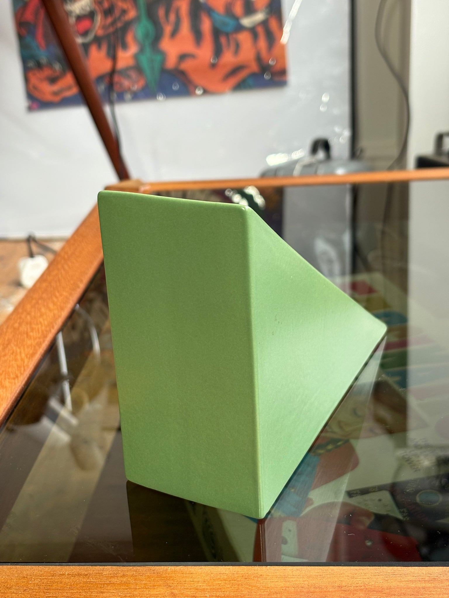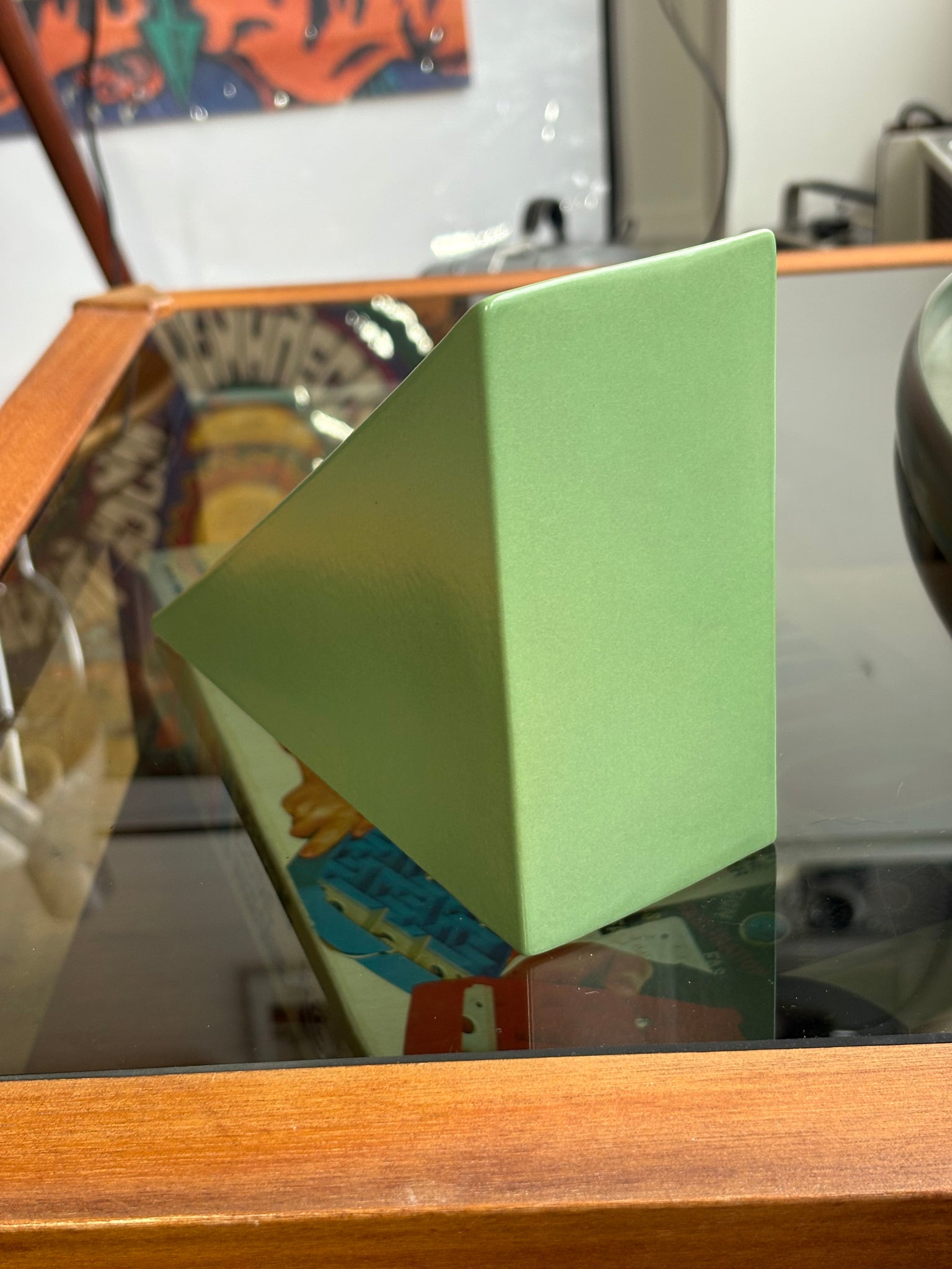 This striking 1980s ASA Selection wedge-shaped vase is a perfect example of late 20th-century West German design. With its sculptural, geometric form and soft green satin glaze, it embodies the clean, experimental aesthetic of postmodern ceramics.