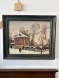 A striking Impressionist oil on canvas from the Russian School, signed and dating to the mid/late 20th century. This atmospheric winter scene is painted with a confident, professional hand, showing a snow-covered street with figures and traditional architecture in the background.