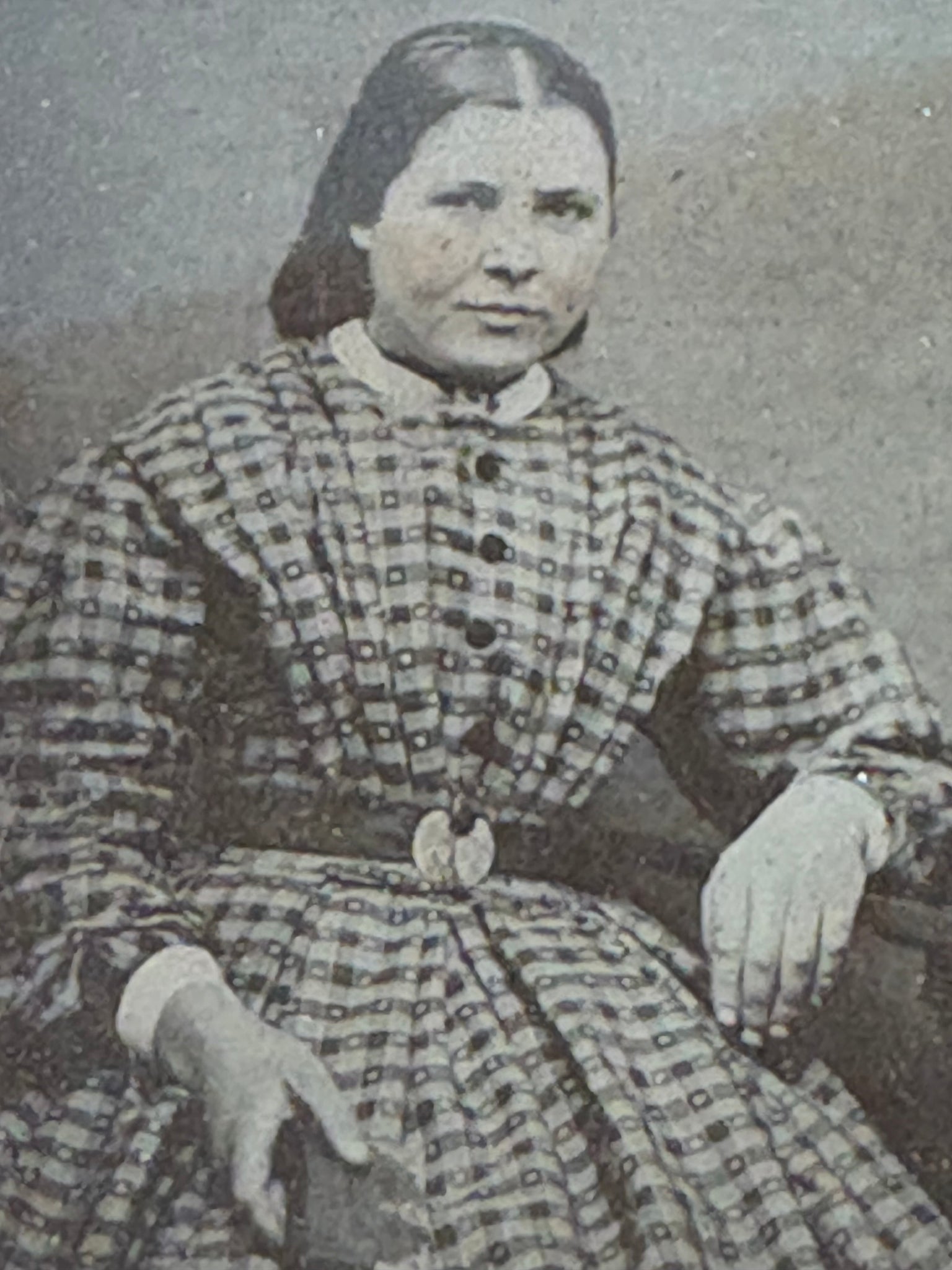 A striking antique daguerreotype portrait of a young woman in Victorian dress, dating to the mid-19th century. The sitter wears a checked gown with wide sleeves and belt, typical of the 1850s–1860s, and is posed with a calm, direct expression.