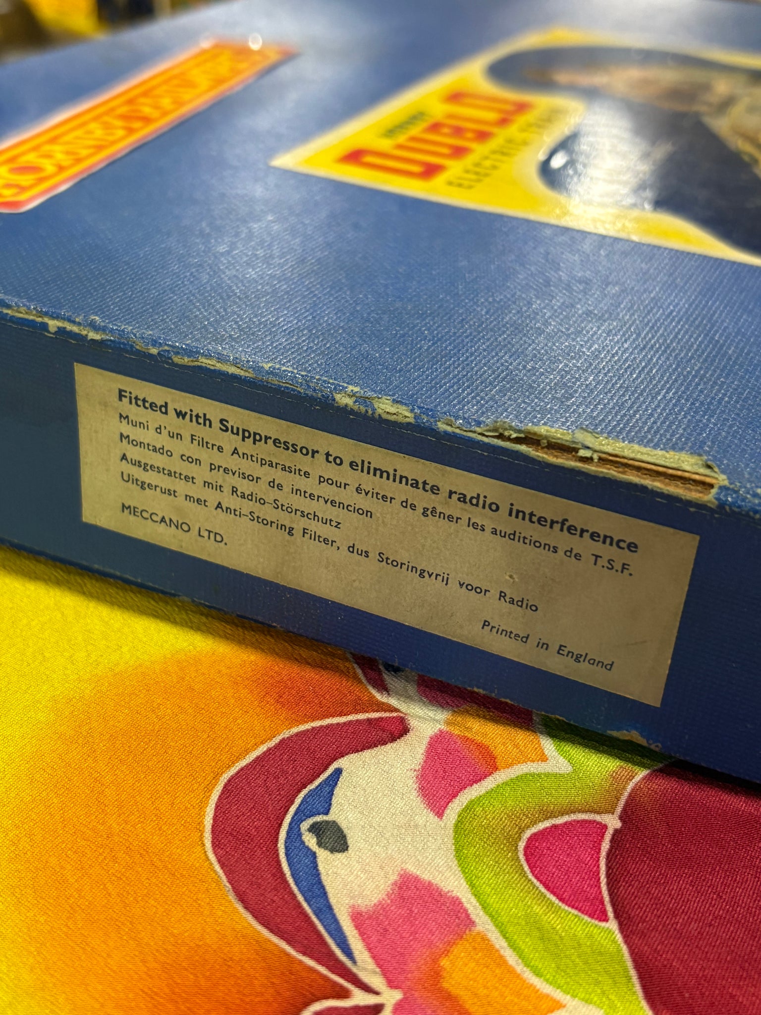 Condition is lovely throughout. The track and rolling stock are clean with only light age wear, and the locomotive retains its bright lining and numbering. The box shows a little rubbing and edge wear, as expected for its age, but remains sturdy and displays beautifully.