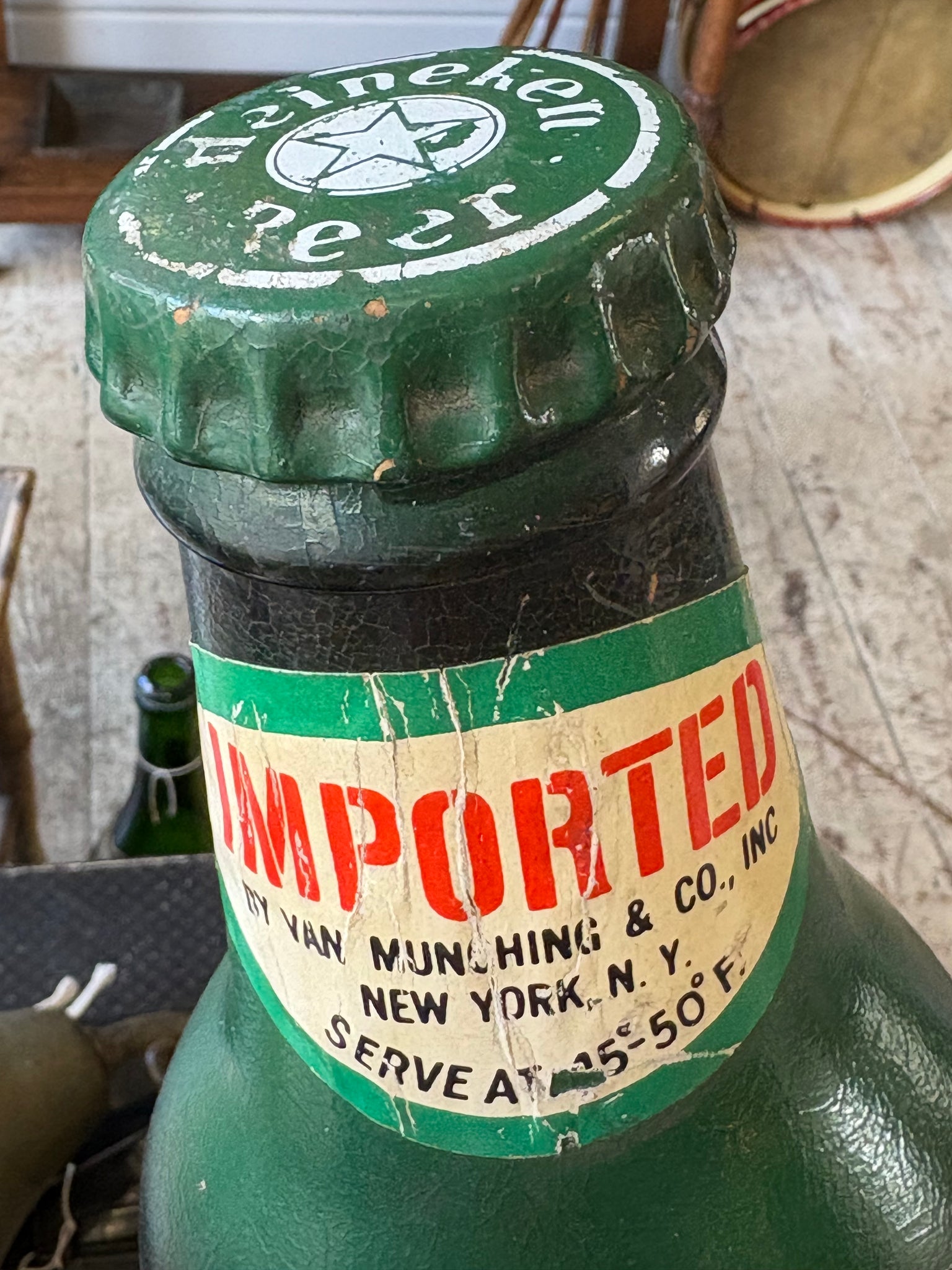 The display features a large stylised Heineken bottle alongside a cheerful figure in traditional dress enjoying a pipe, all mounted on a textured base with “Heineken Beer” lettering. The oversized bottle carries the classic Heineken label design, including the “Imported” neck label referencing the New York importer Van Munching & Co.