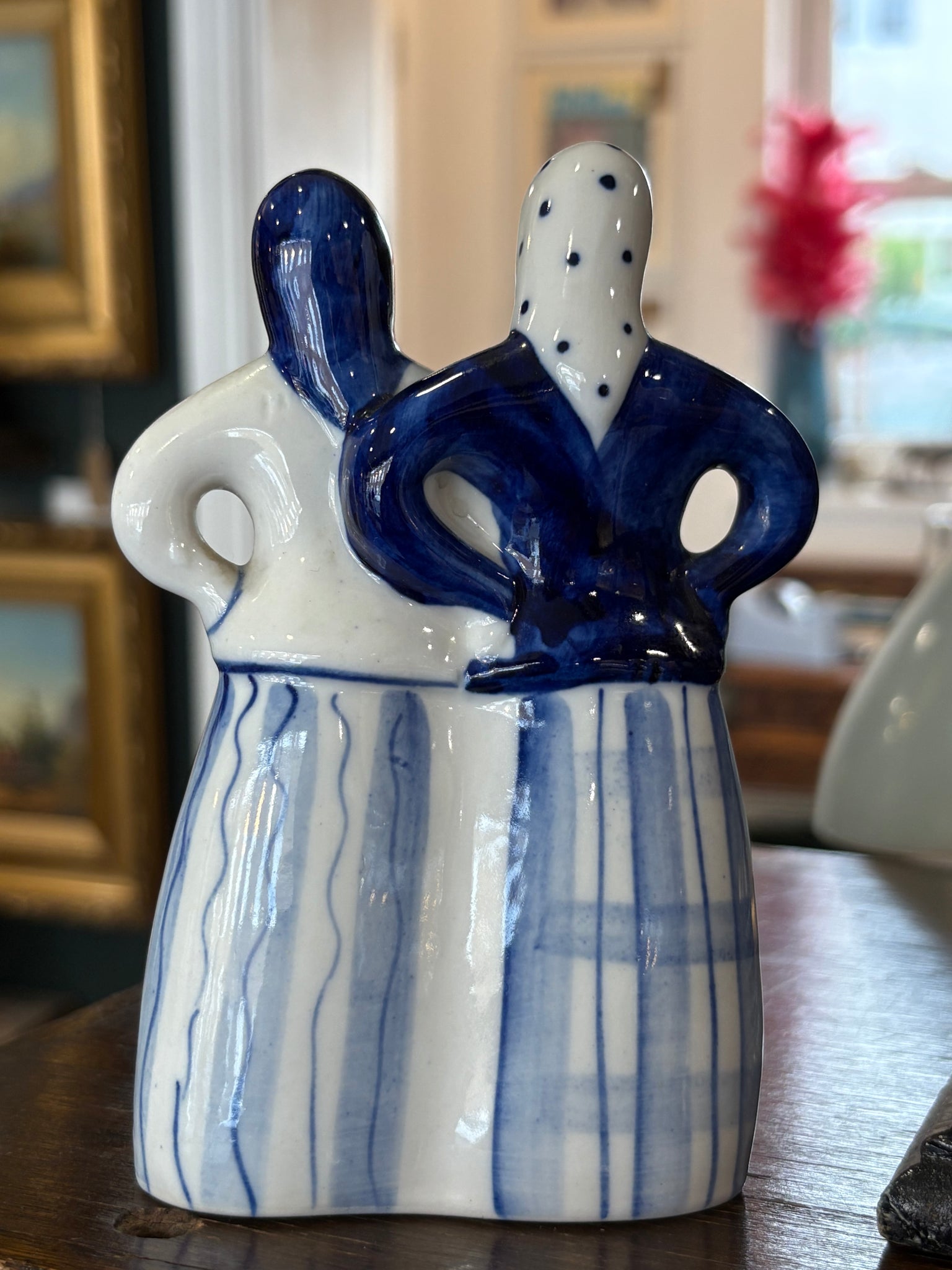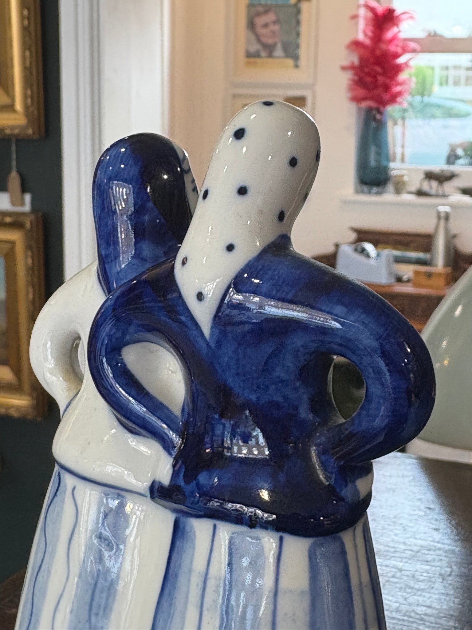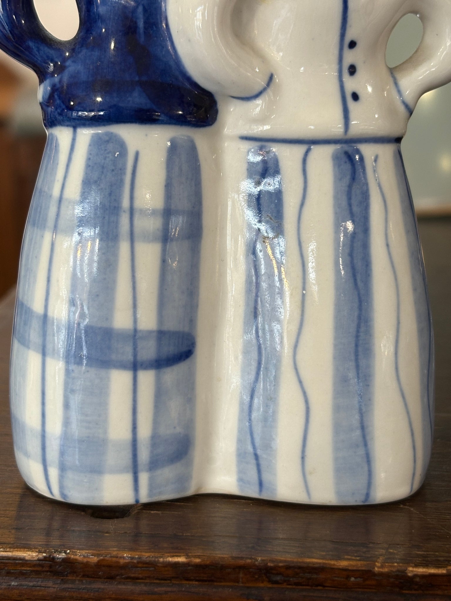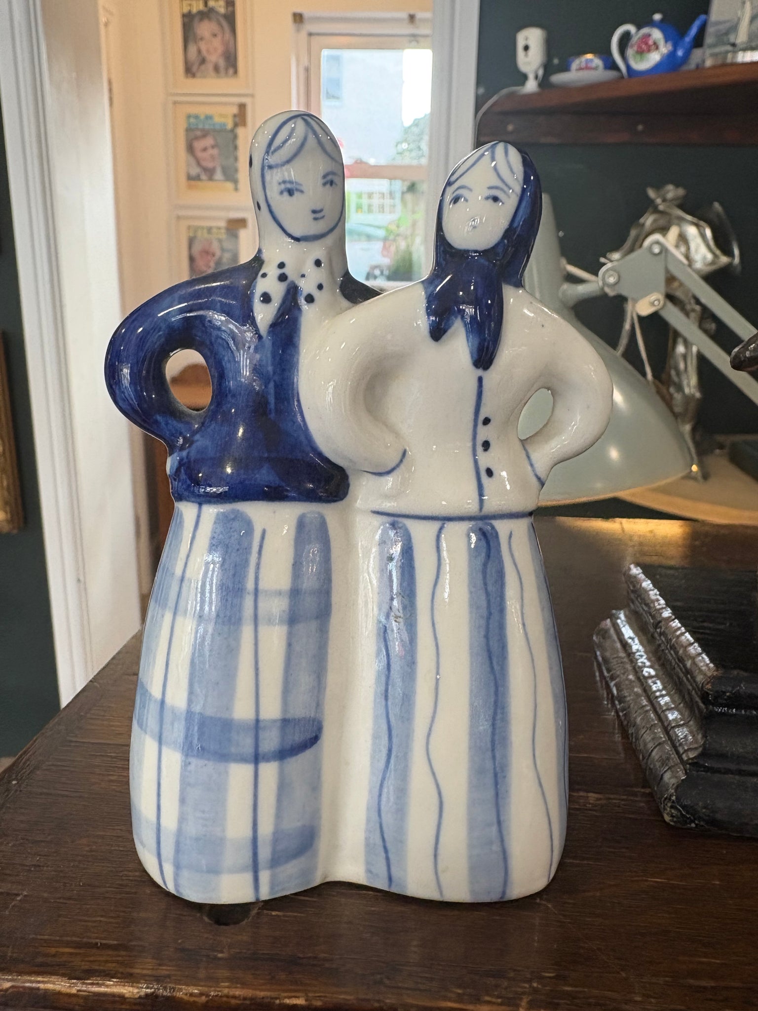 Beautiful vintage Gzhel porcelain figurine depicting two peasant women standing arm in arm, hand painted in classic blue and white glaze.