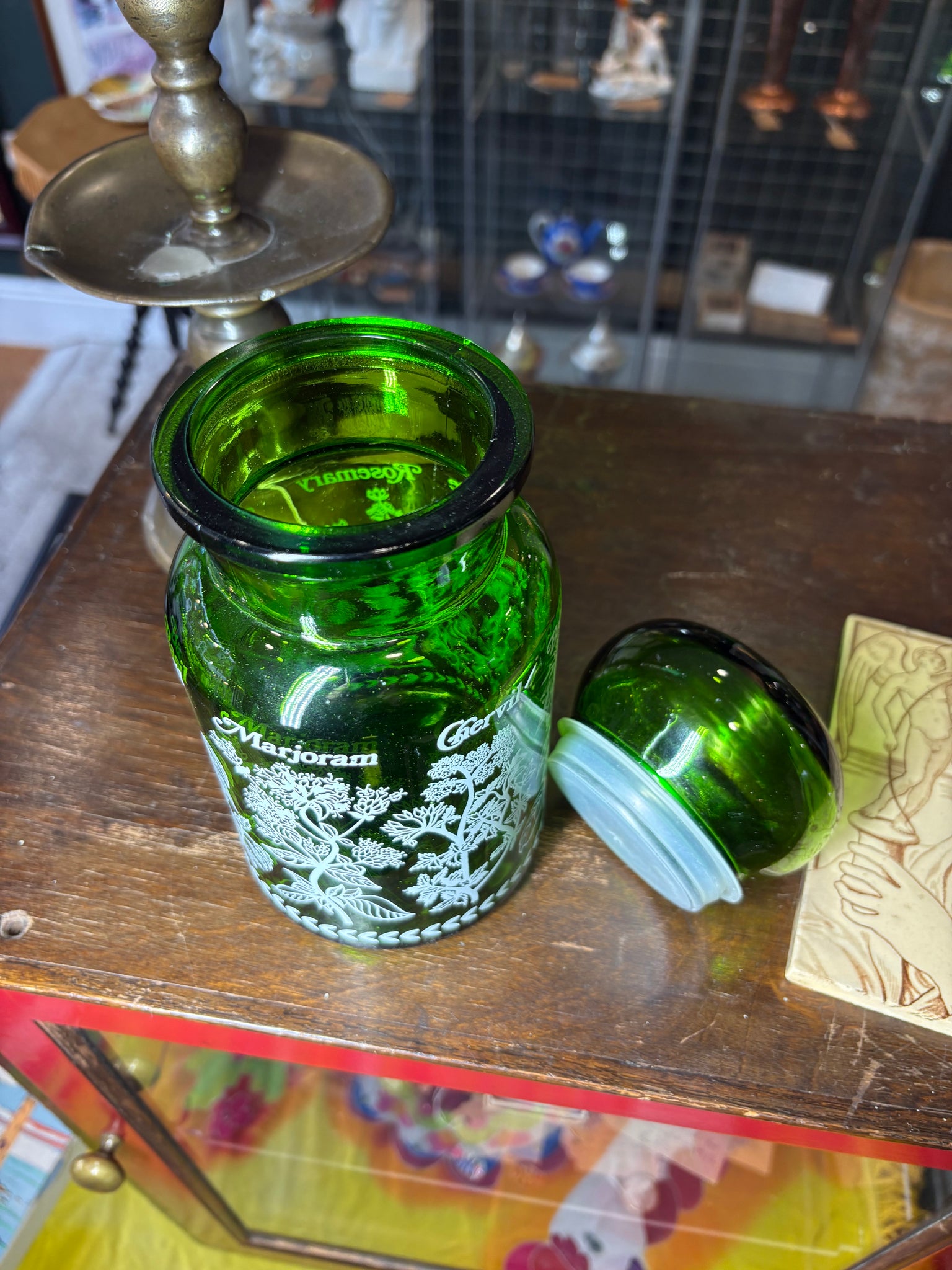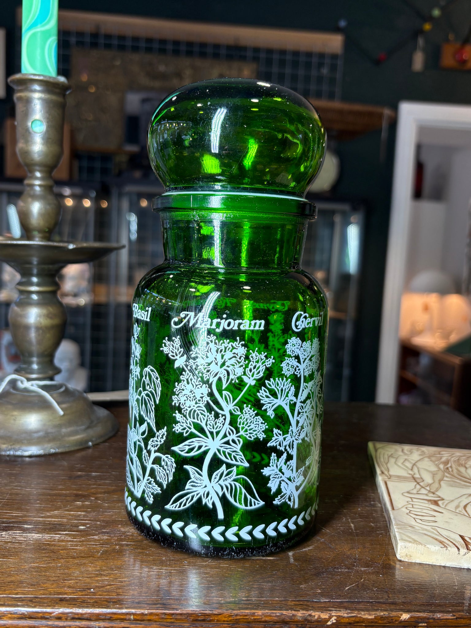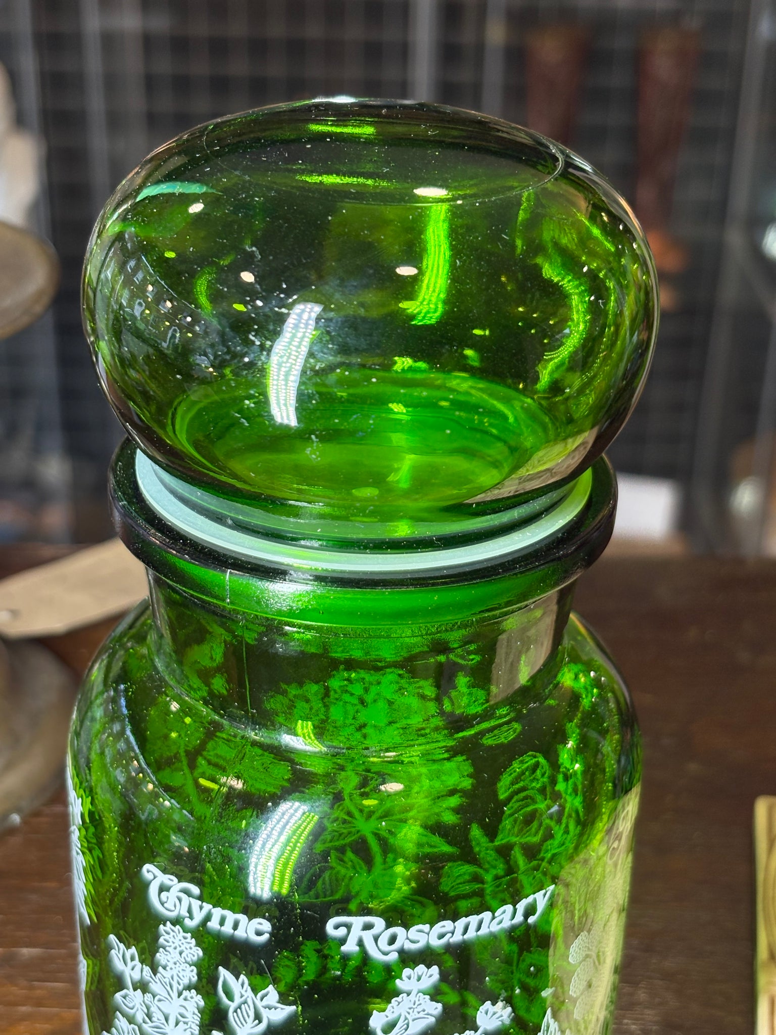 This striking vintage green glass apothecary jar was made in Belgium and dates from the 1960s–1970s. Decorated with a white printed herb design featuring thyme, rosemary, basil, marjoram, chervil, and bergamot, it brings a touch of botanical elegance to any space.