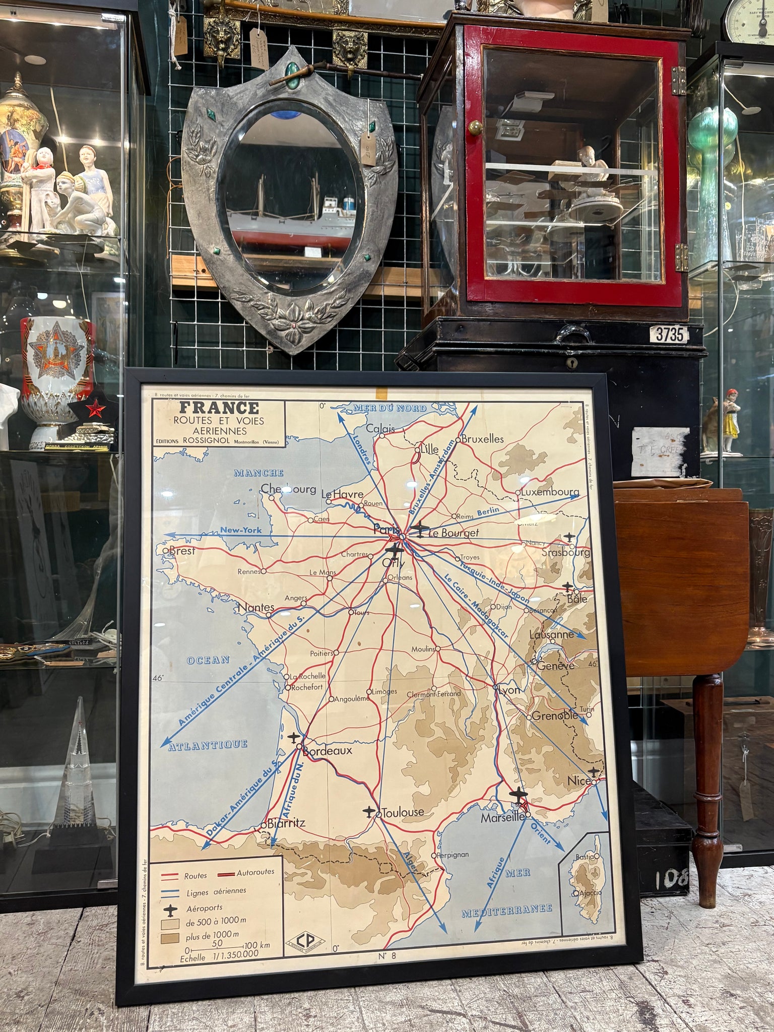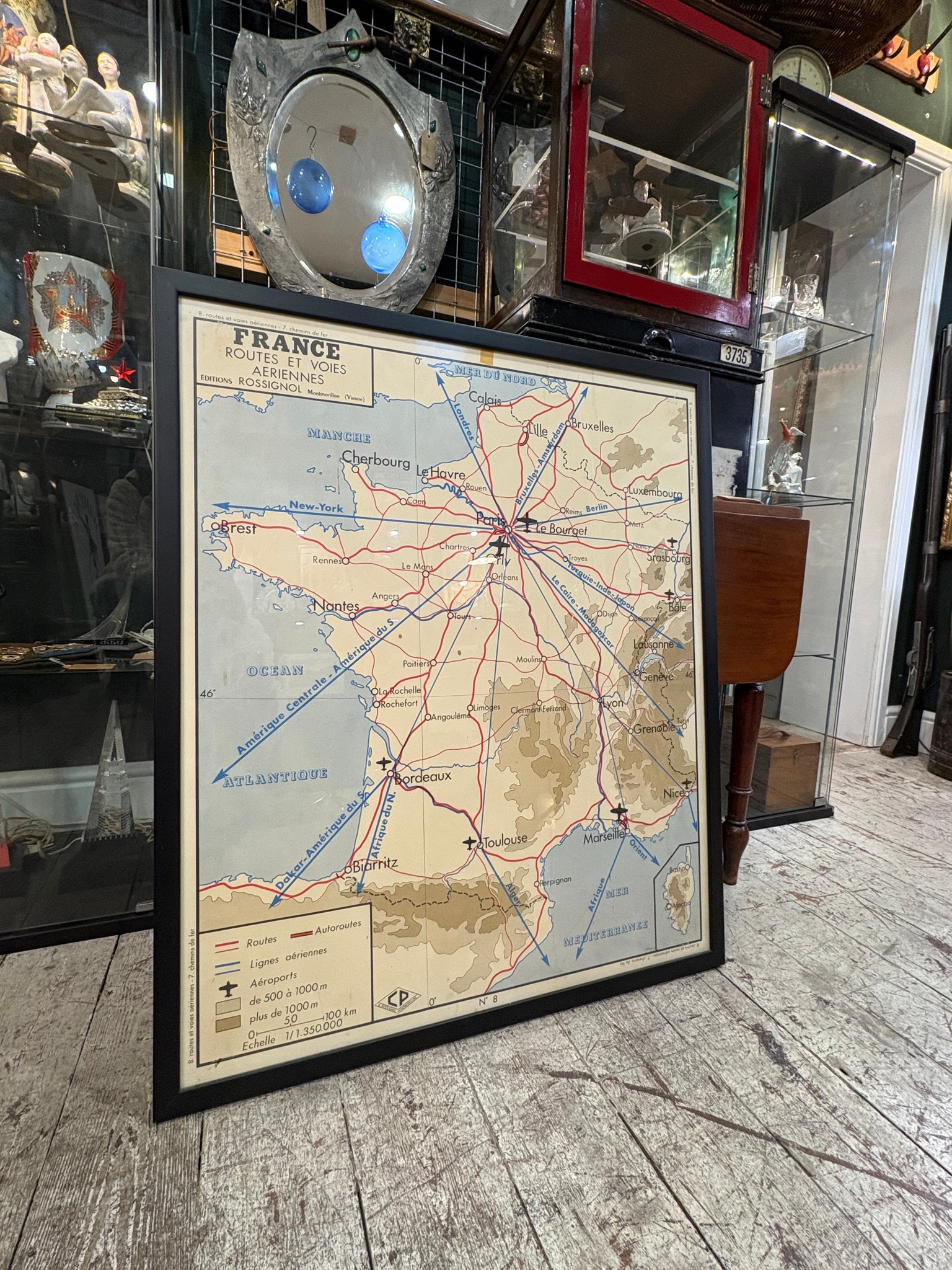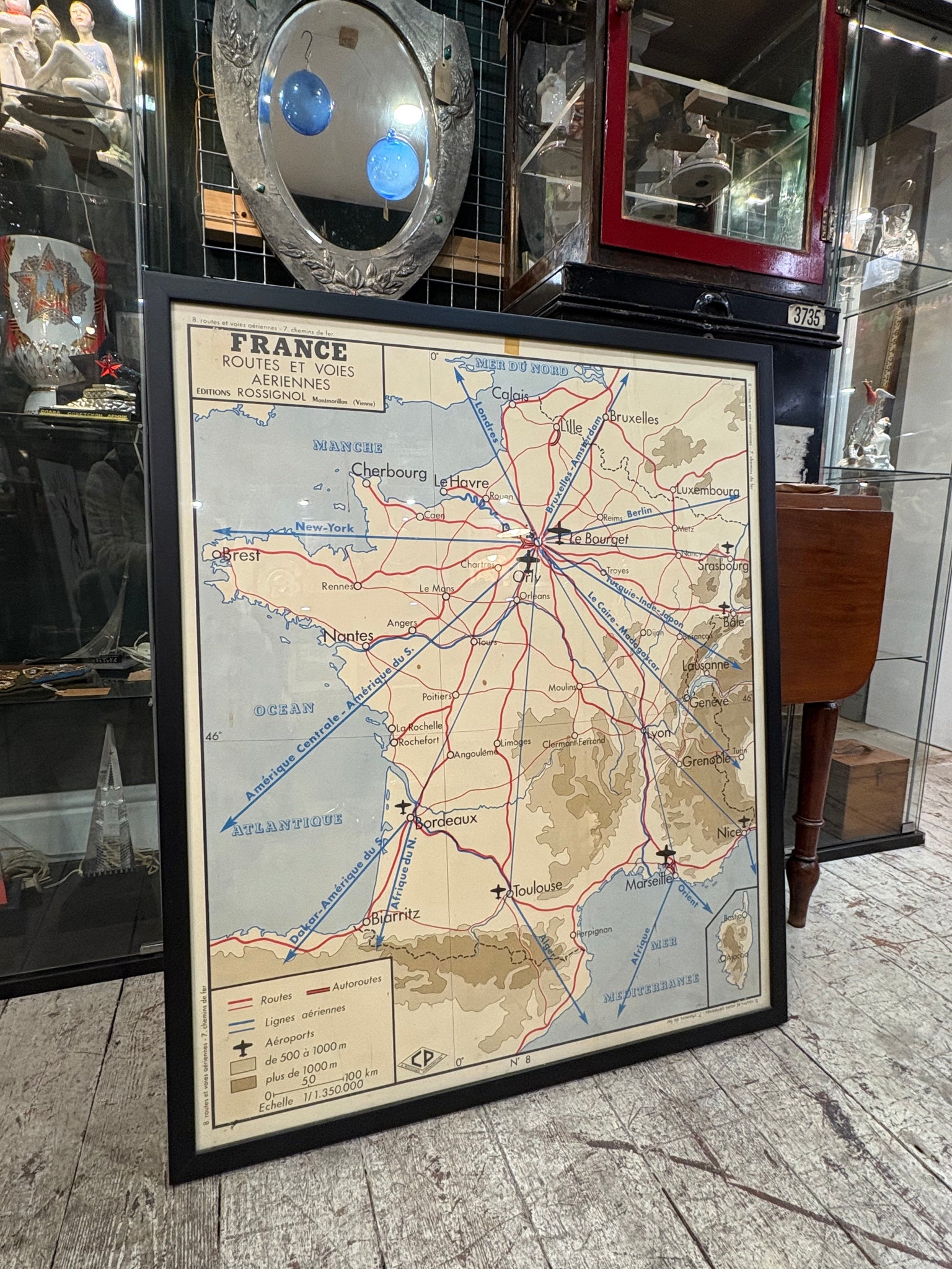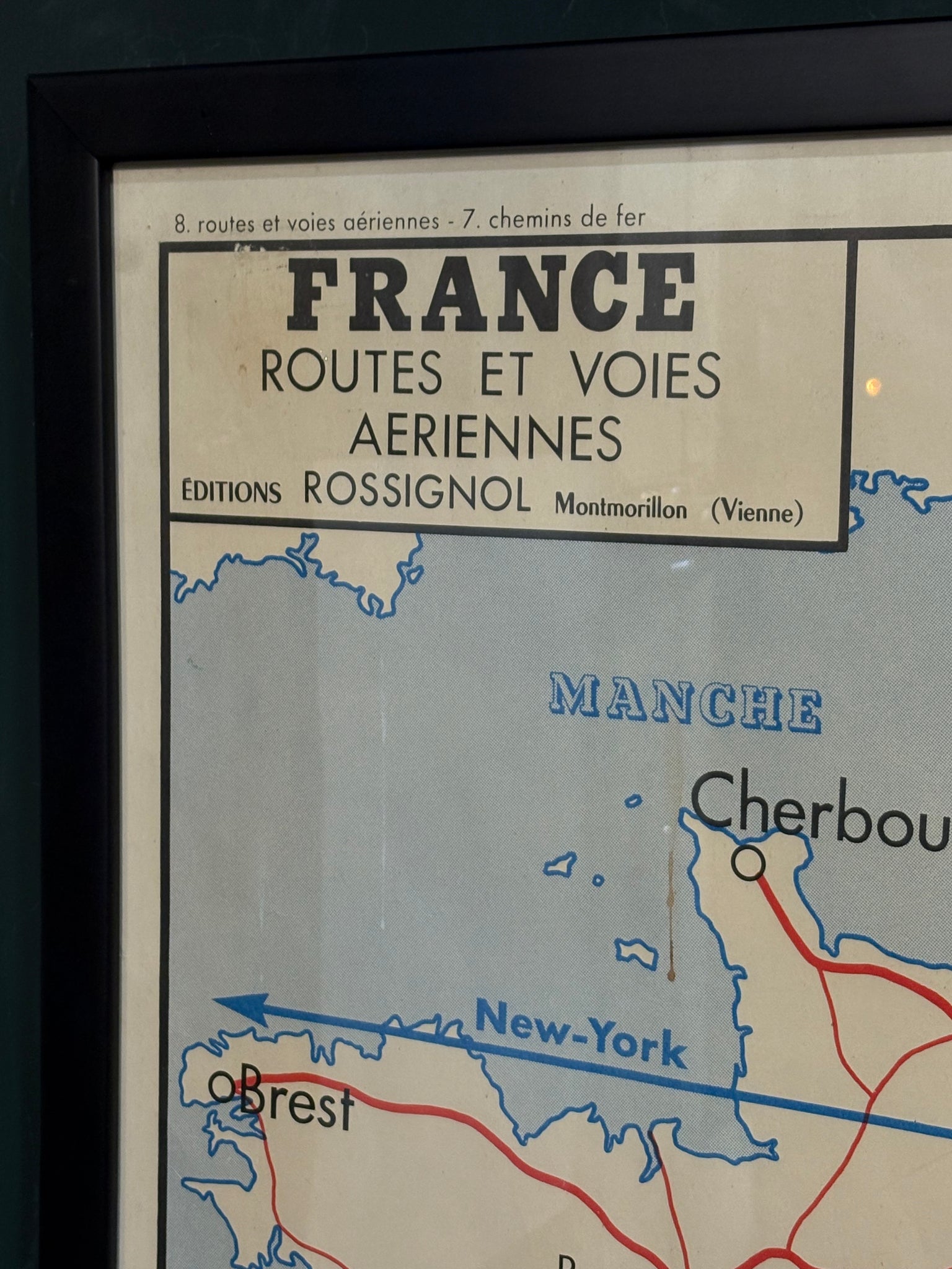 Vintage French Wall Map – “Routes et Voies Aériennes”, Éditions Rossignol, Mid-Century