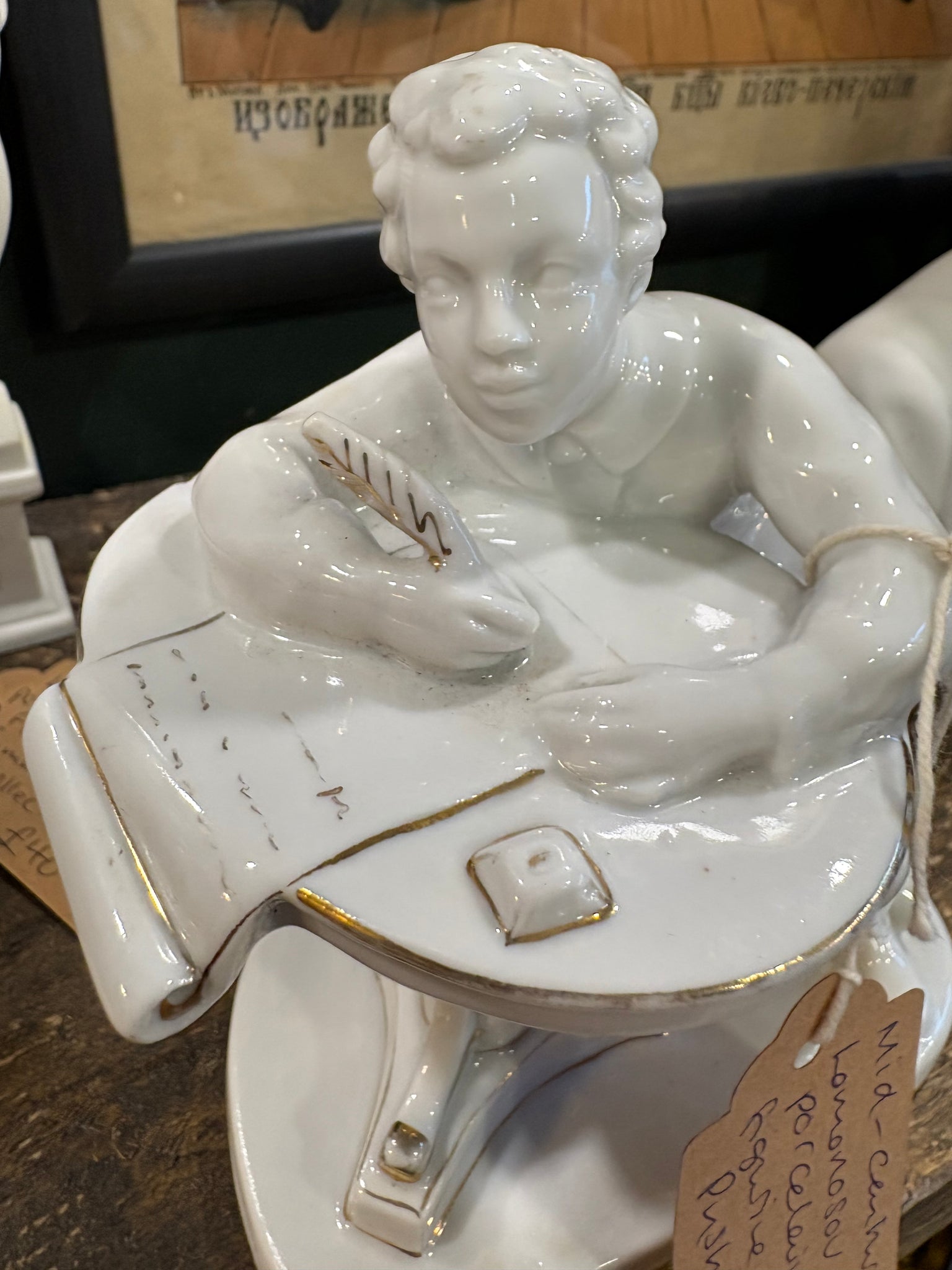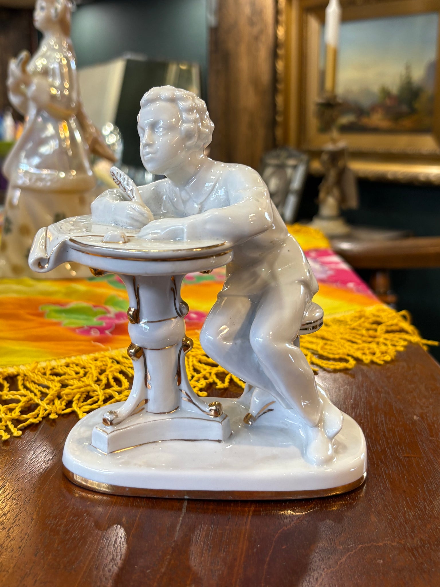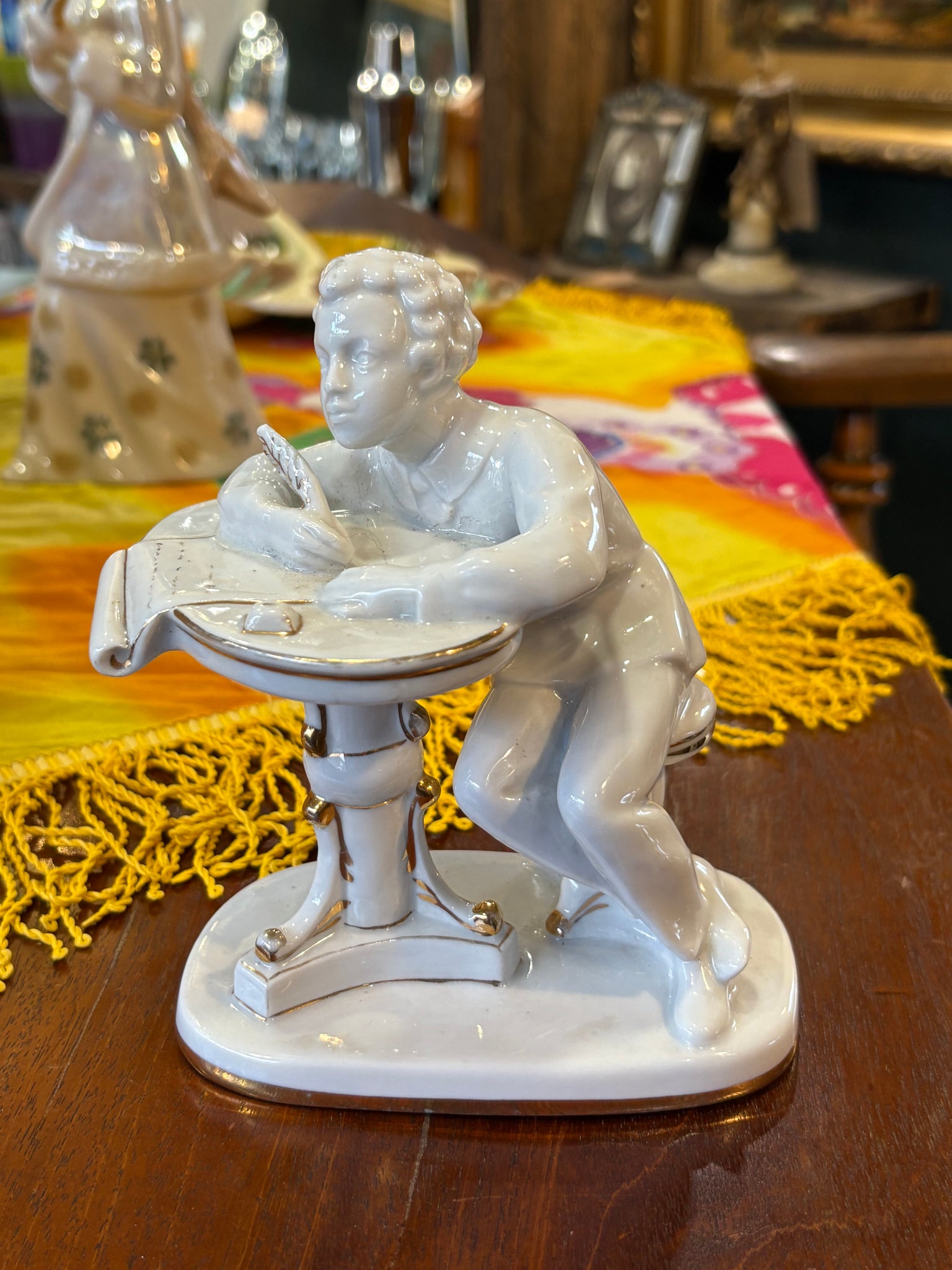 A wonderfully characterful vintage Lomonosov porcelain figurine showing the great Russian poet Pushkin caught in a moment of inspiration. He’s perched at his writing desk, quill in hand, leaning forward with that familiar air of quiet concentration.