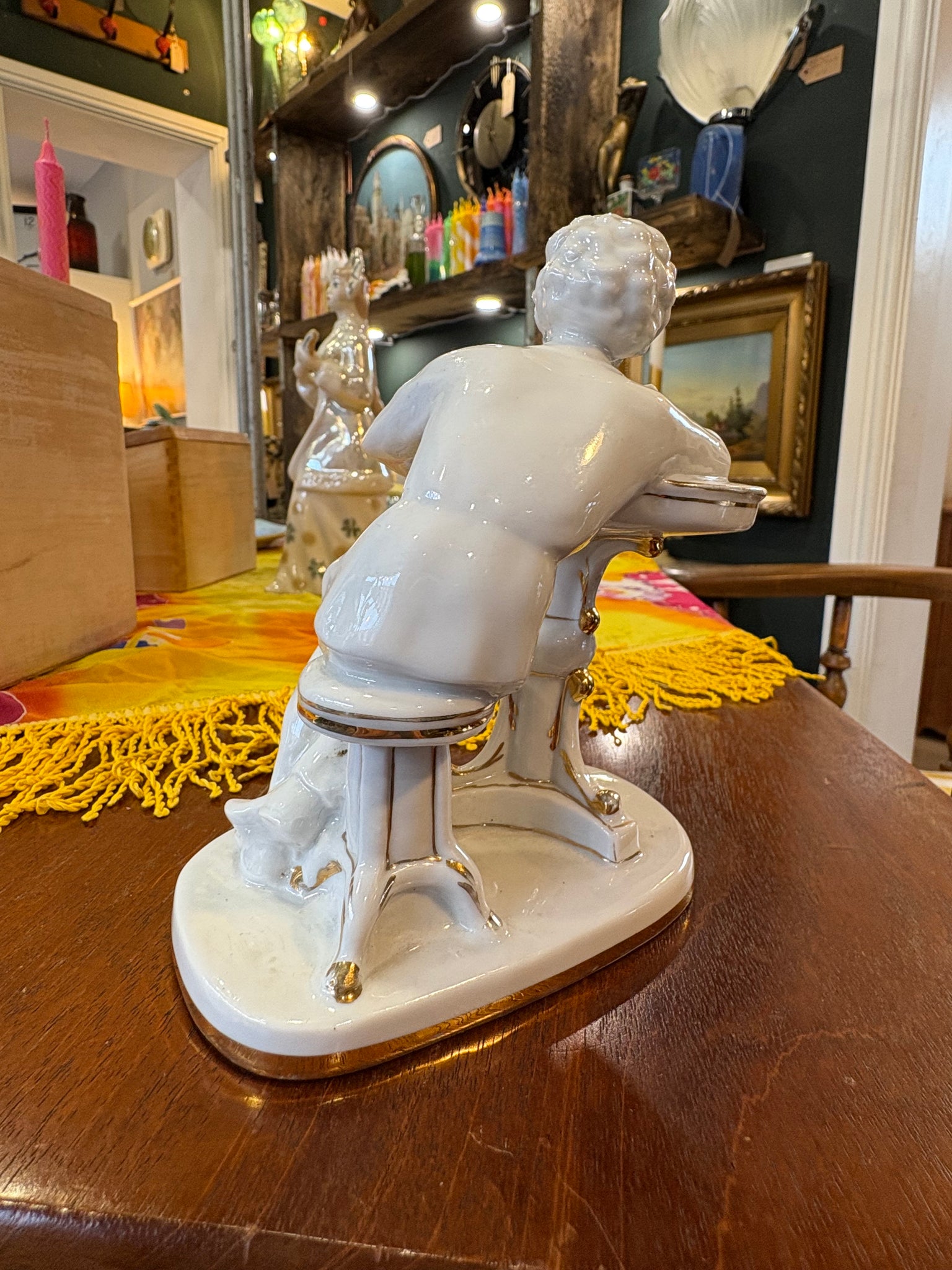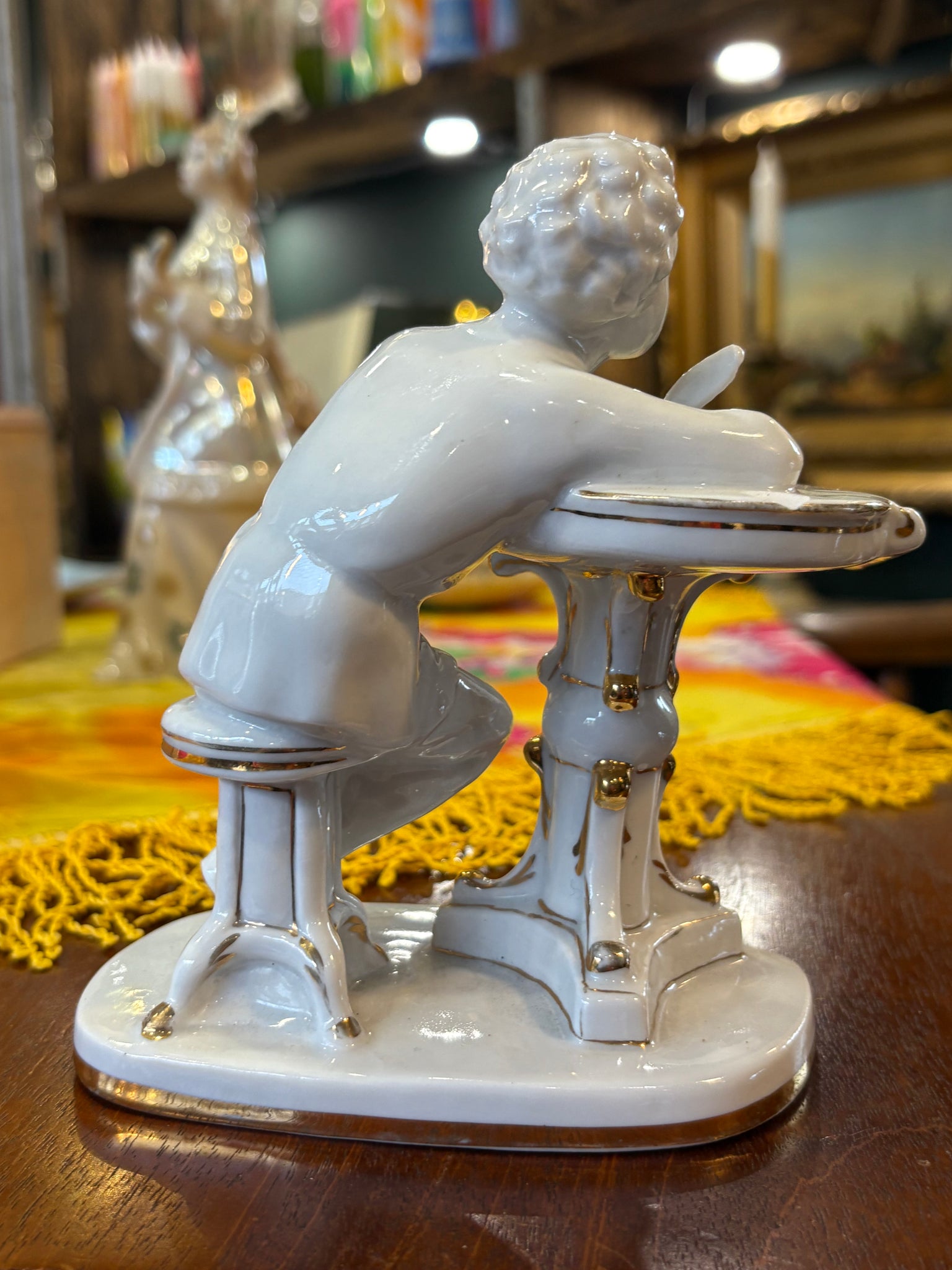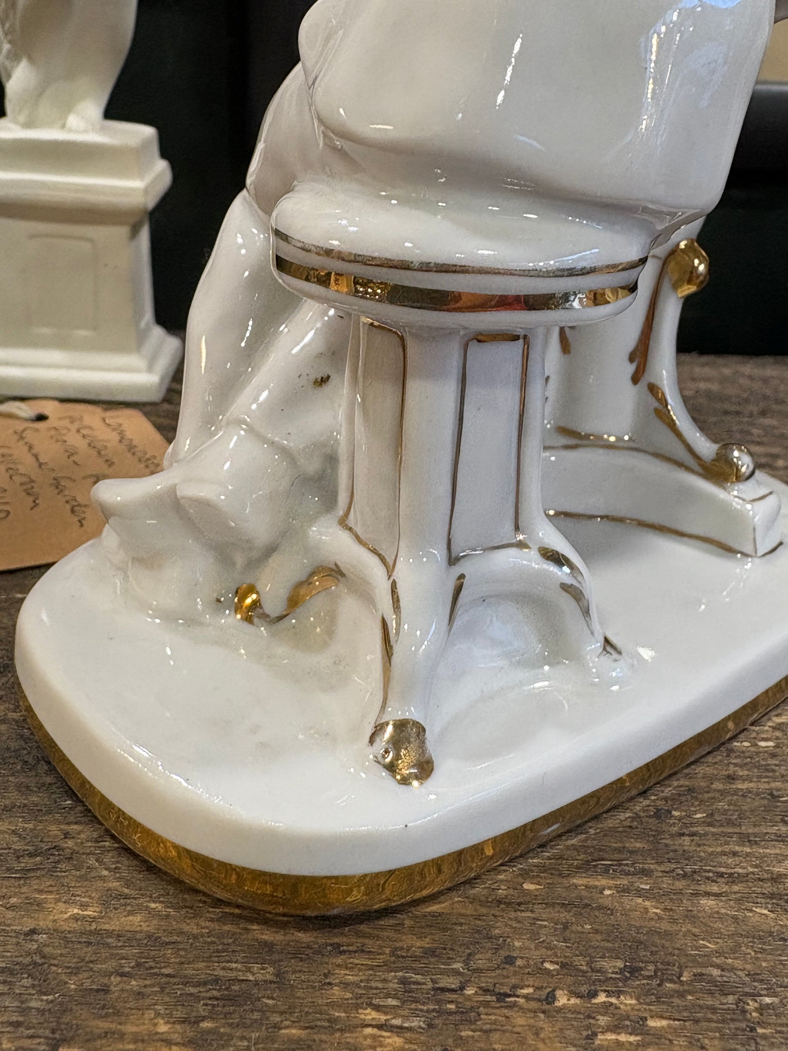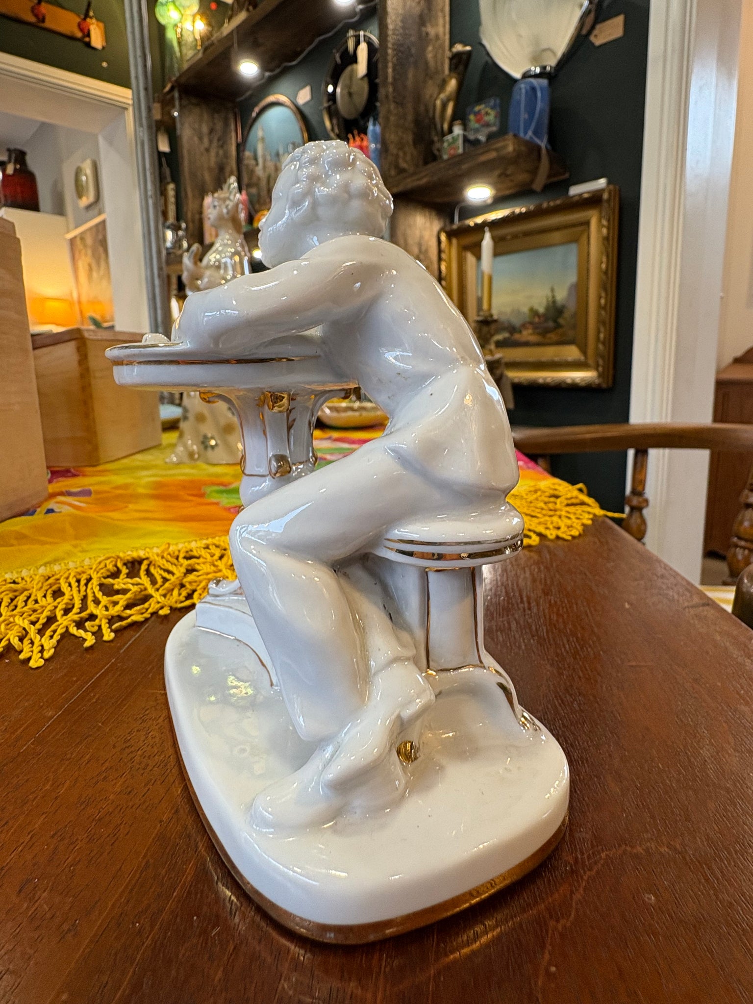A wonderfully characterful vintage Lomonosov porcelain figurine showing the great Russian poet Pushkin caught in a moment of inspiration. He’s perched at his writing desk, quill in hand, leaning forward with that familiar air of quiet concentration.