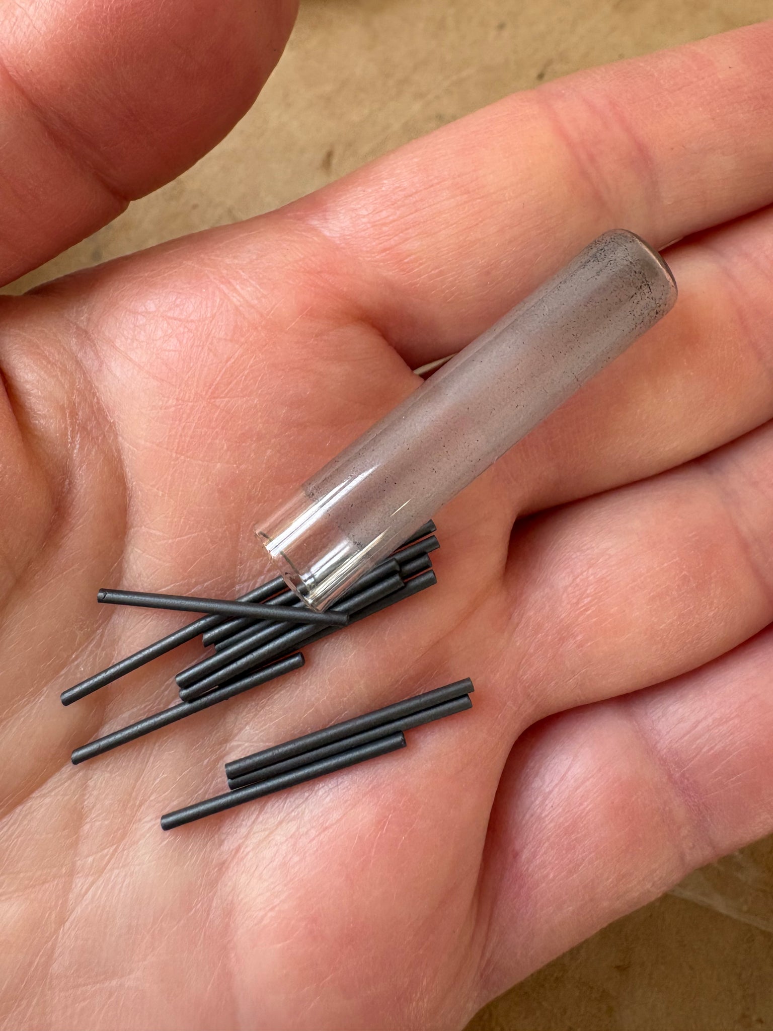The pencil operates using a propelling and repelling mechanism, allowing the lead to be advanced or withdrawn smoothly. The original instruction sheet explains the system and remains with the set, along with the small glass vial that originally held spare leads.