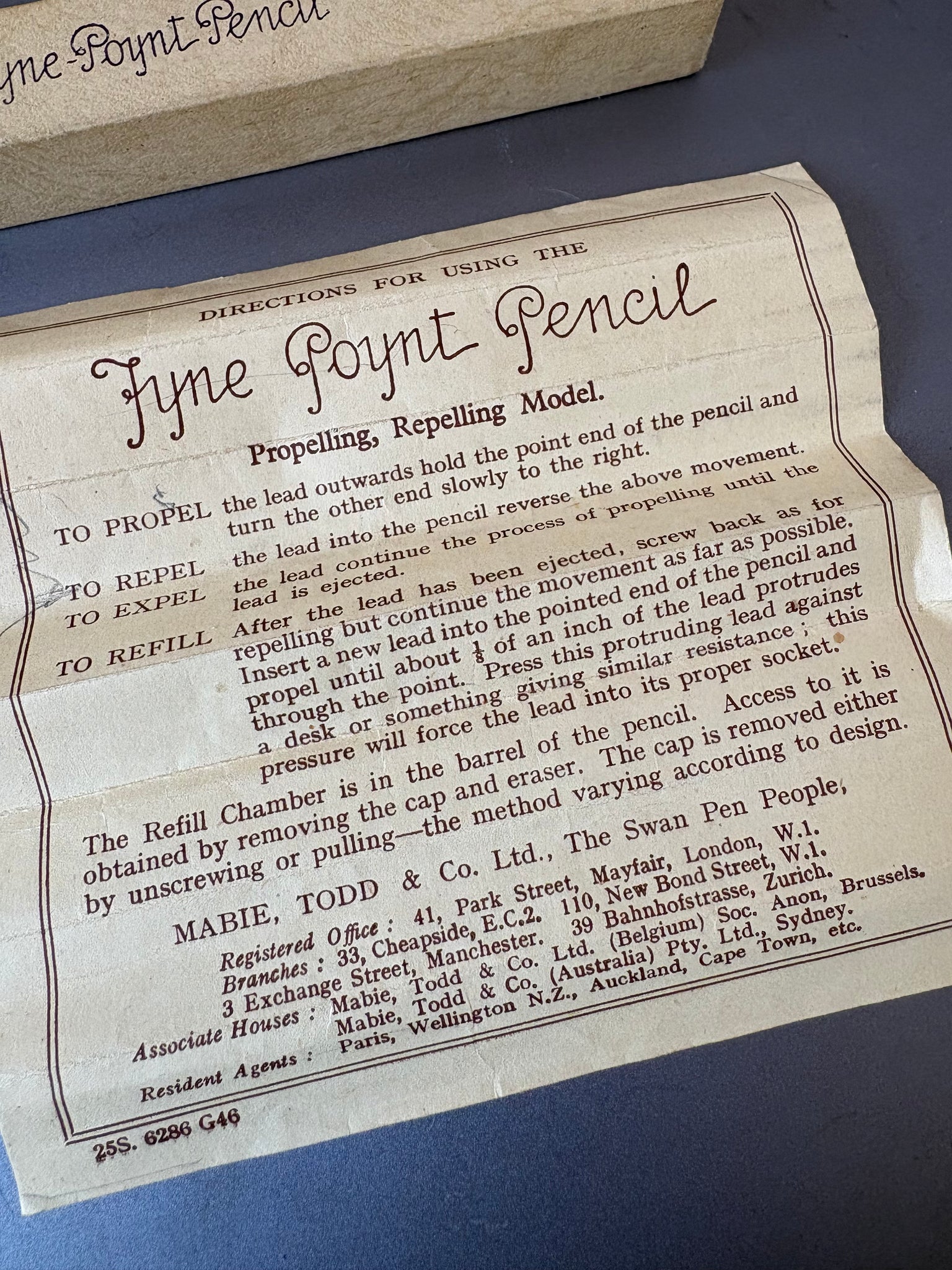 A lovely 1940s Fyne-Poynt propelling pencil by Mabie, Todd & Co., presented in its original box with instruction leaflet and a small vial of spare leads.