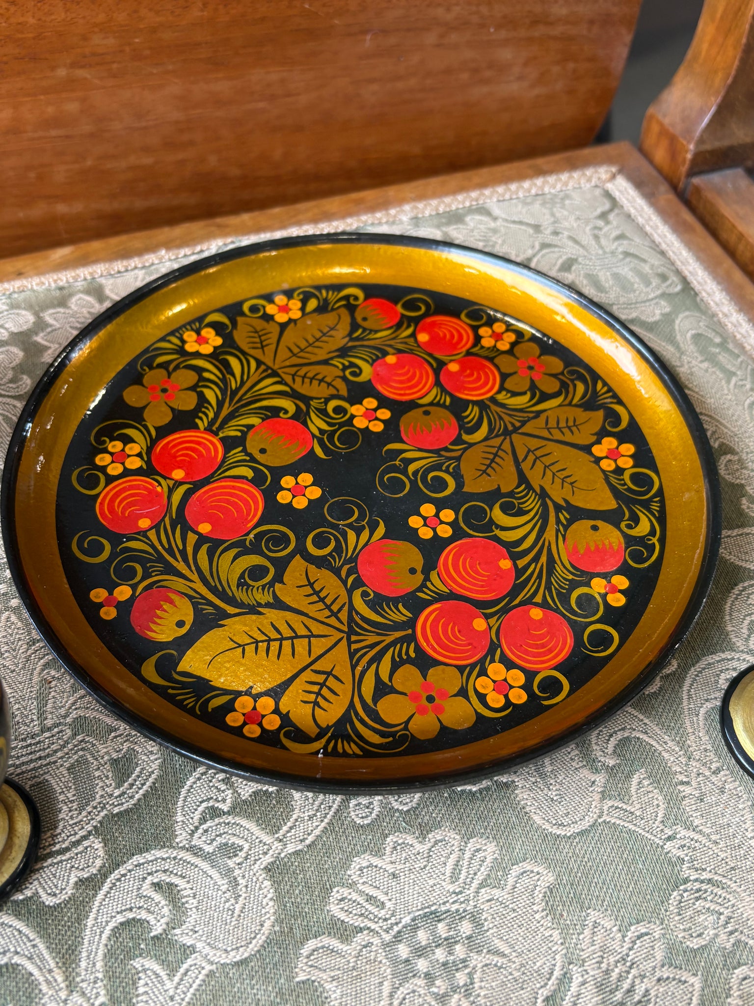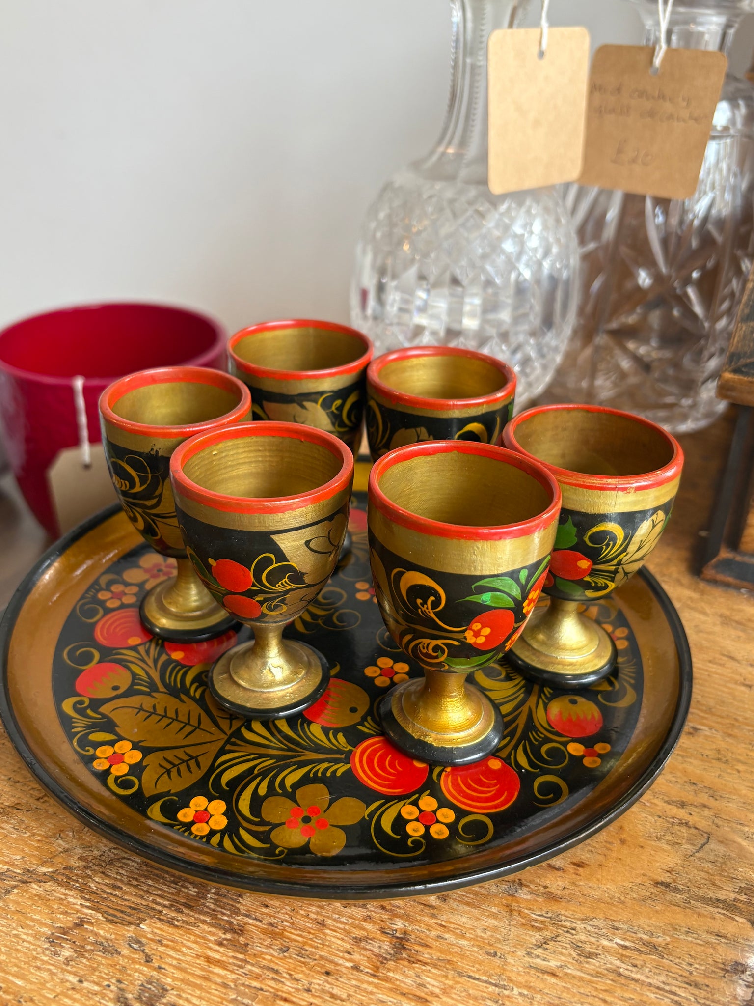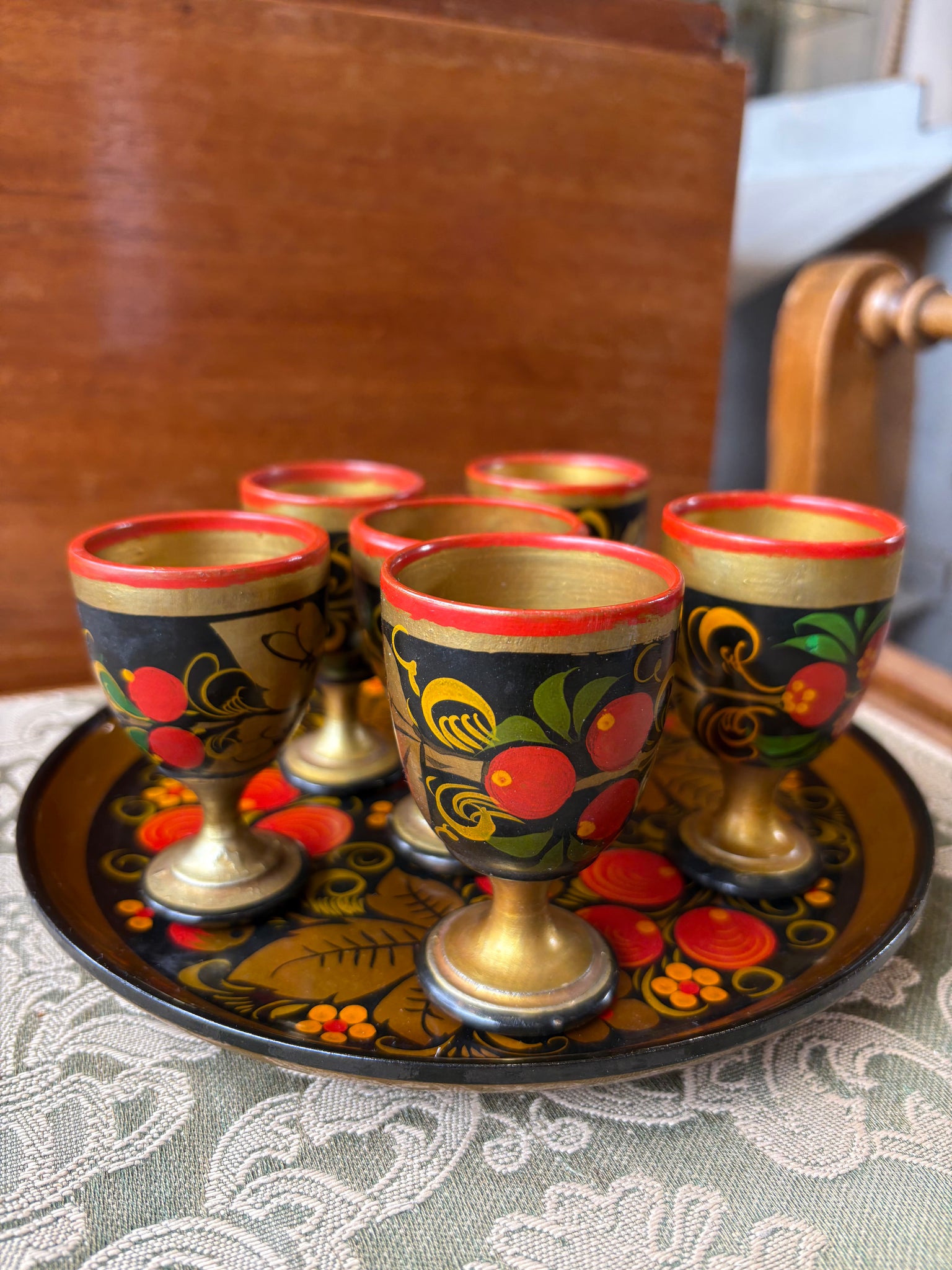 Vintage Russian Khokhloma Egg Cups & Tray Set – Hand Painted Folk Art (6 Pieces)