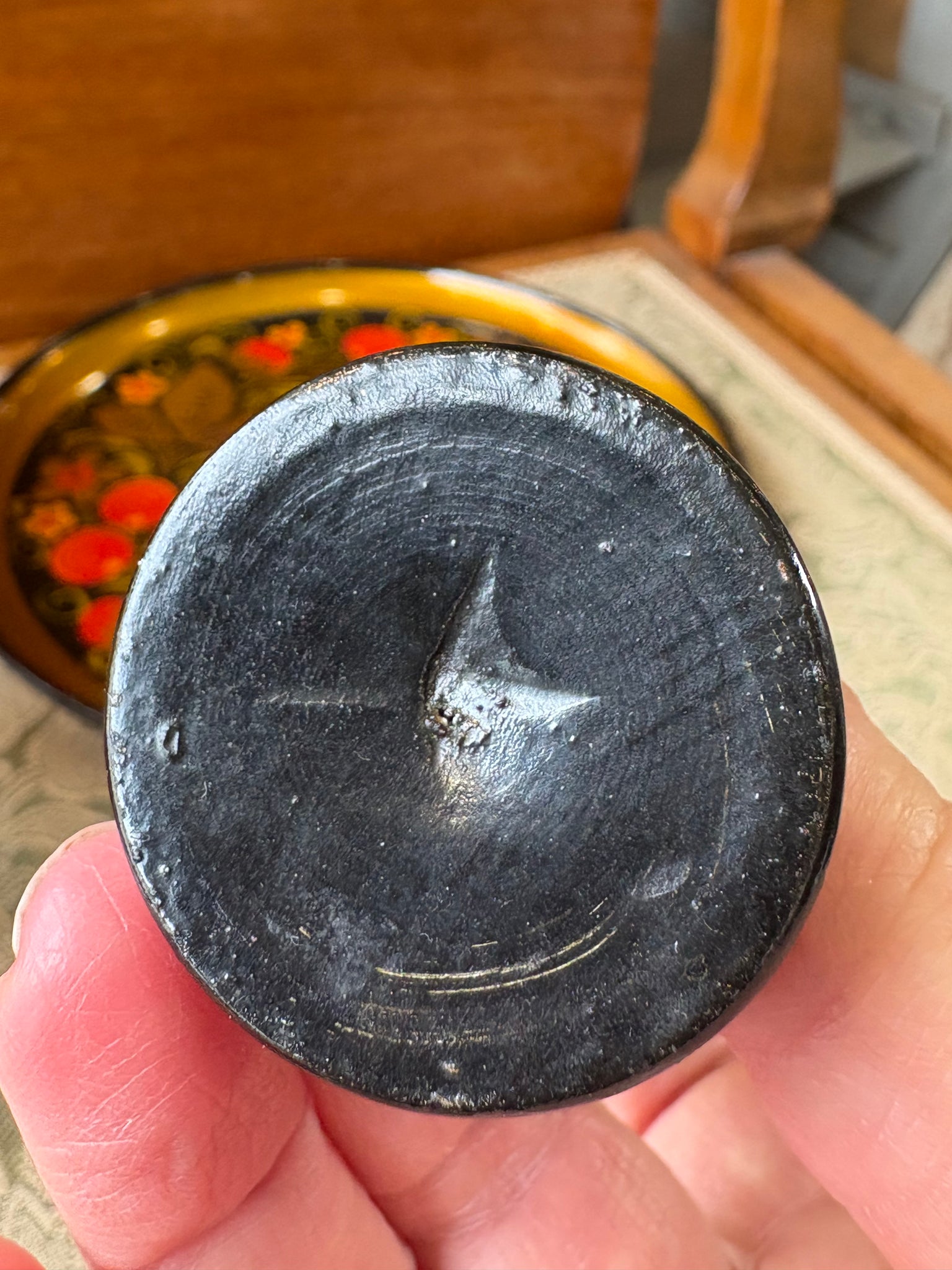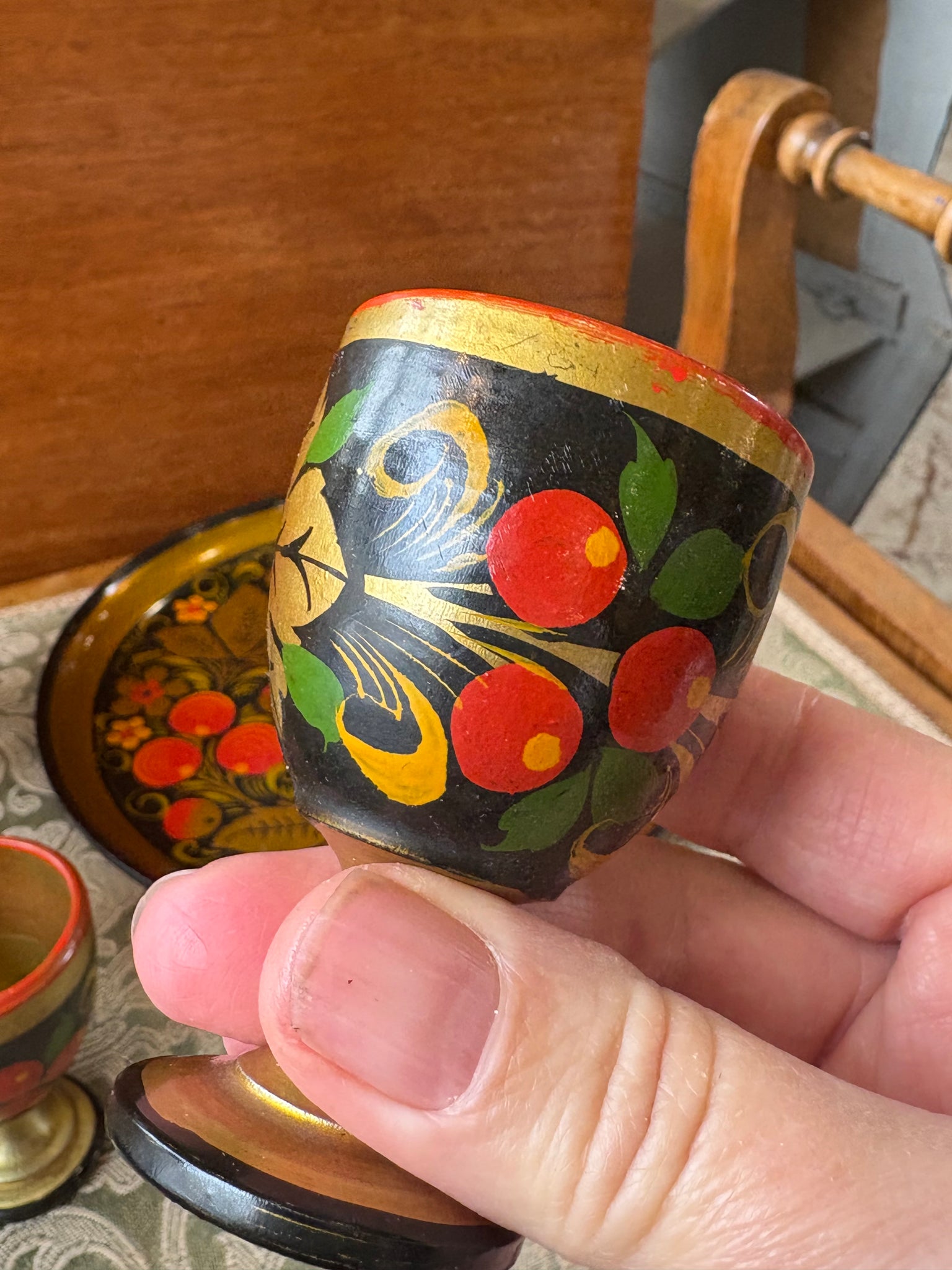 Beautiful set of six traditional Russian Khokhloma wooden egg cups with matching tray. Each piece is hand-painted in rich tones of gold, red, green and black with a classic fruit and floral design. The craftsmanship showcases the timeless beauty of Russian folk art, with every cup slightly different in colour, shape, and detail.