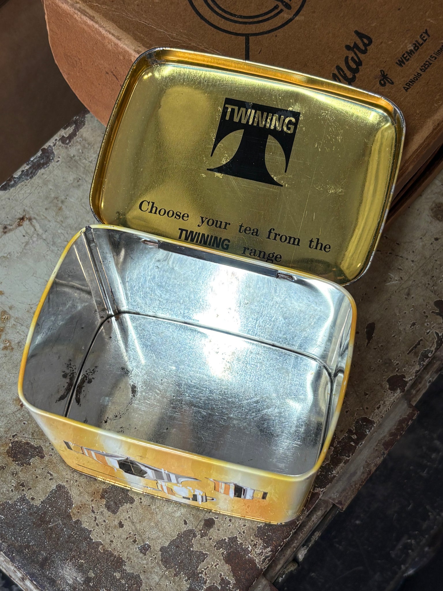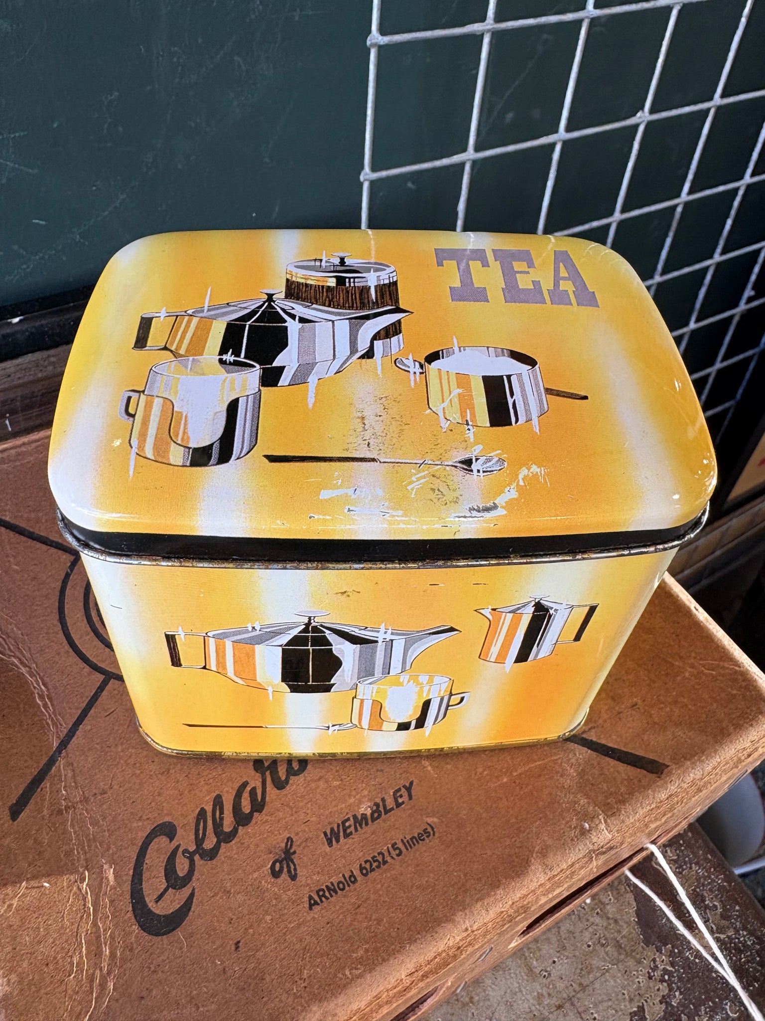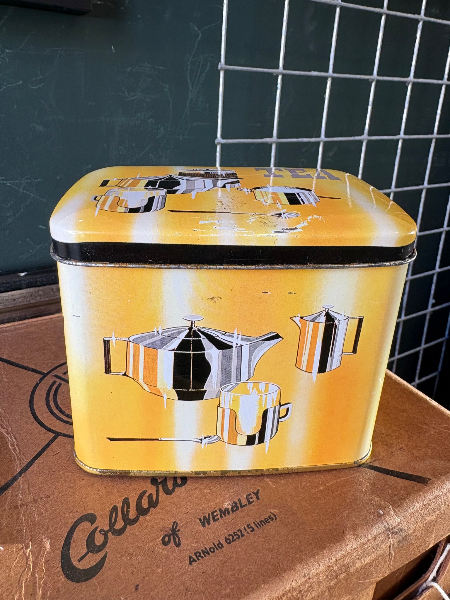 Vintage Twinings Tea Tin – 1950s/60s Yellow Storage Tin with Chrome Tea Set Graphics