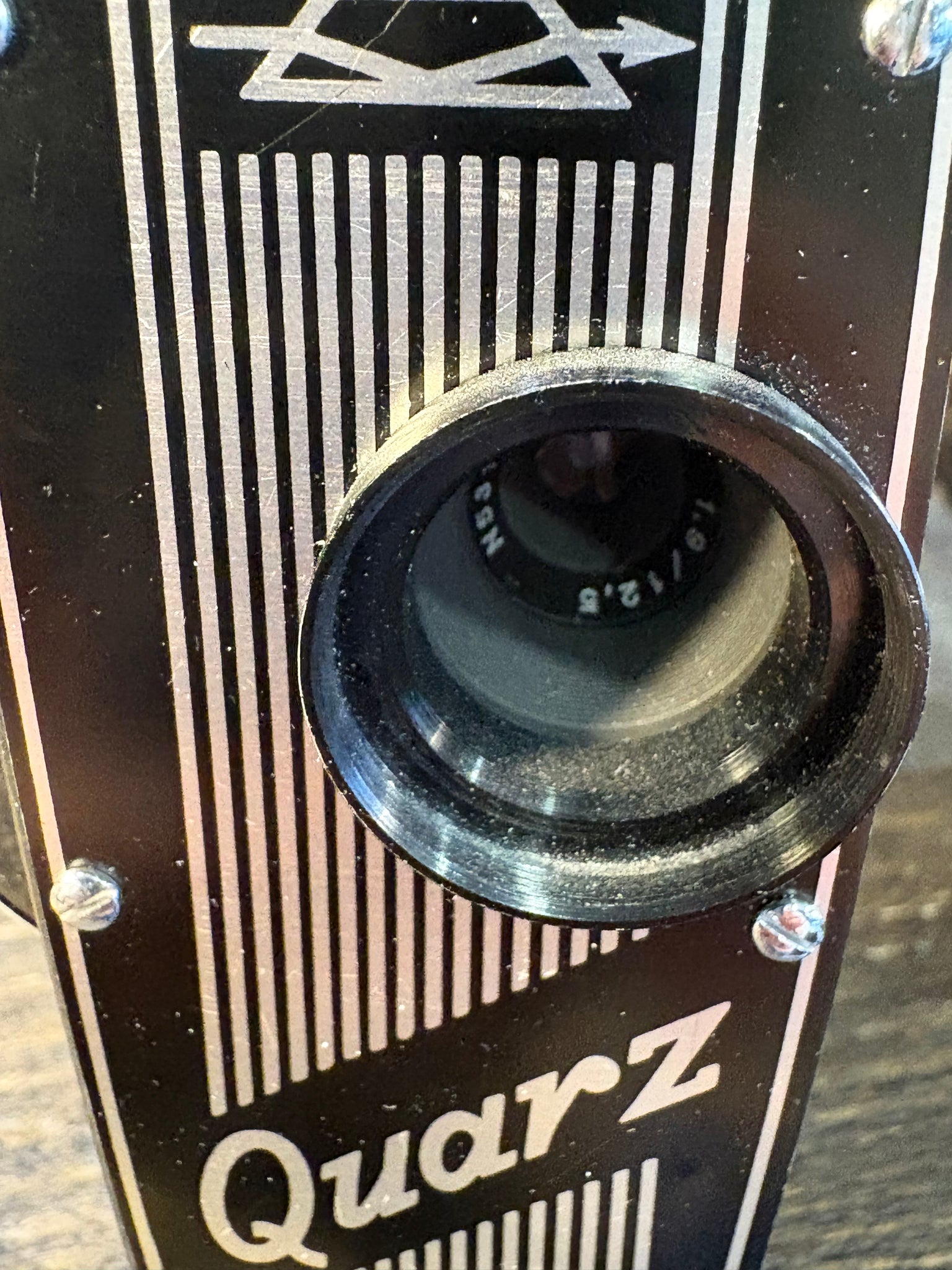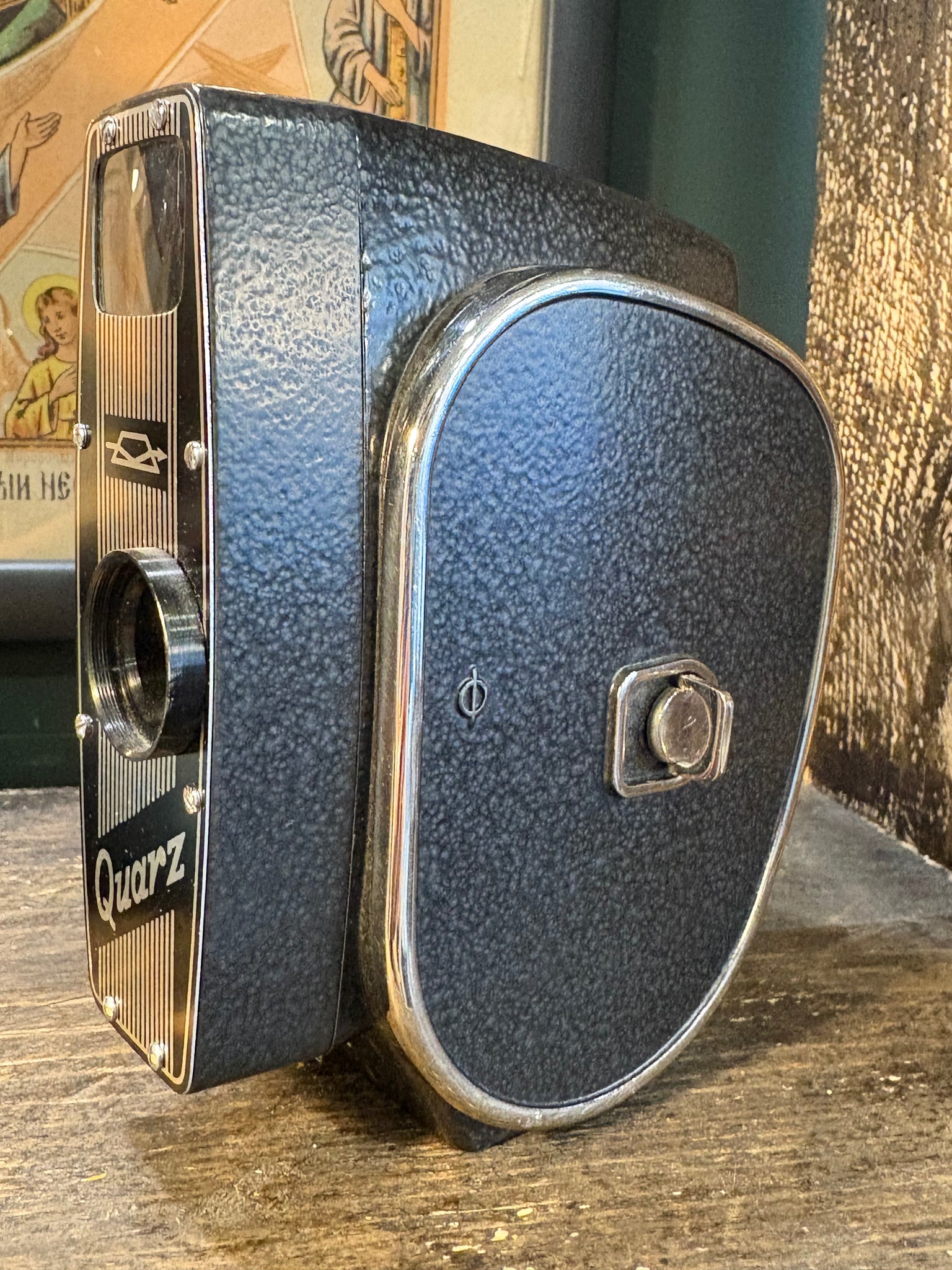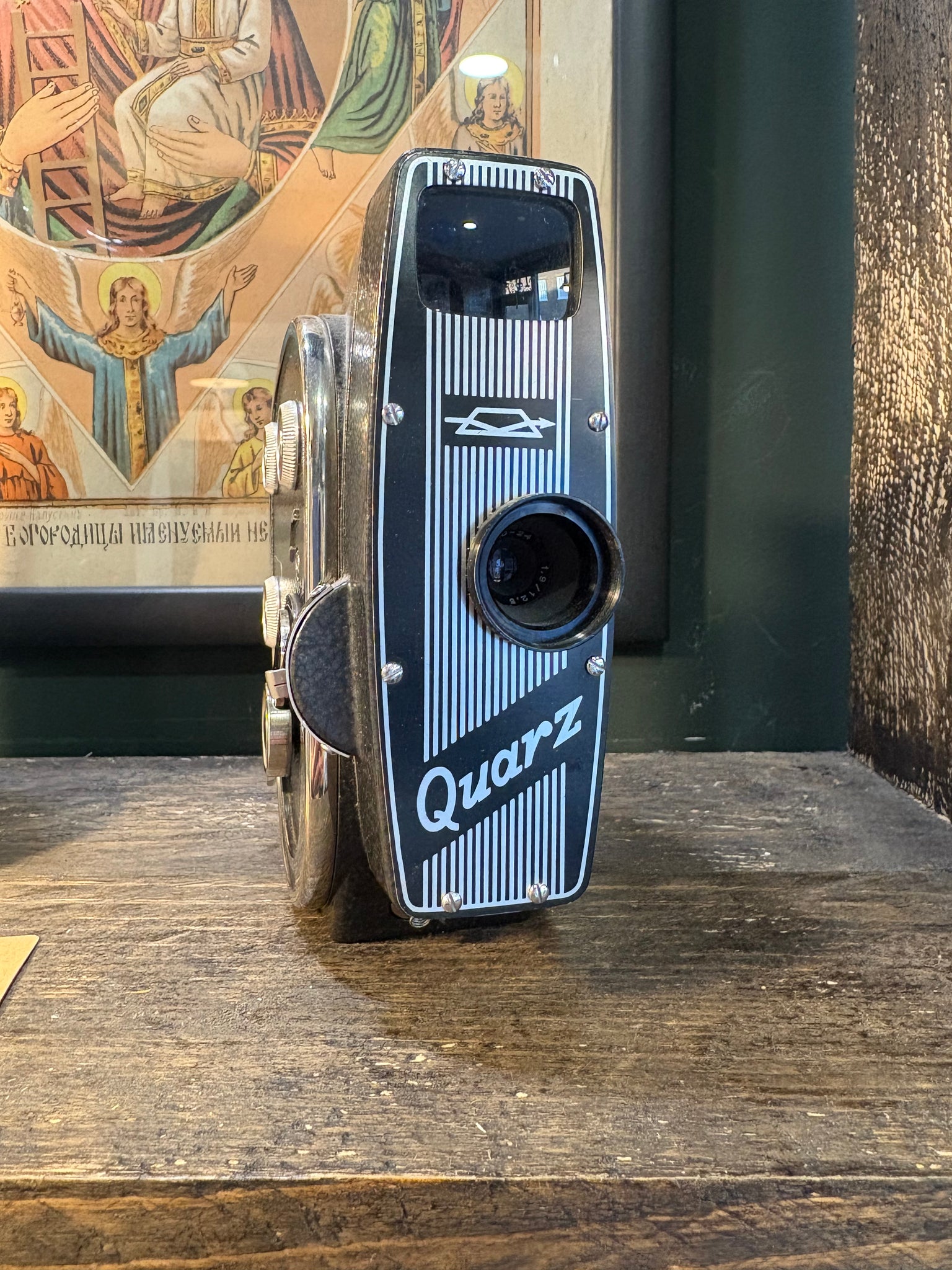 This vintage Quarz 8mm cine camera from the USSR is a striking piece of mid-20th-century design. With its black textured metal body, chrome detailing, and bold striped faceplate, it’s a wonderful example of Soviet craftsmanship — both functional and sculptural.