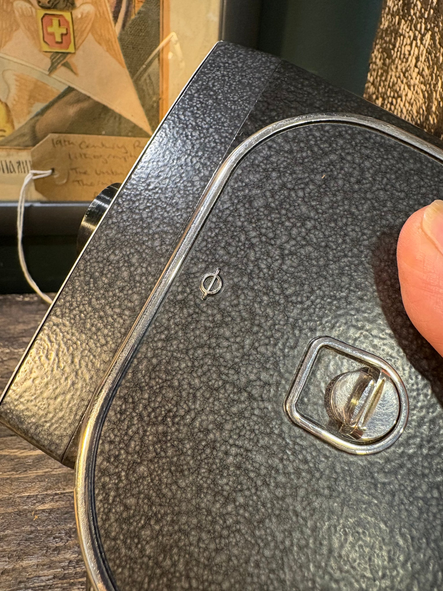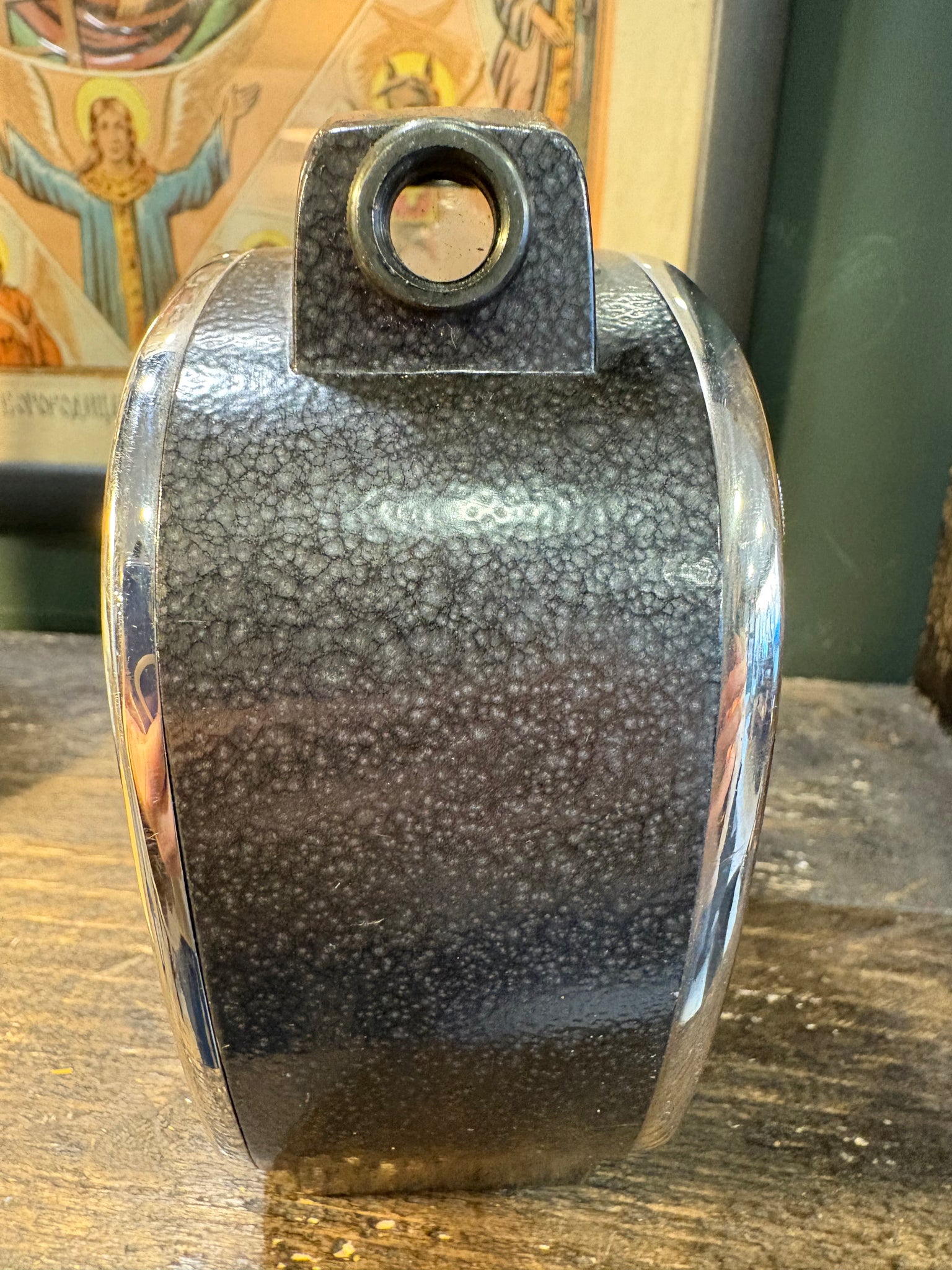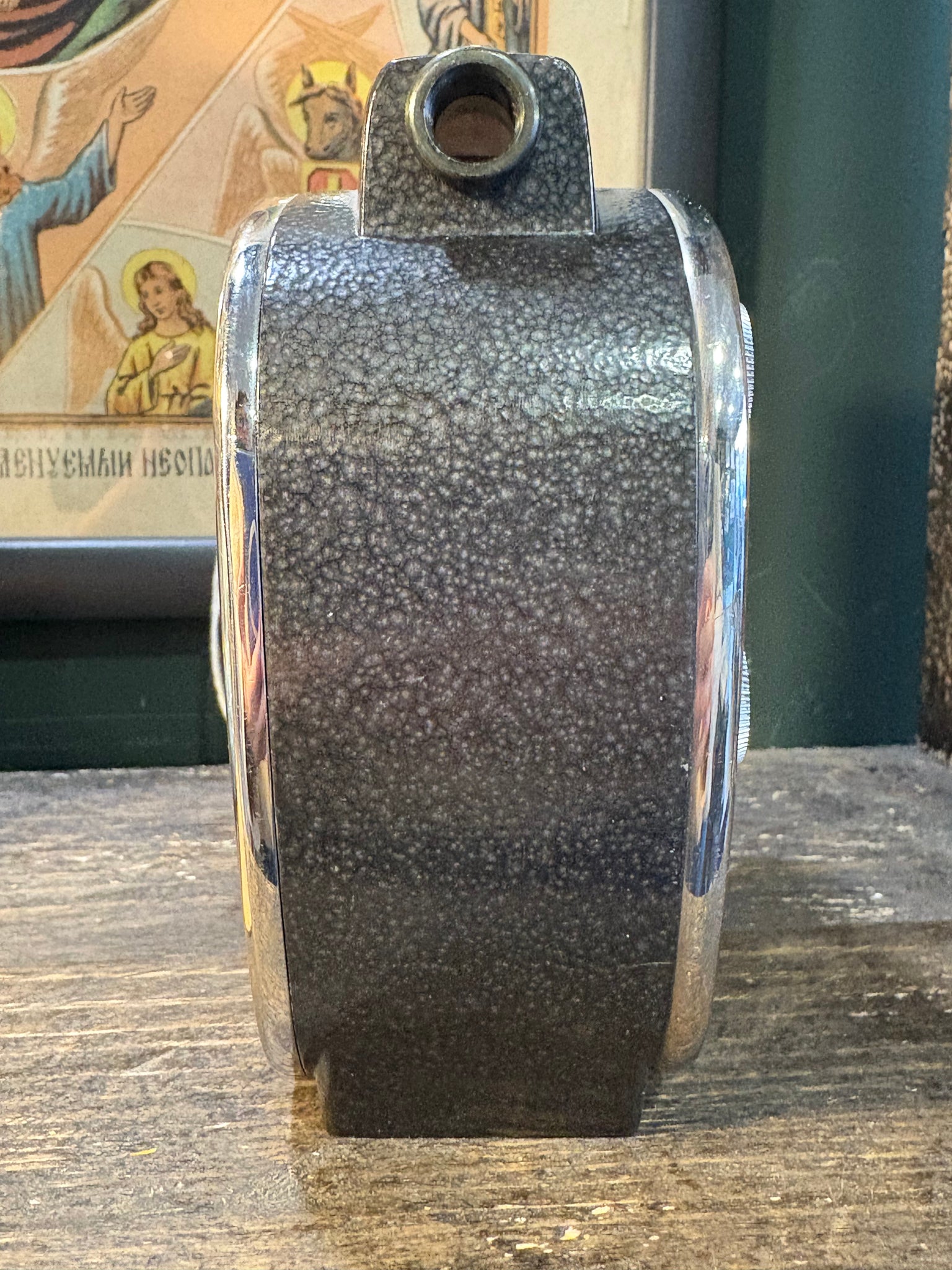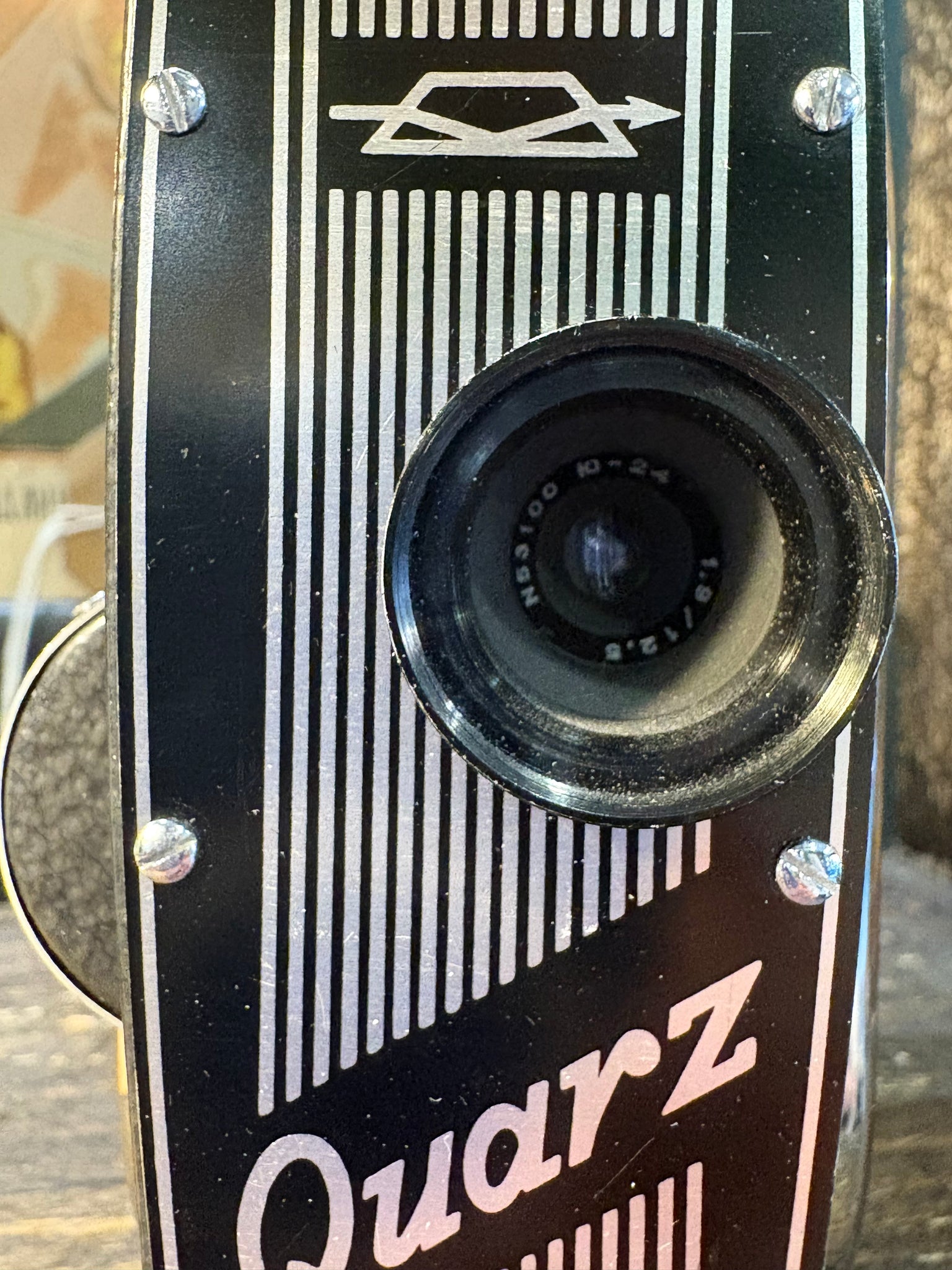 This vintage Quarz 8mm cine camera from the USSR is a striking piece of mid-20th-century design. With its black textured metal body, chrome detailing, and bold striped faceplate, it’s a wonderful example of Soviet craftsmanship — both functional and sculptural.