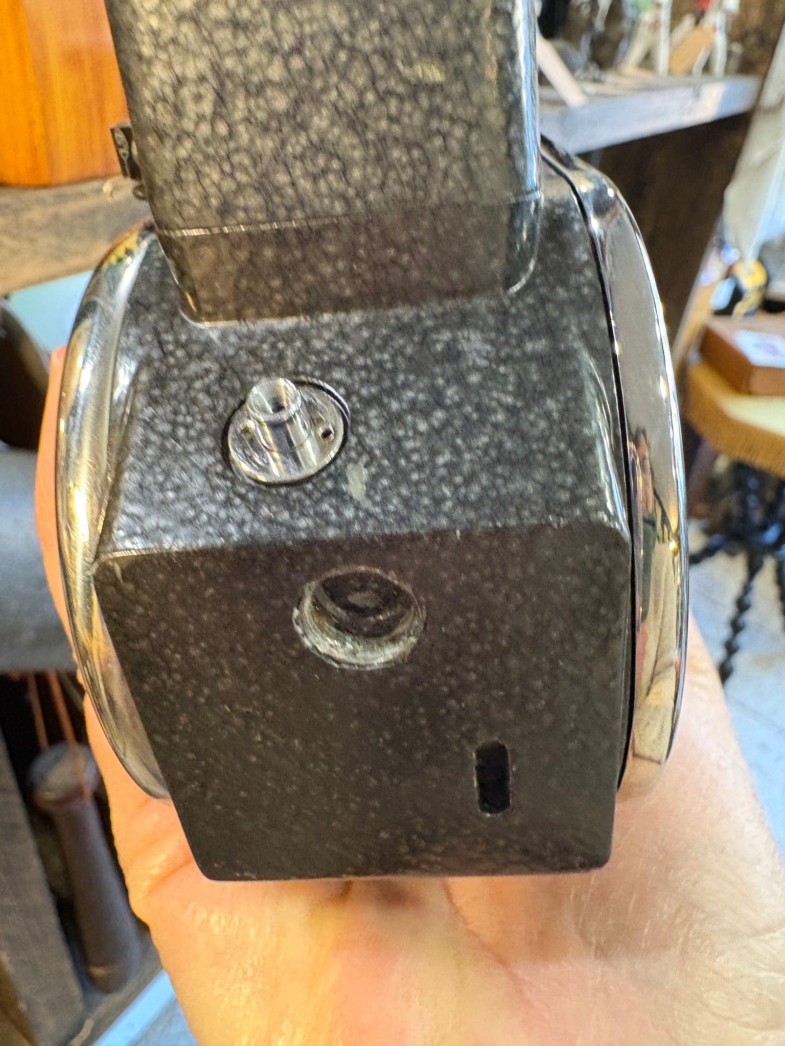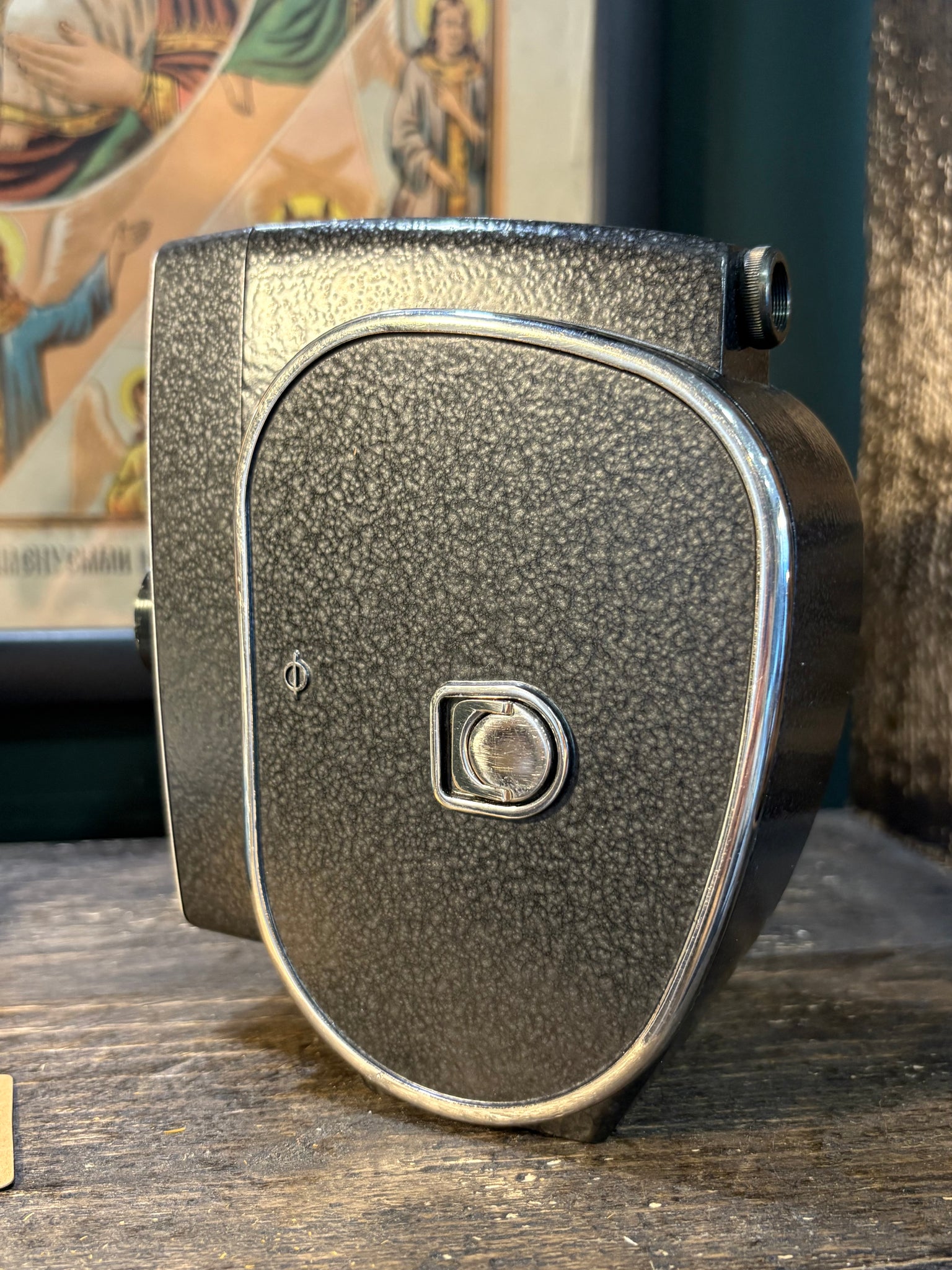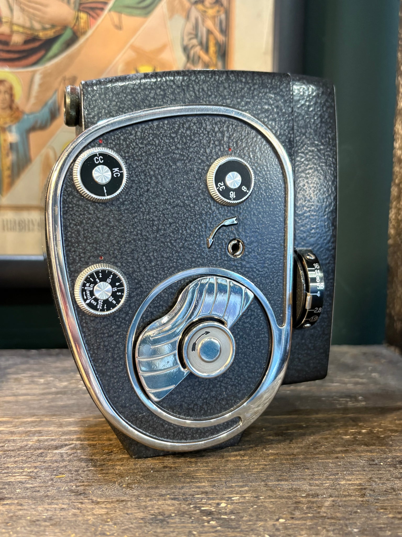 Originally built for amateur filmmakers, this spring-wound movie camera is unrestored and untested, but appears in excellent cosmetic condition. Ideal for display, photography props, or collectors of vintage technology.