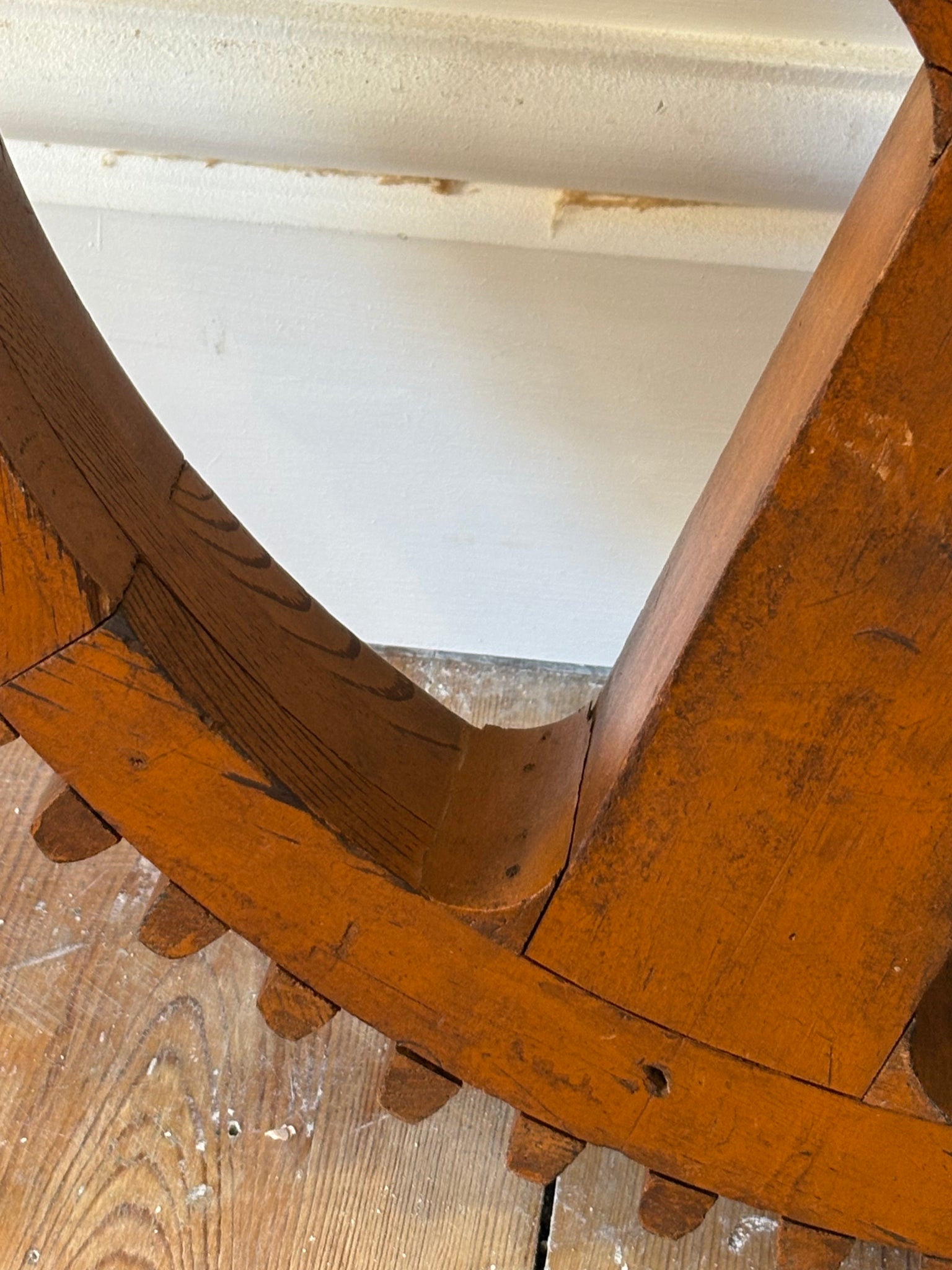 The piece is constructed from solid timber with a segmented circular rim and individually shaped wooden teeth. The interior features a cross-braced structure and central hub, typical of traditional wooden gear or pattern construction.