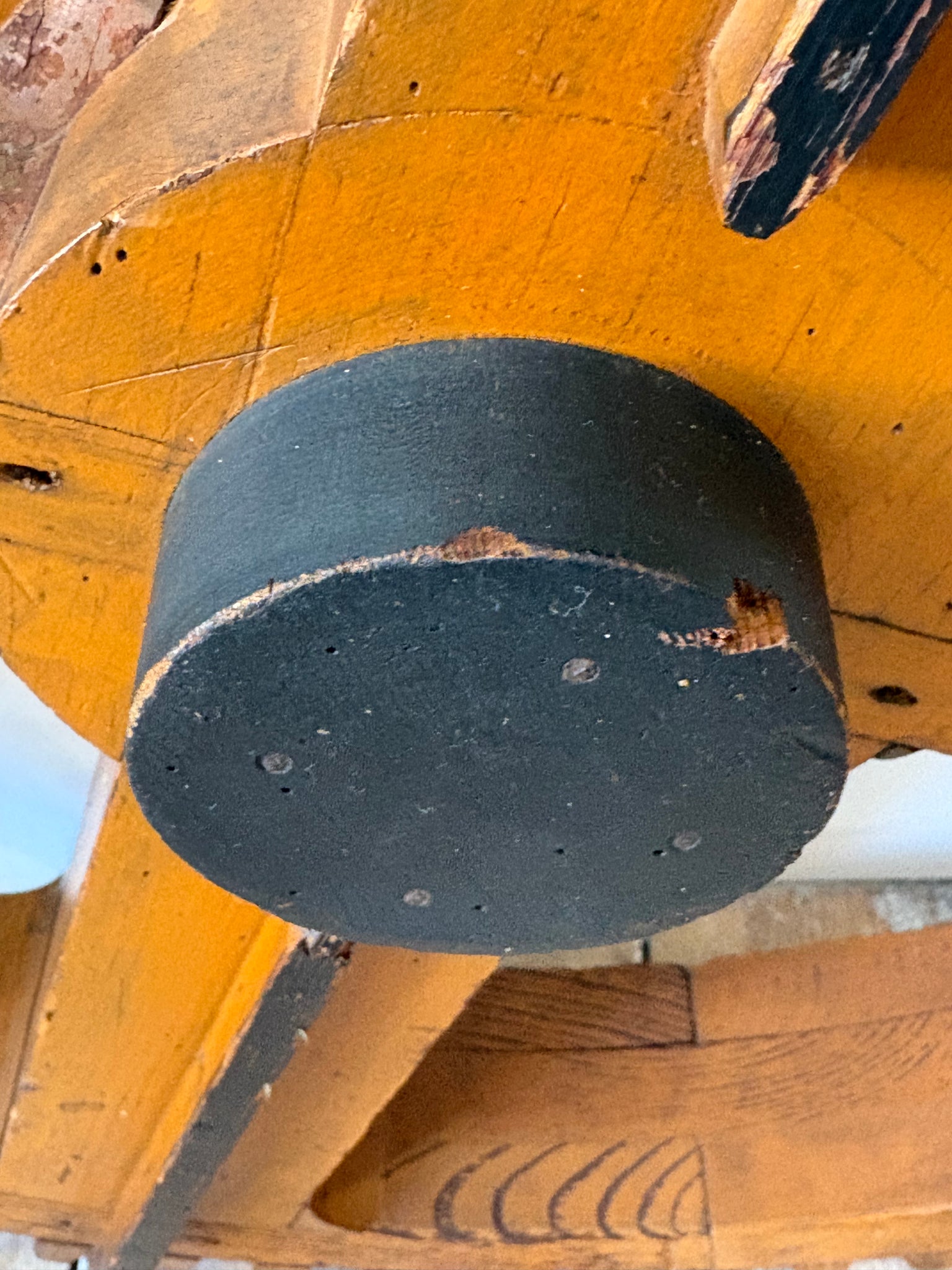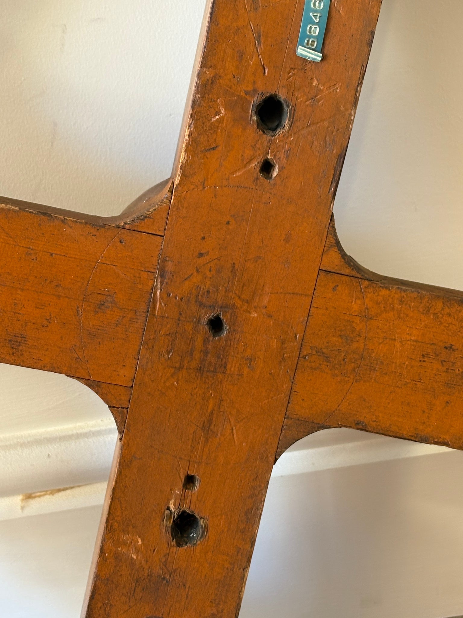 A striking vintage wooden cog wheel form, possibly a pattern used for casting machinery parts or a studio prop.