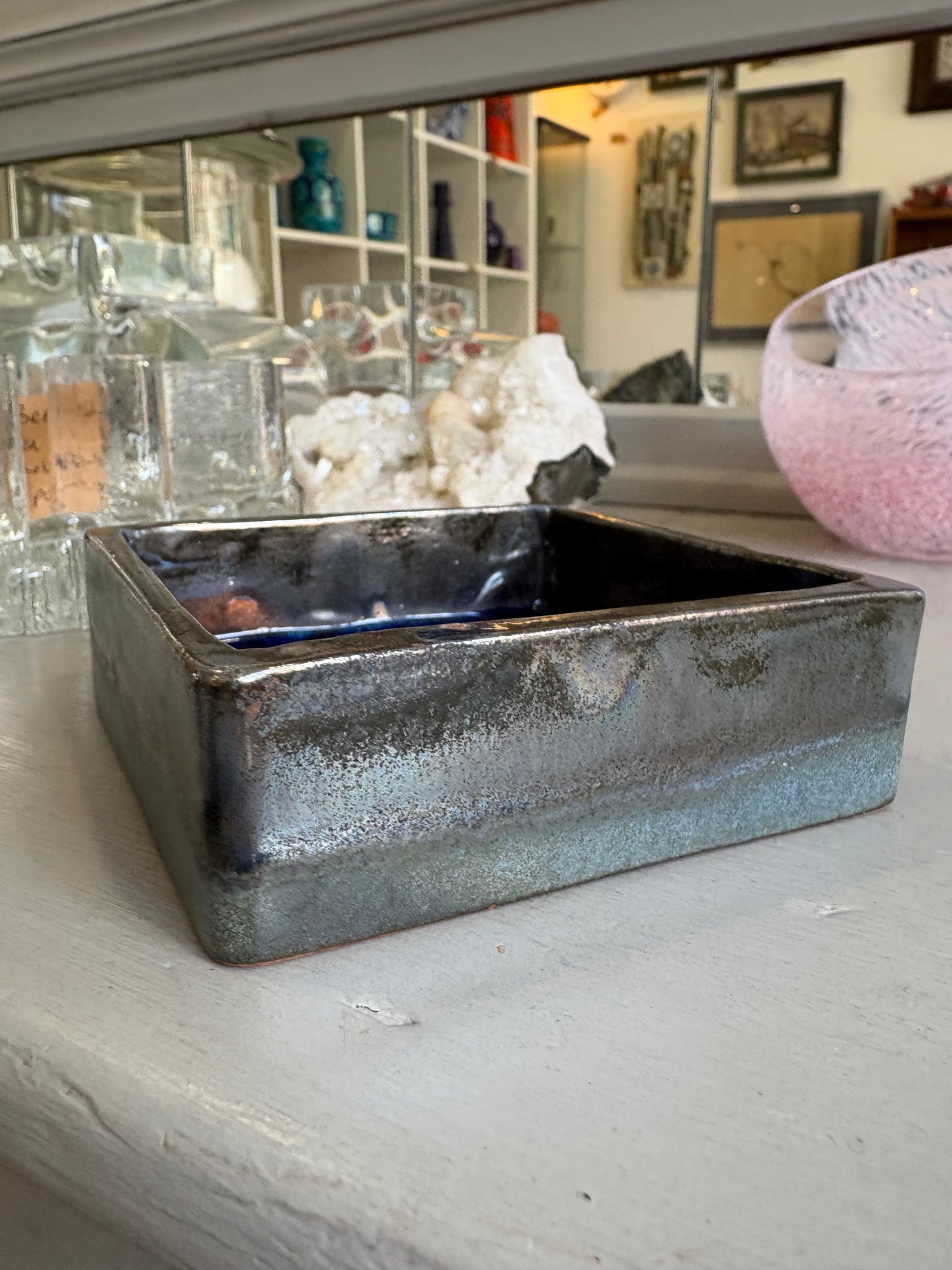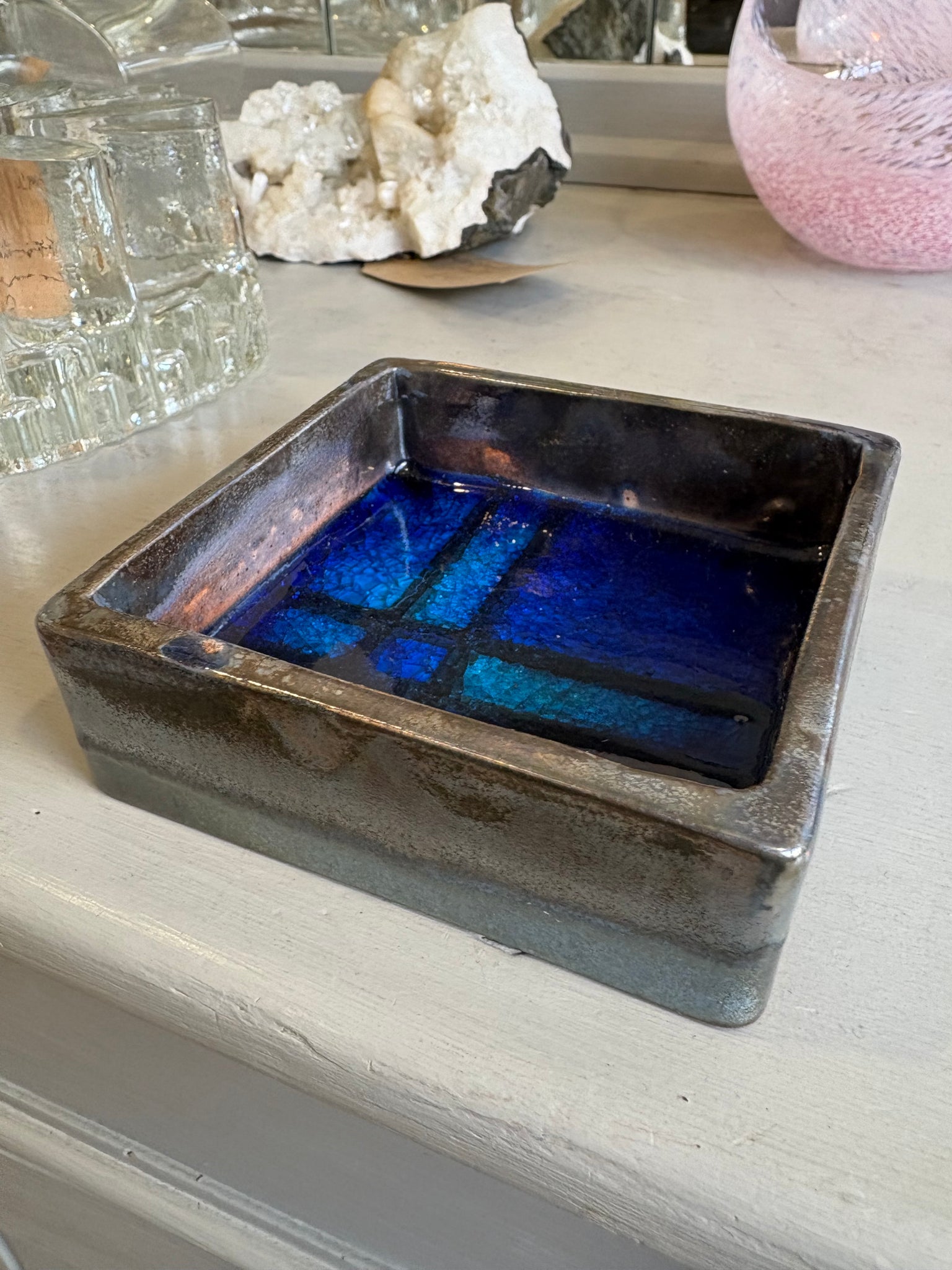 A striking mid century modern square trinket dish, crafted in West Germany and finished in a vivid blue crackle glaze with bold geometric design. The deep cobalt and turquoise tones catch the light beautifully, making it as much a decorative statement as it is practical.